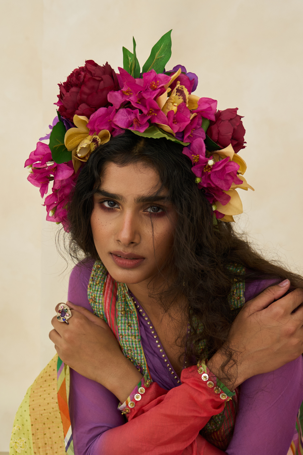 Her Chanderi carries its signature translucence and soft sheen, but with a subtlety that feels almost ethereal — printed slowly, consciously, through hand block printing that heightens the fabric's inherent delicacy.