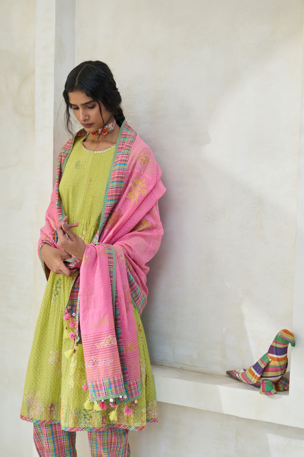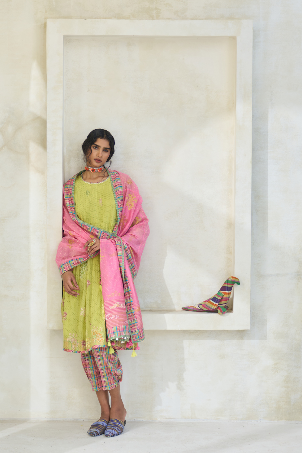 What sets Swatti Kapoor apart is the way she treats textiles as living beings — each with its own temperament, rhythm, and voice. Her garments don’t impose; they evolve. They drape the way water slips over stone. They hold the kind of ease that comes only from deep respect for material and maker.
