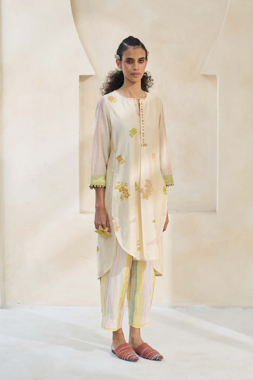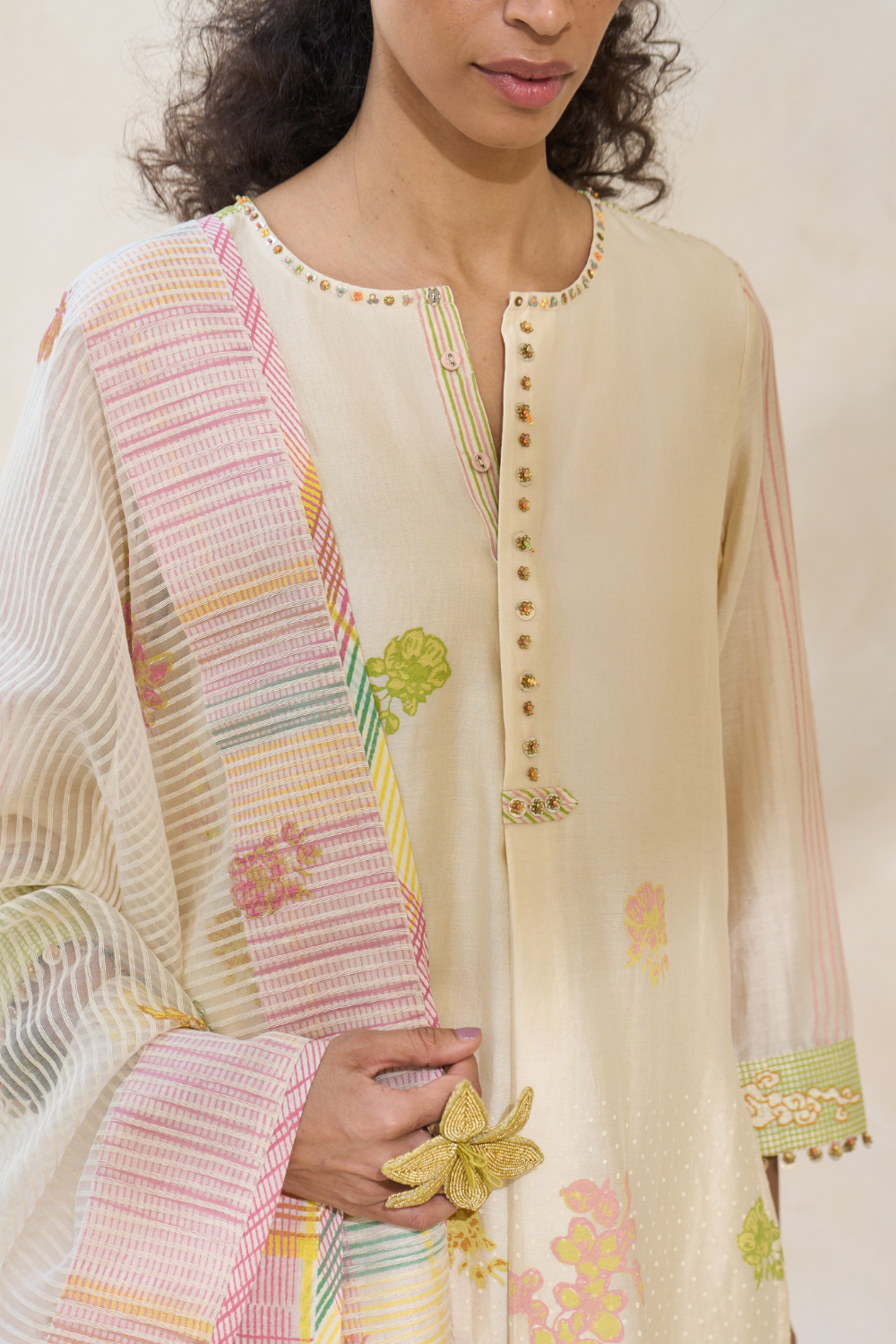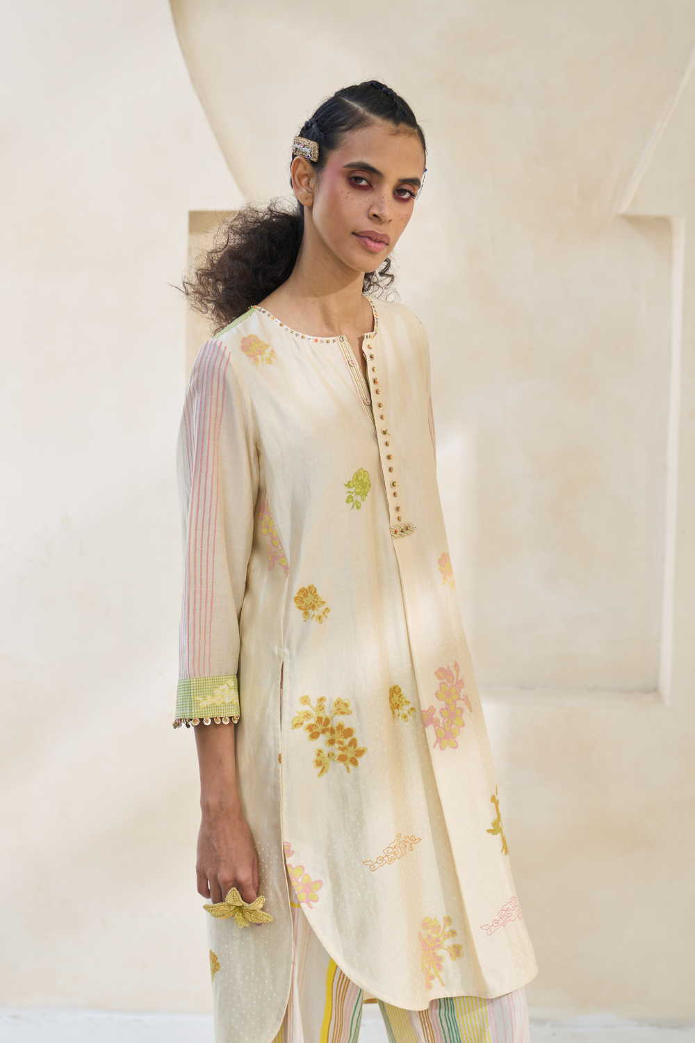 High-low kurta hand block print embellished with hand-done beading, in handwoven 60 gm Chanderi with 100% cotton lining.