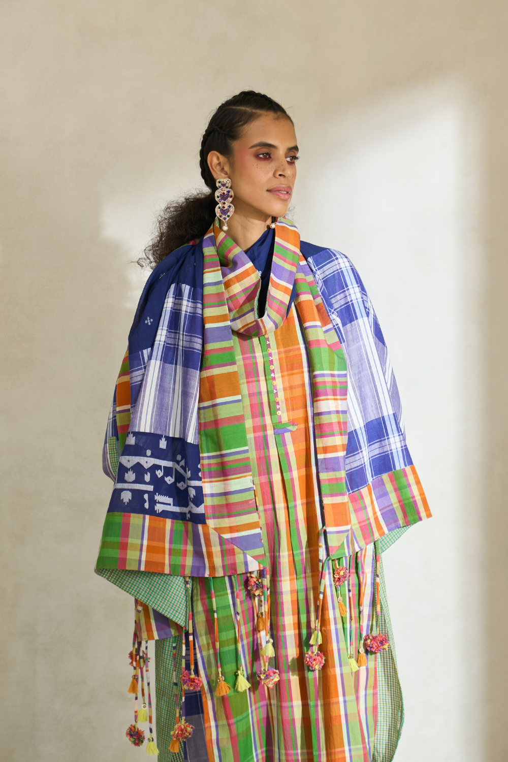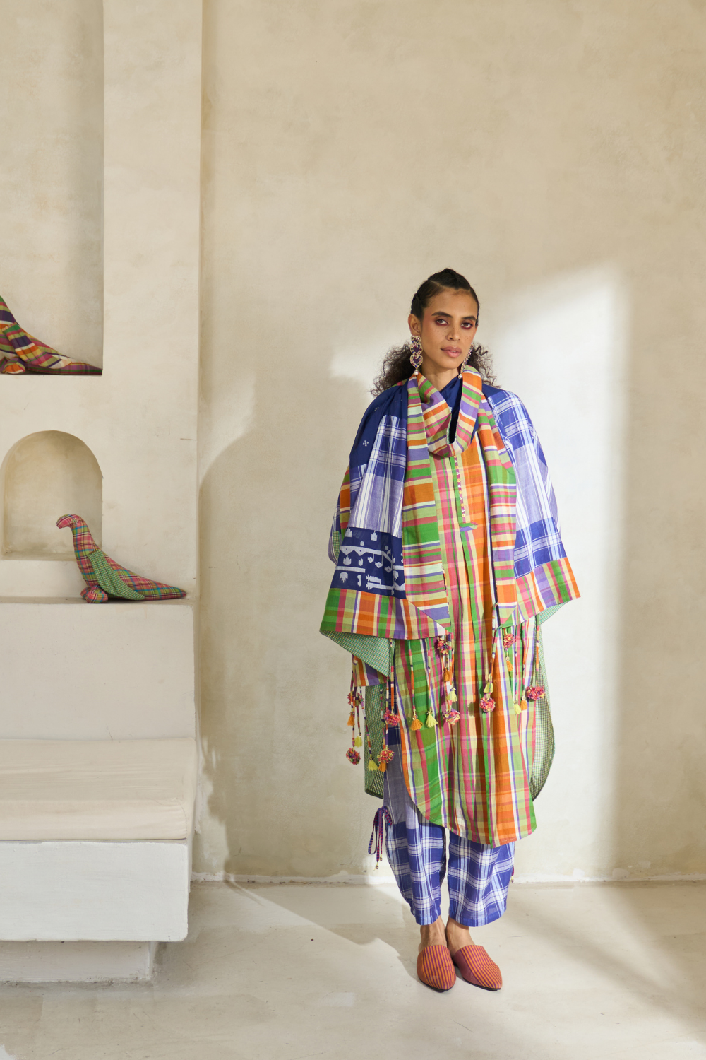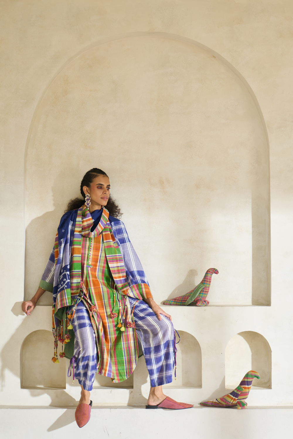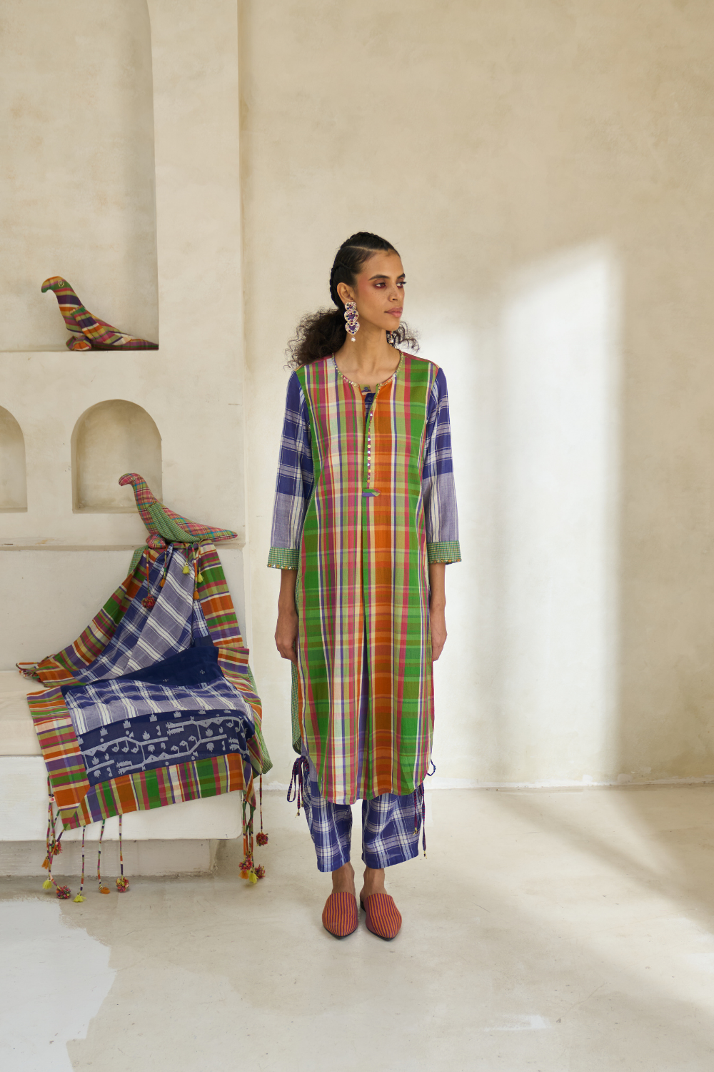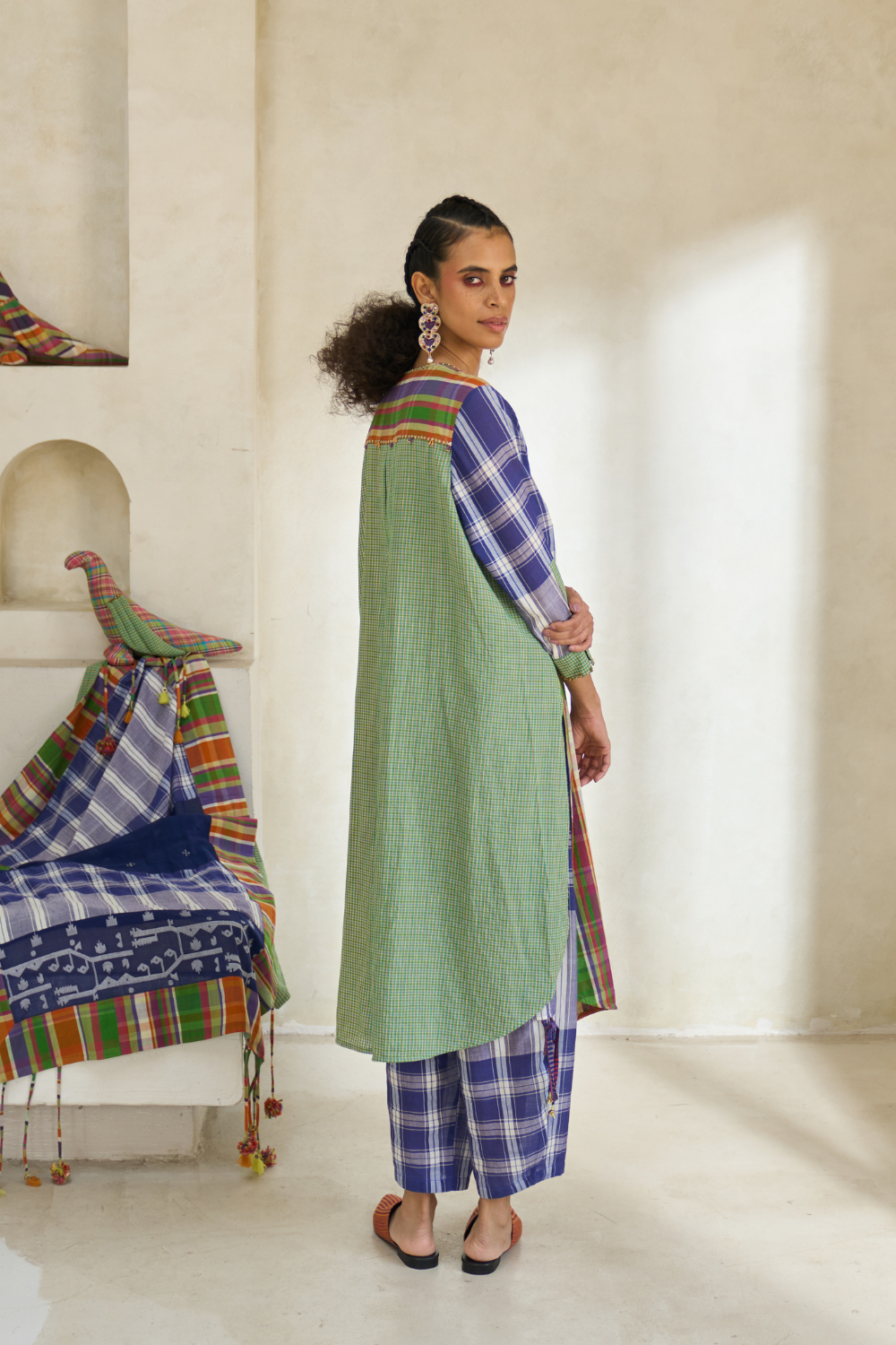 Patchwork kurta with hand-done details in handwoven yarn-dyed Bengal 100% cotton check.