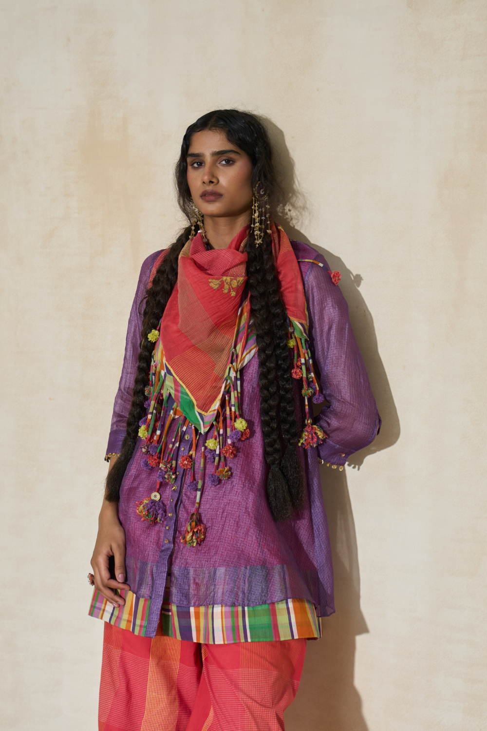Front-open tunic in handwoven Kota silk with a 100% cotton inner layer, finished with a multicolour handwoven check border, hand-done beadwork, and a printed back yoke.