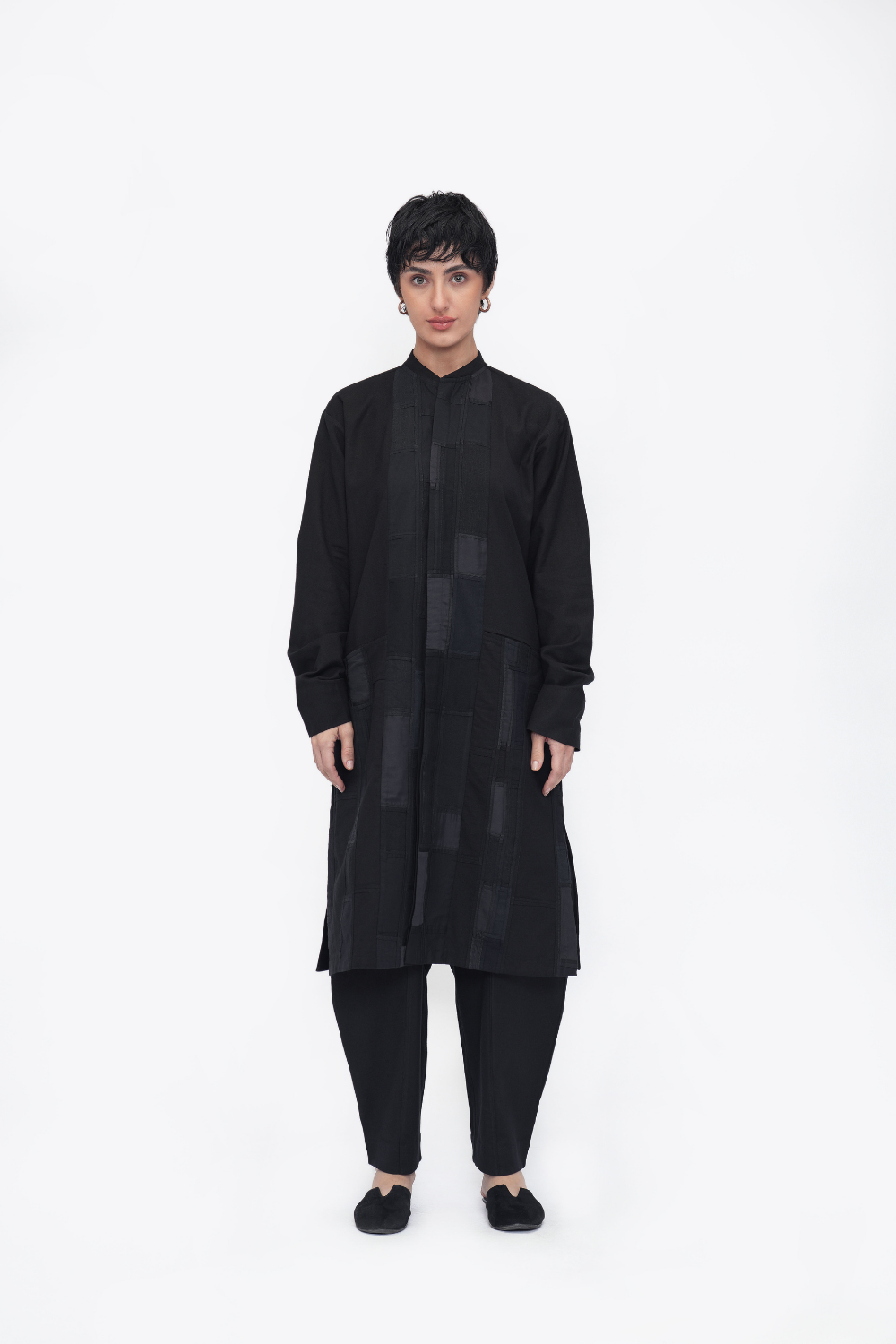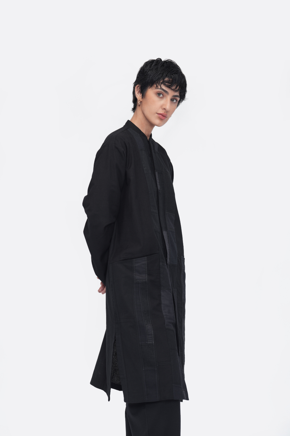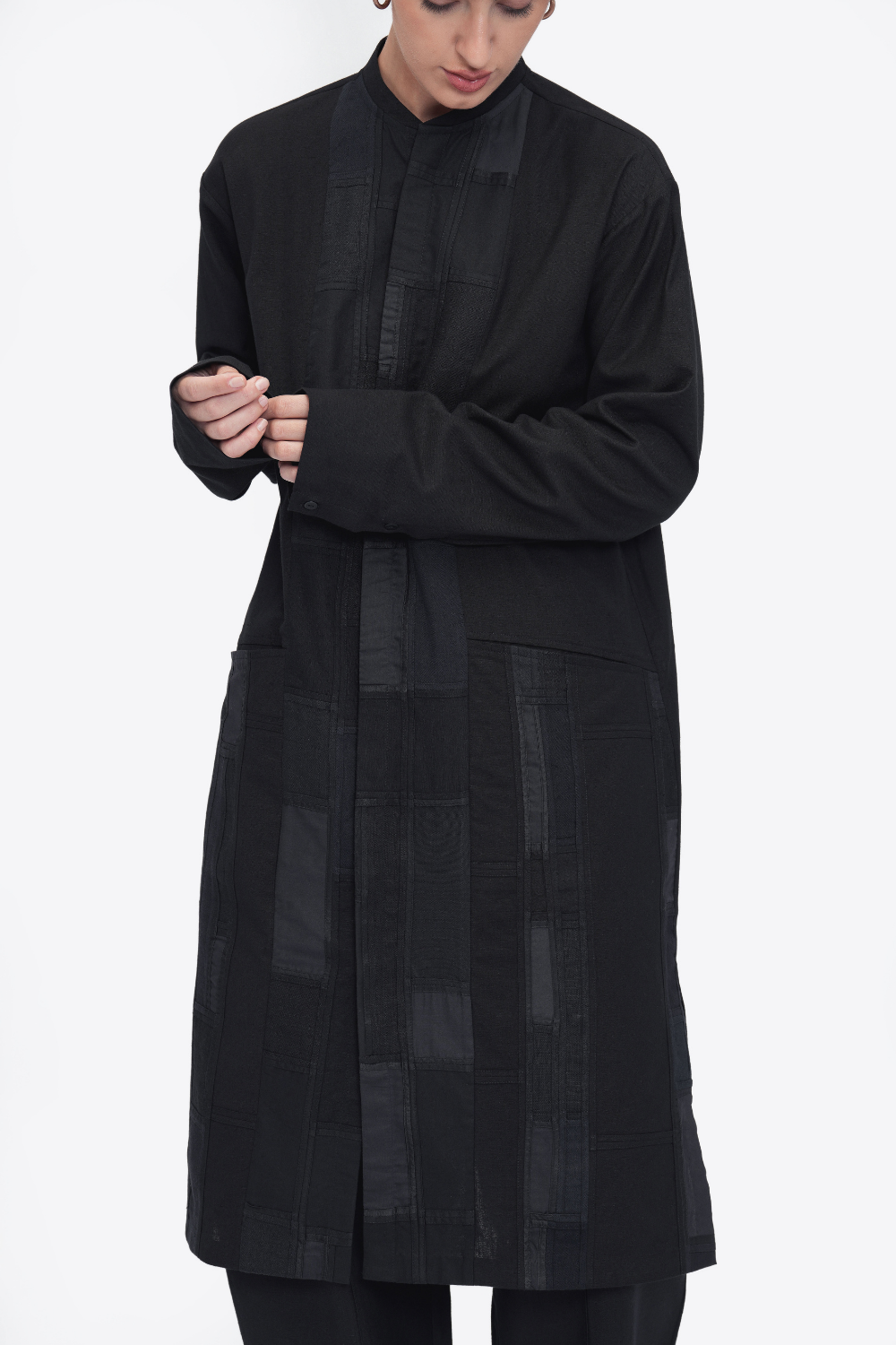A unisex oversized tunic crafted in patchwork fabric from reclaimed textile scraps. Finished with side seam pockets, side slits, and a mid-calf length. Made in a patchwork of cotton flex, Mashru silk, linen, cotton twill, and handloom cotton.