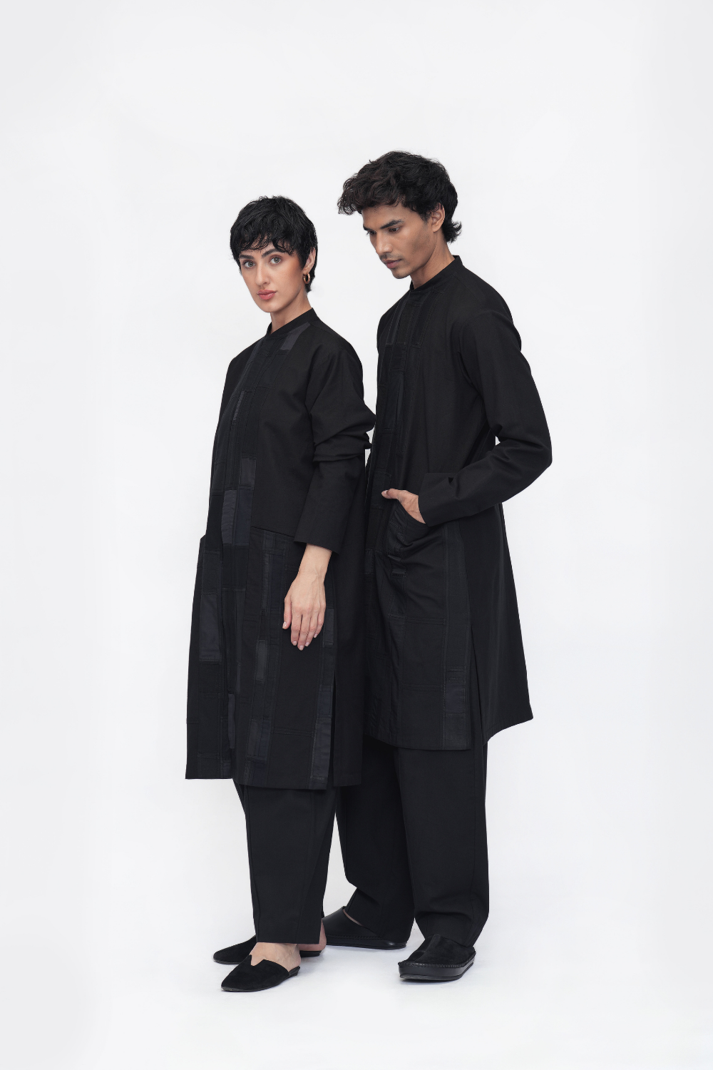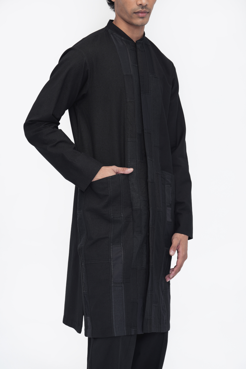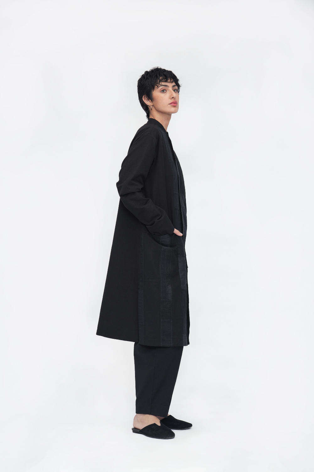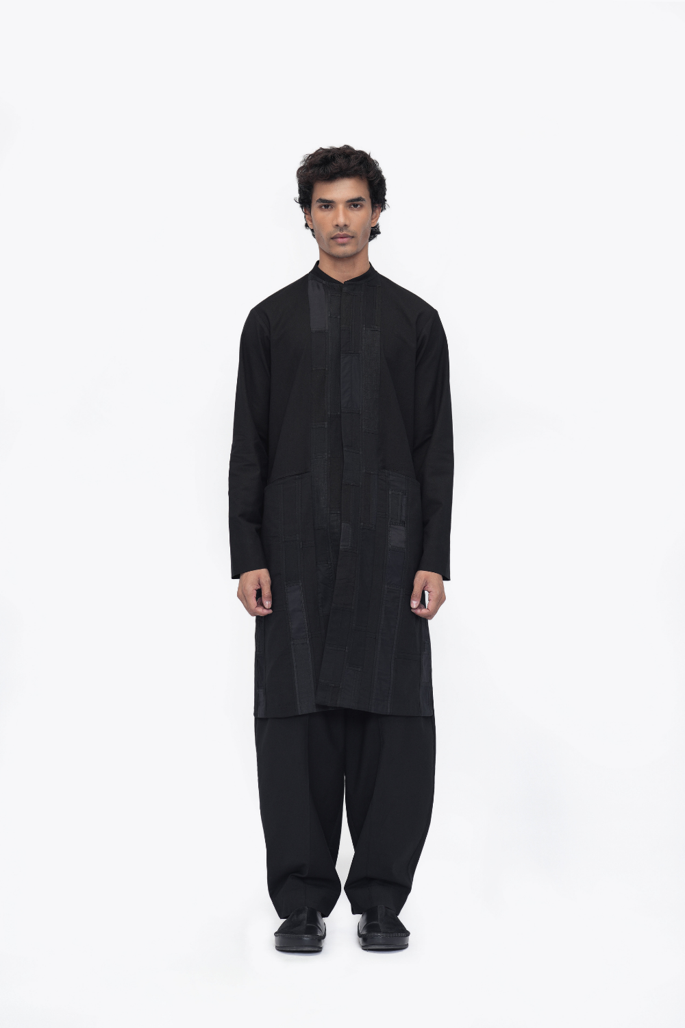A unisex oversized tunic crafted in patchwork fabric from reclaimed textile scraps. Finished with side seam pockets, side slits, and a mid-calf length. Made in a patchwork of cotton flex, Mashru silk, linen, cotton twill, and handloom cotton.