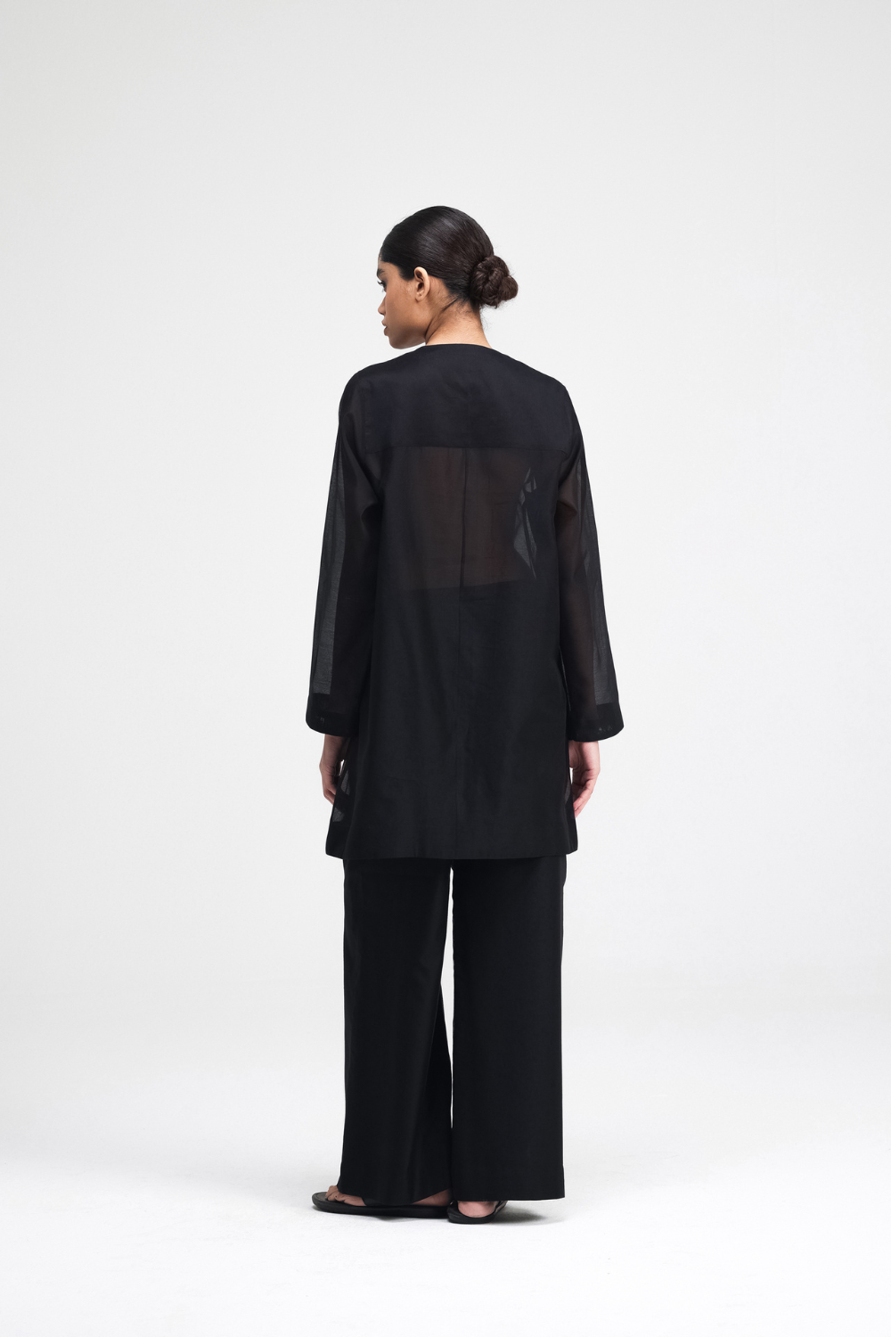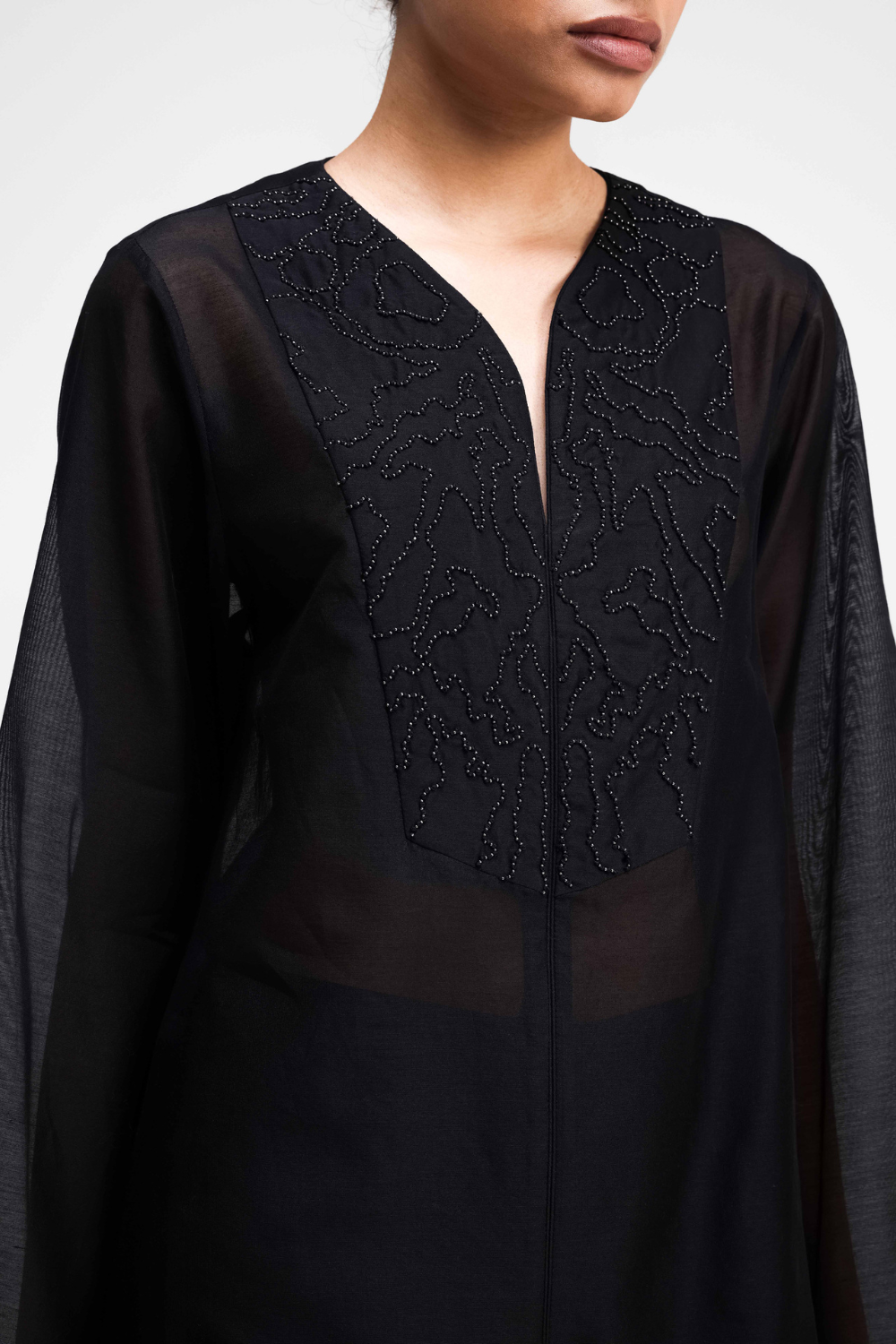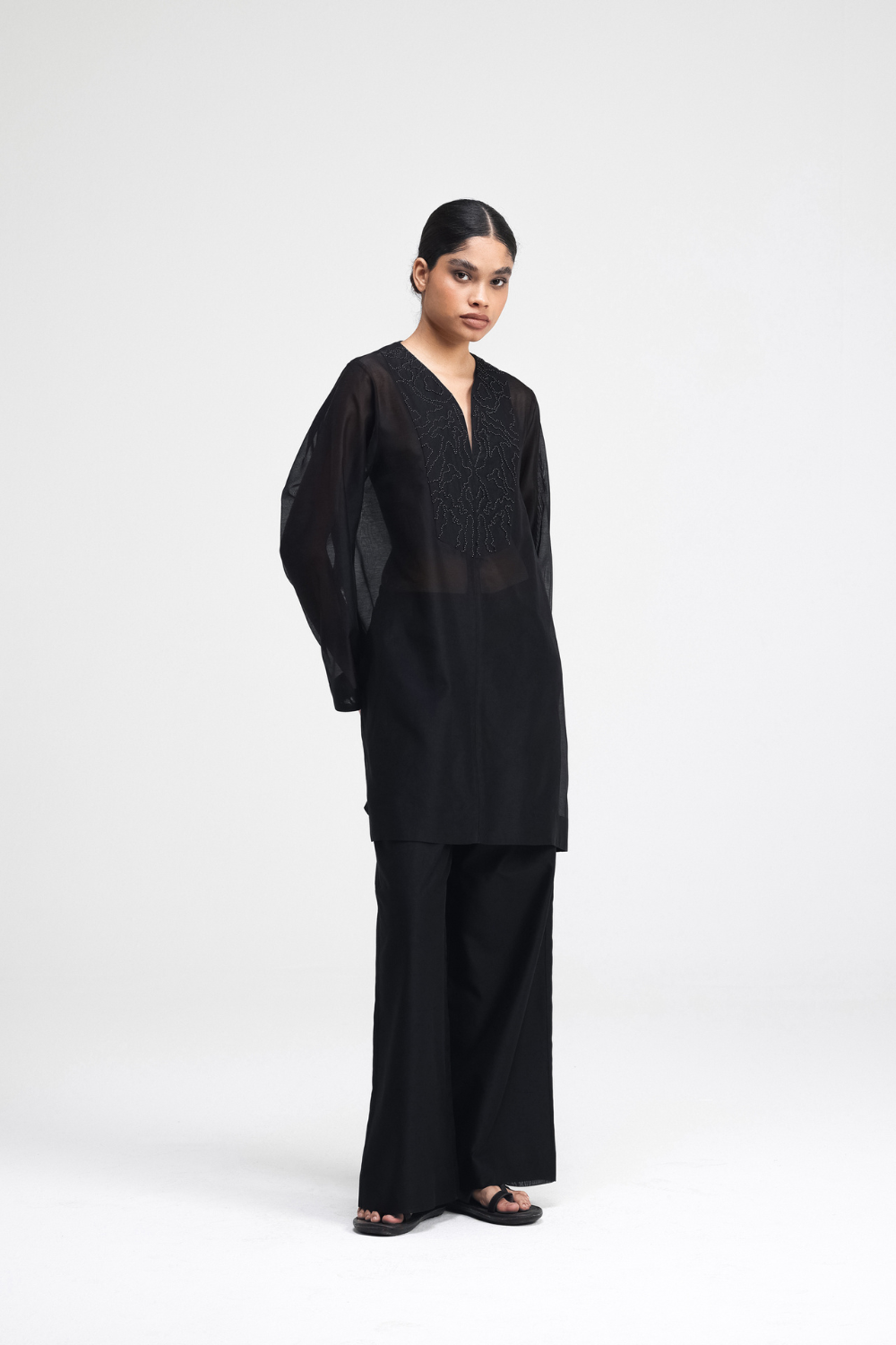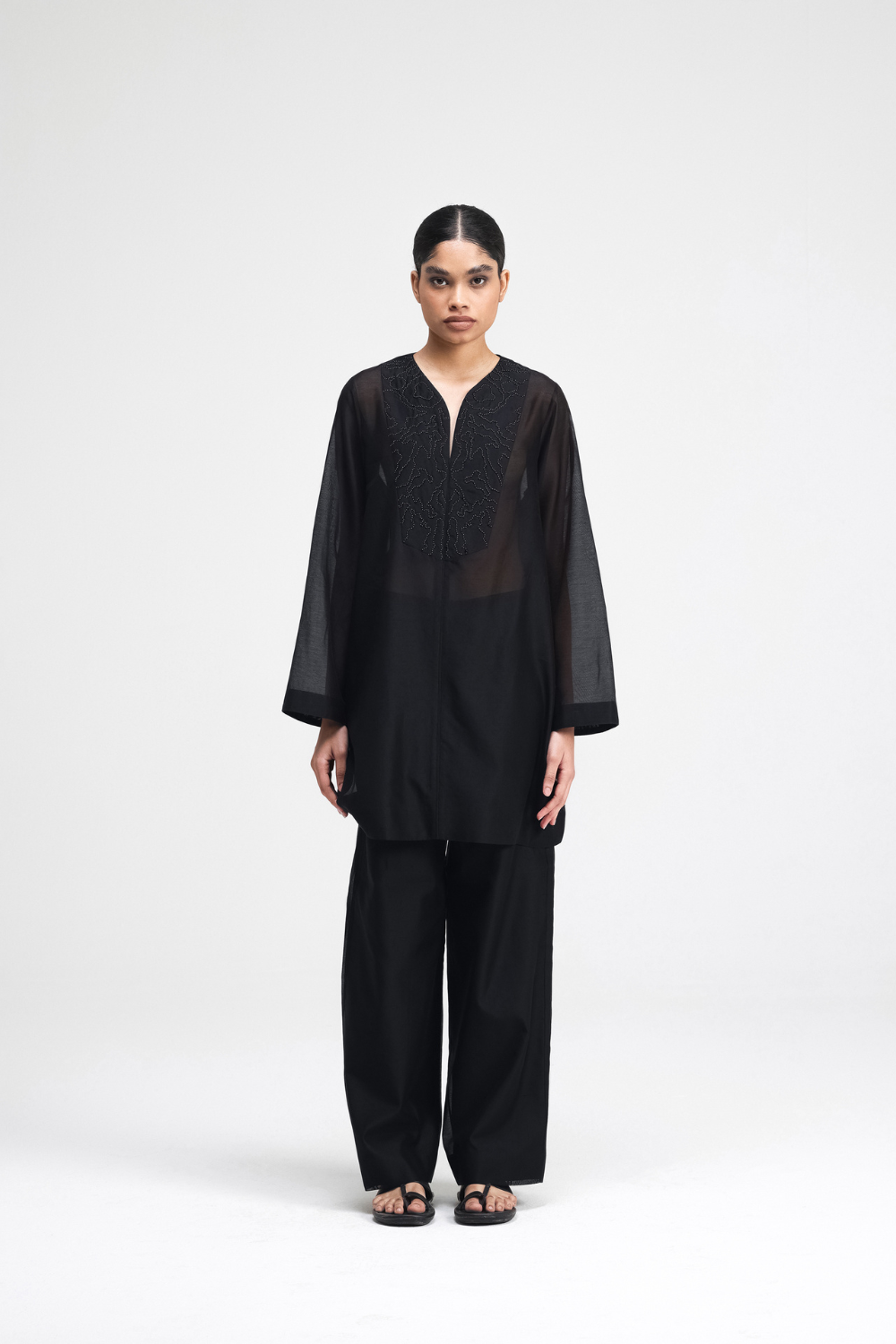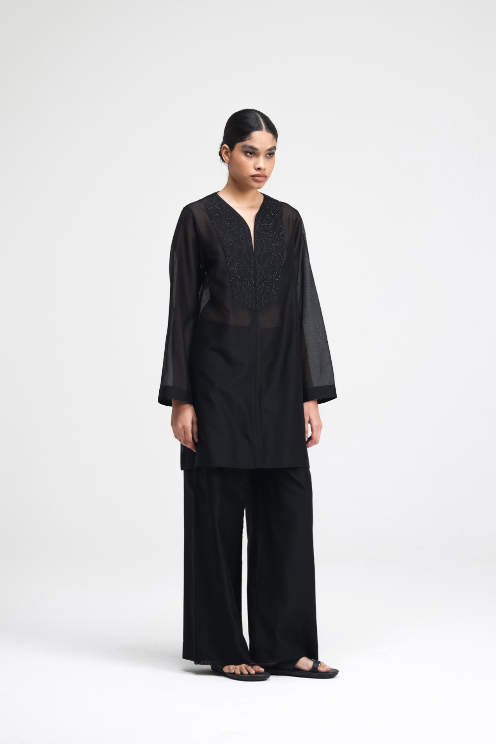 The Jun hand-embroidered kurta features a stylised V-neckline with intricate embroidery. Crafted in delicate Chanderi fabric, it is ideal for any special occasion.