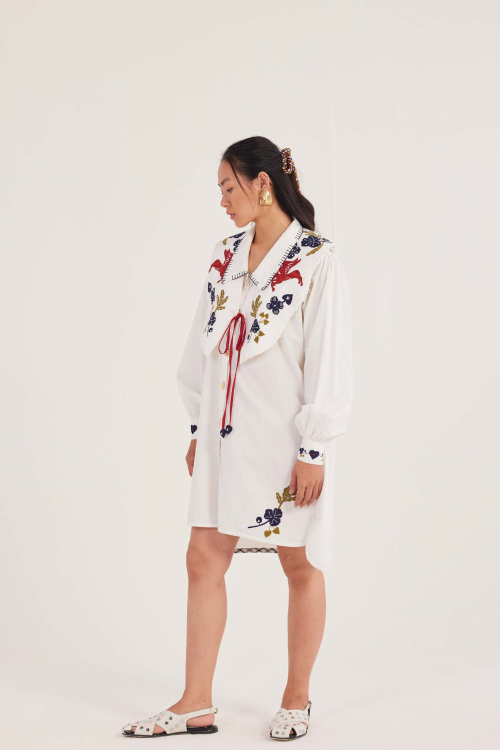 Our Kiji shirt dress is relaxed enough for vacation dressing but casual enough to do, well, anything else. It features an asymmetrical hemline with an under hem detail, charming detailed embroidery on the back, hem and cuff. Handmade kaaj detail. This collar bib is crafted in soft cotton with playful appliqué detailing.