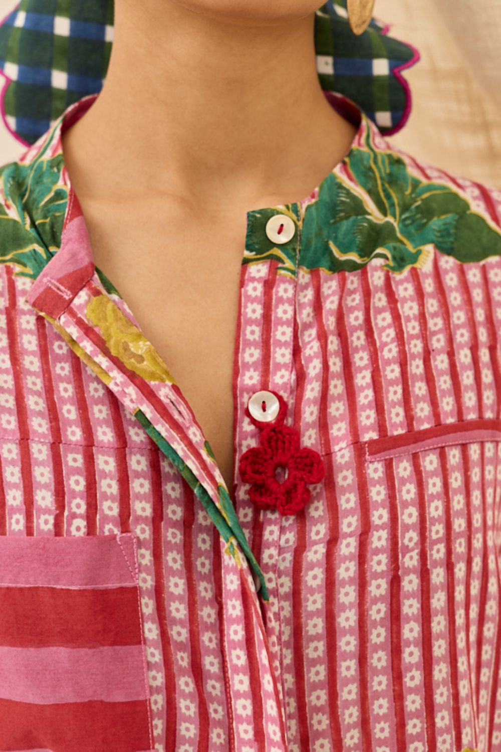 A versatile, longline kurta set with a front button placket and three-quarter sleeves, utilizing the primary pink striped hand-block print. Designed to be worn open as a jacket or closed as a tunic, it pairs here with contrasting red trousers for a cohesive, festive set.