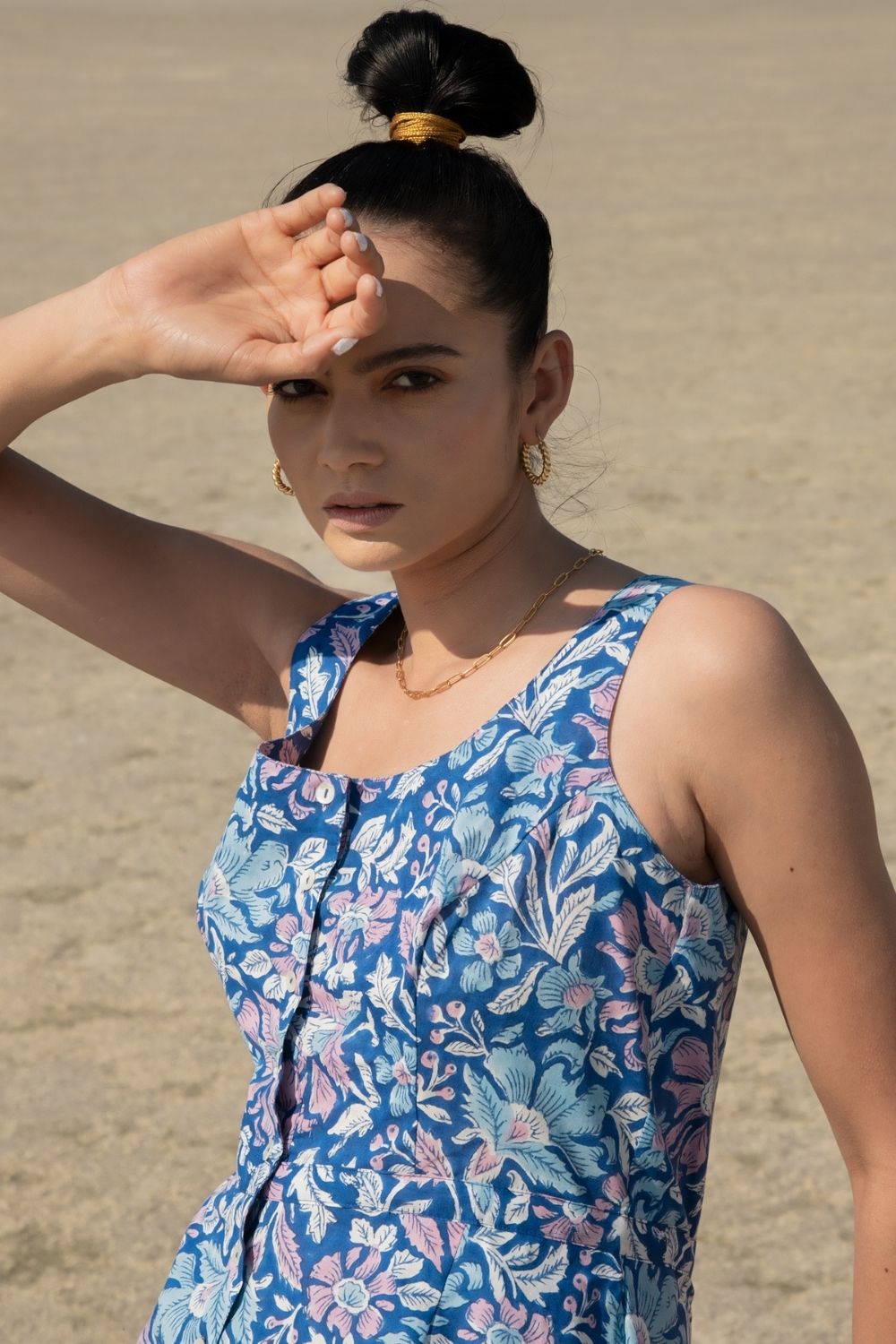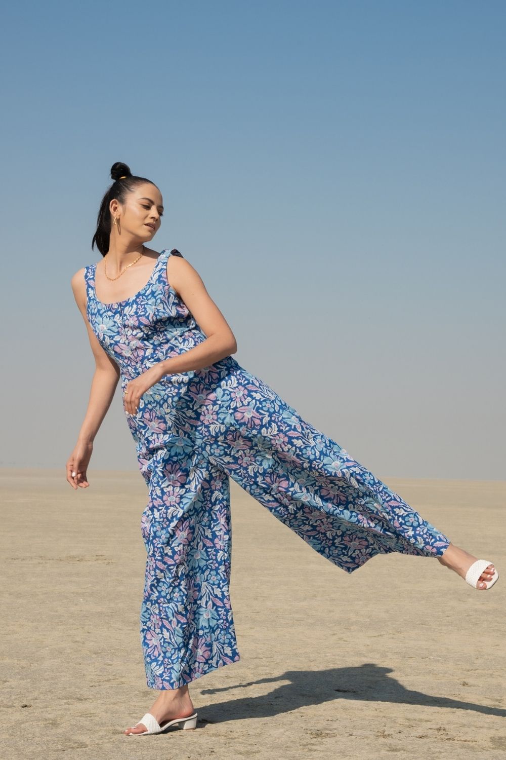 Jumpsuits are perfect for the day you don't know what to wear. This simplistic sleeveless jumpsuit handblock printed in blue on a soft cotton base is apt for summer afternoons.