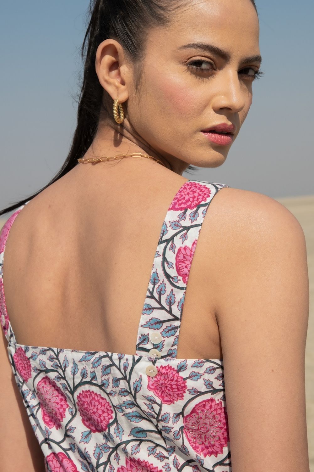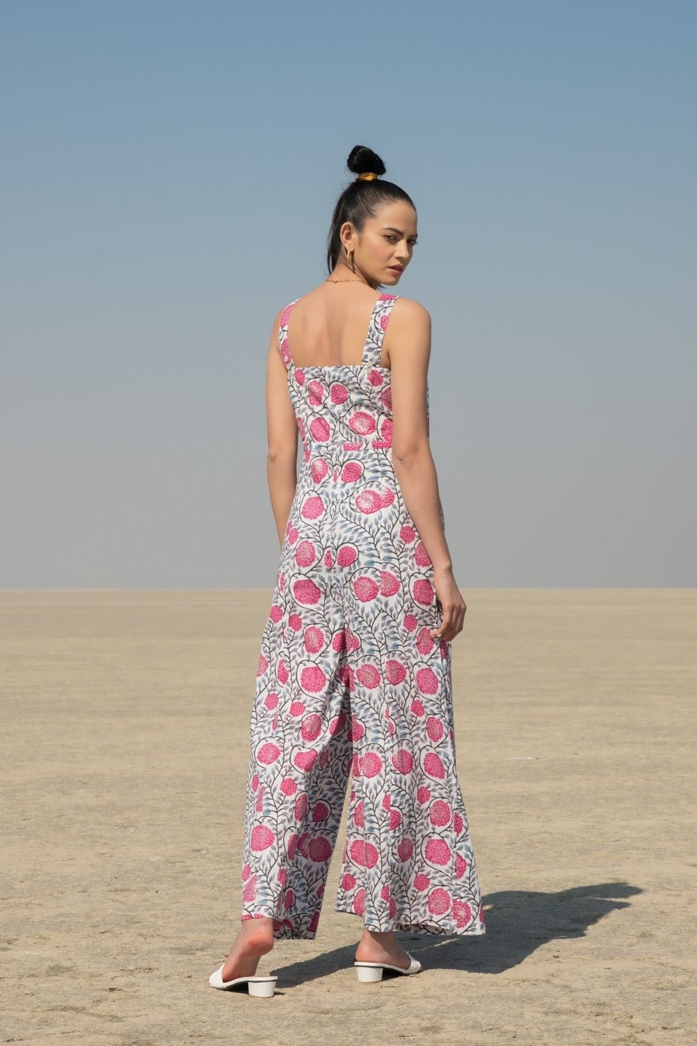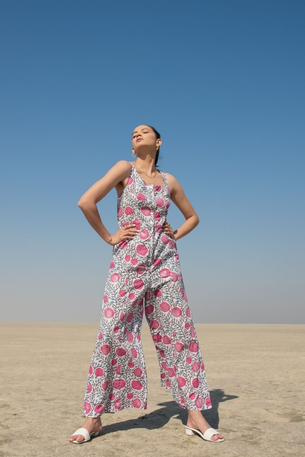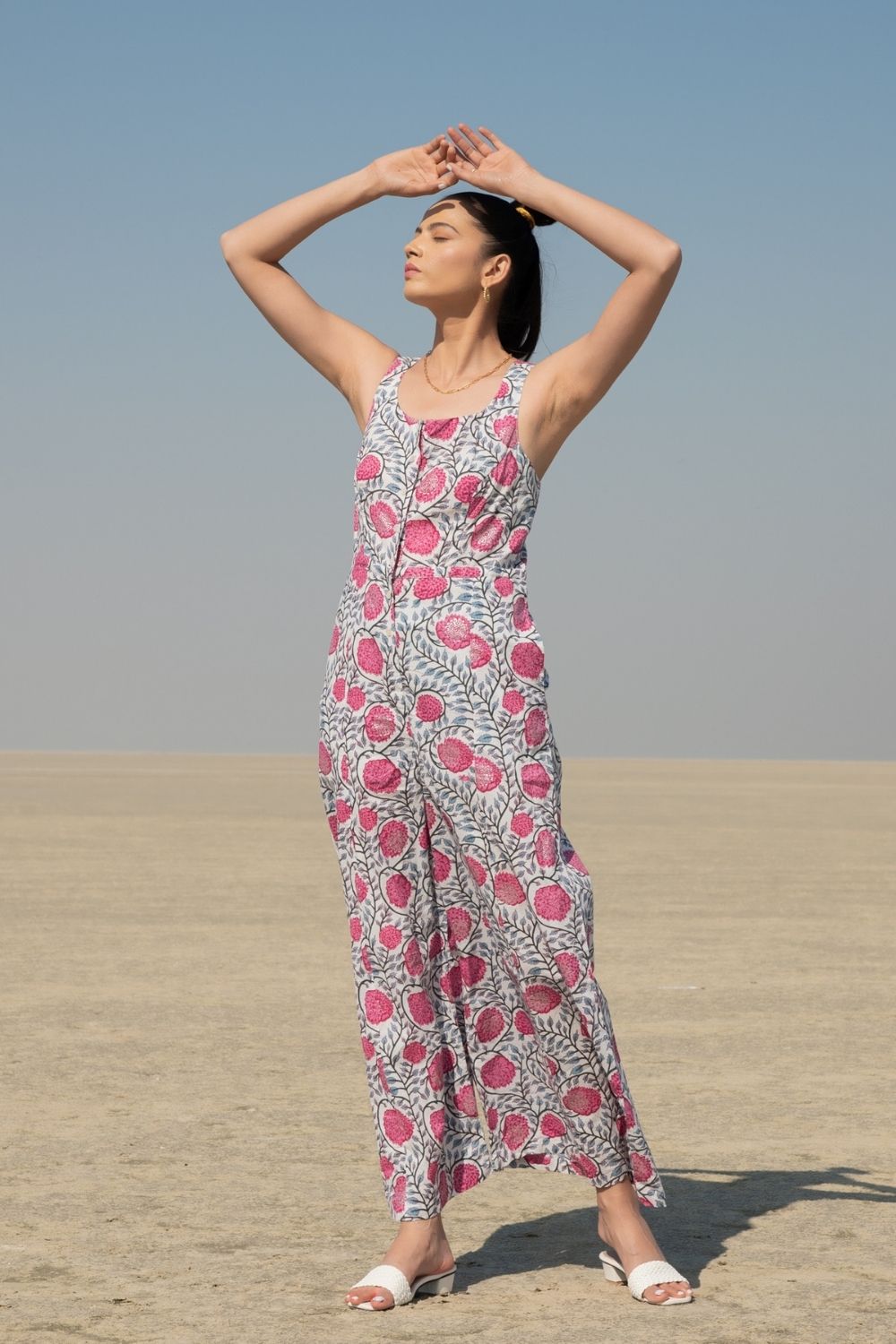Jumpsuits are perfect for the day you don't know what to wear. This simplistic sleeveless jumpsuit handblock printed in our classic fluer print on a soft cotton base is apt for summer afternoons.