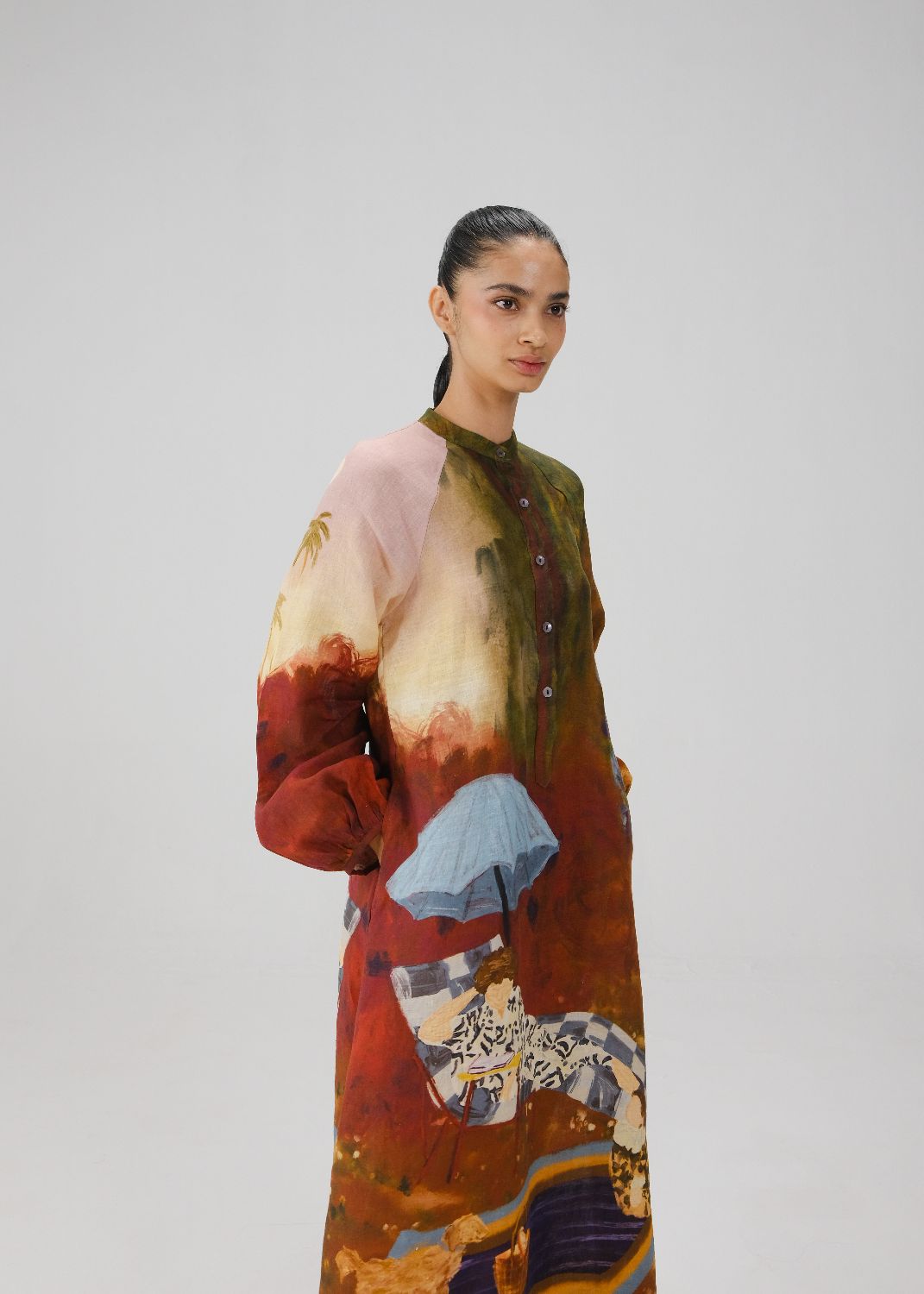 Crafted from pure linen, the Goa Dress features a band collar, long placket, and A-line silhouette with high side slits. Finished with full raglan sleeves and elasticated cuffs, it blends refined detailing with effortless versatility for both casual and elevated occasions.