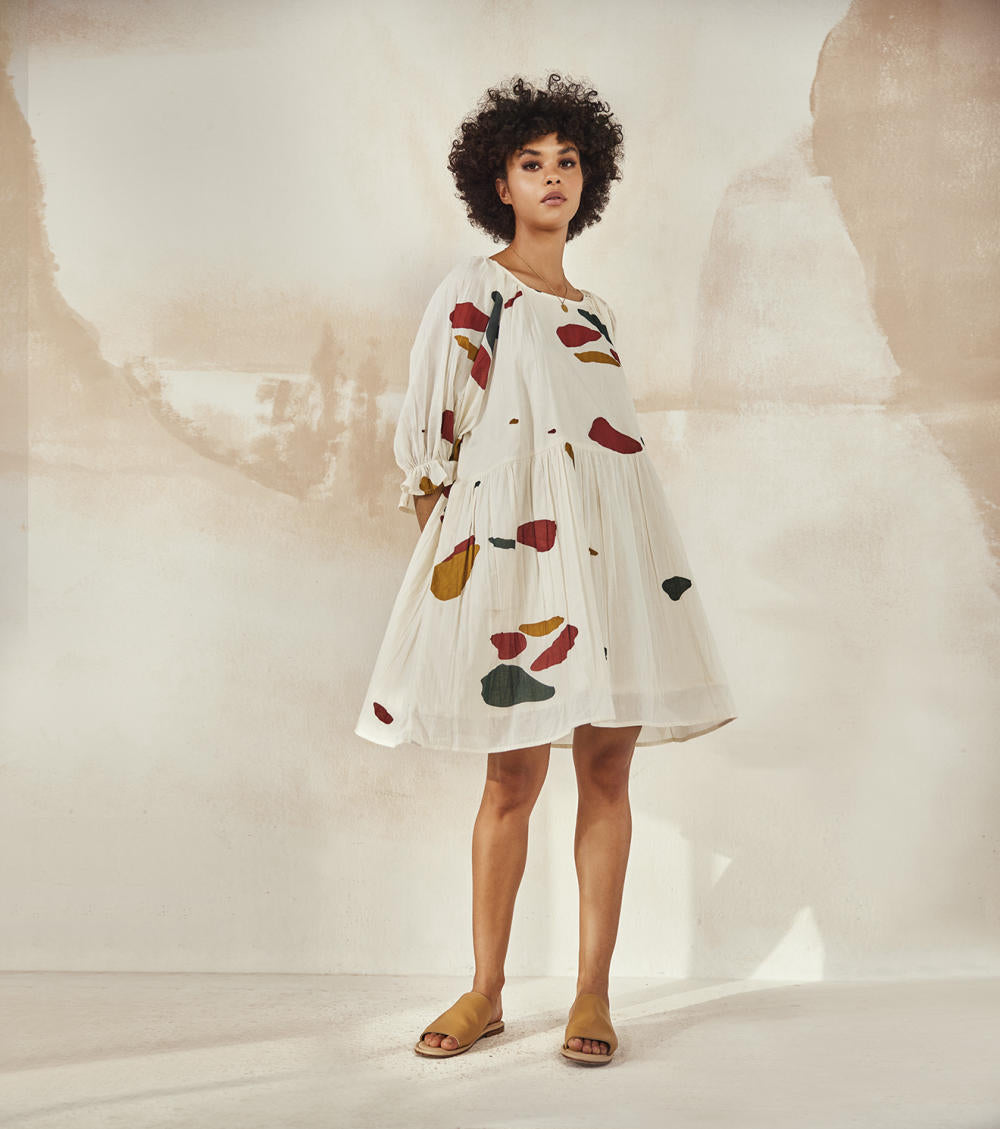 A mosaic printed flounce dress in mulmul with semi long sleeves, a zipper closure at the back and an attached lining.