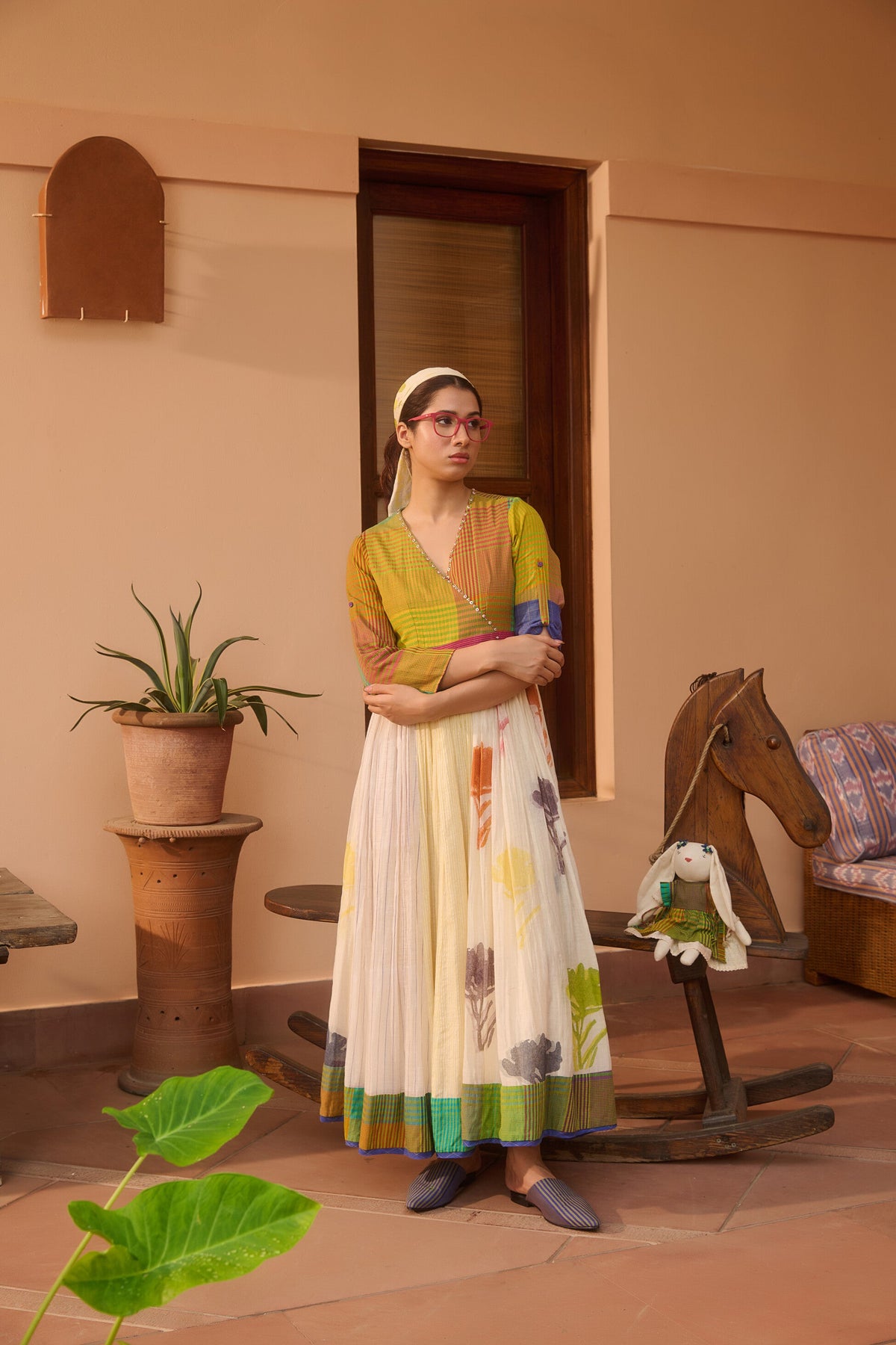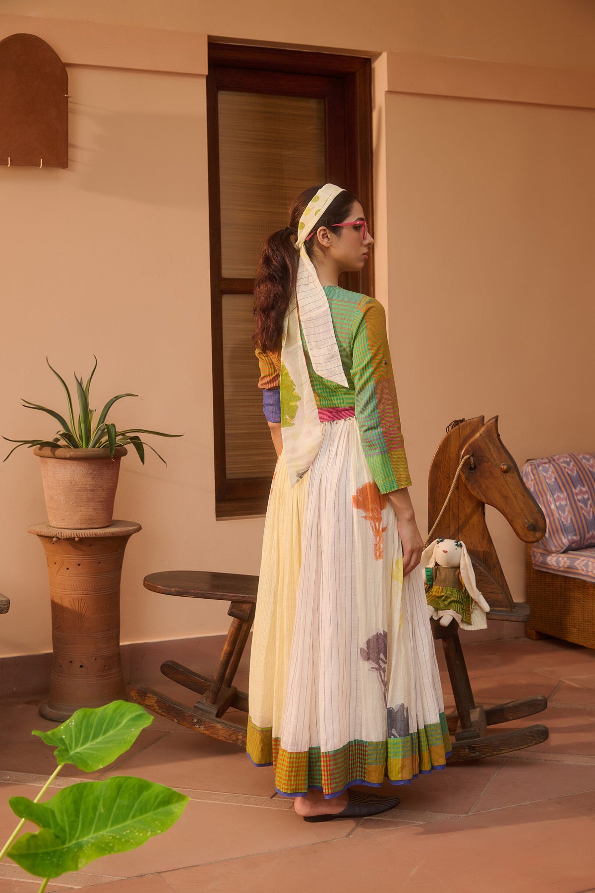 Her Chanderi carries its signature translucence and soft sheen, but with a subtlety that feels almost ethereal — printed slowly, consciously, through hand block printing that heightens the fabric's inherent delicacy.