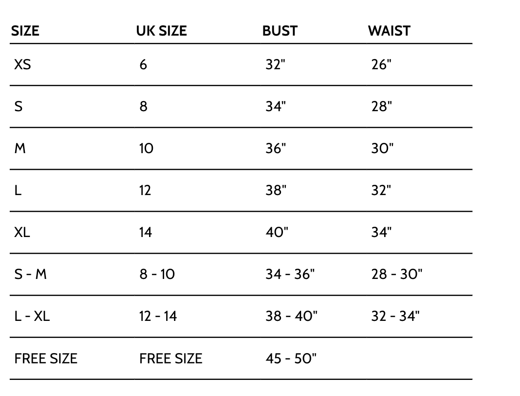 | Size | UK Size | Bust | Waist |