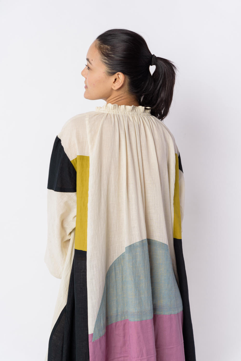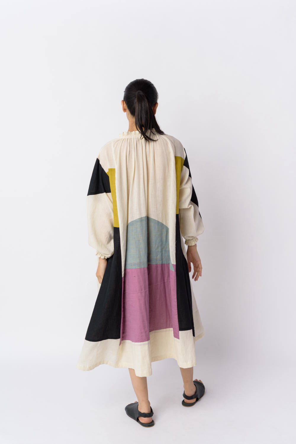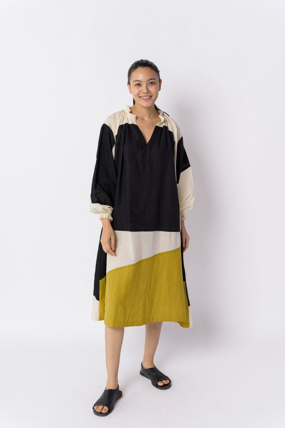 Tailored from soft & natural cotton fabric, the color-blocked patchwork dress is a modern minimalist piece with free-flowing charm. Designed to pull off on any occasion. Thoughtful details like patching together unstructured shapes, vintage-inspired cuffs with frill details, and gatherings around the neckline lend versatility to the outfit for your next spring holiday.
