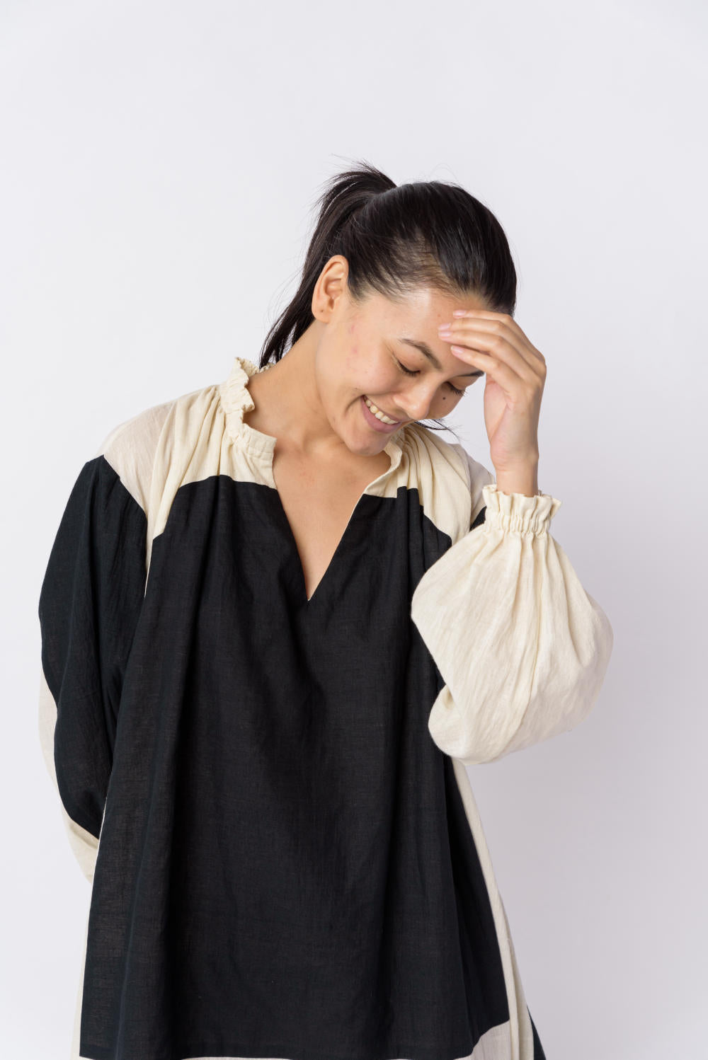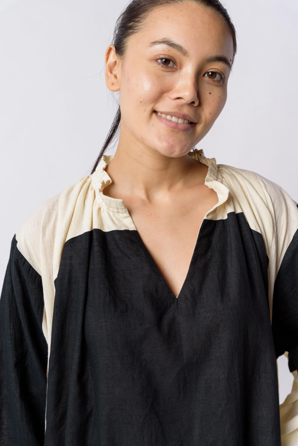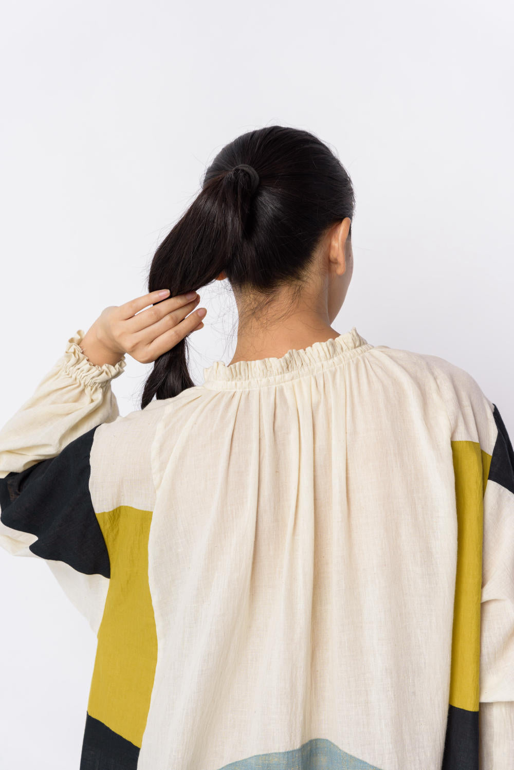 Tailored from soft & natural cotton fabric, the color-blocked patchwork dress is a modern minimalist piece with free-flowing charm. Designed to pull off on any occasion. Thoughtful details like patching together unstructured shapes, vintage-inspired cuffs with frill details, and gatherings around the neckline lend versatility to the outfit for your next spring holiday.