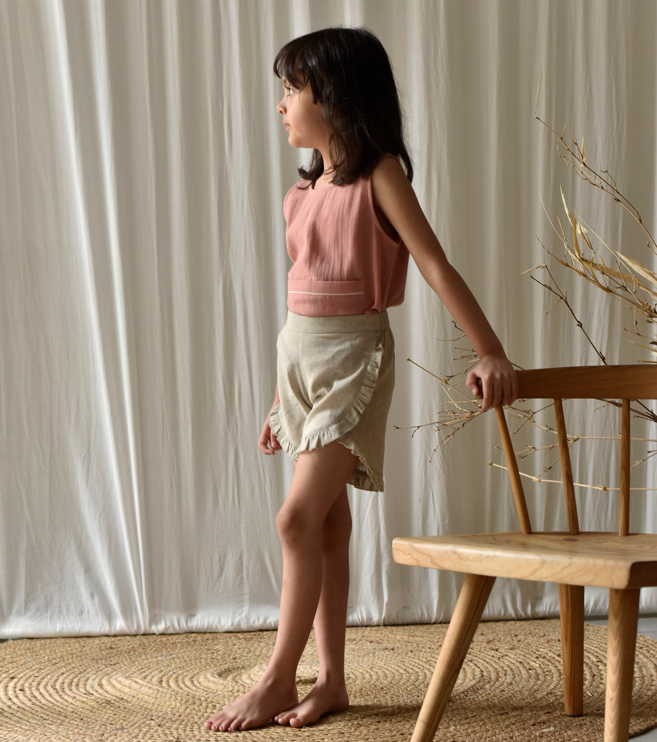 A beige elasticated flap shorts with frill detailing on seam lines for a relaxed and enjoyable time.