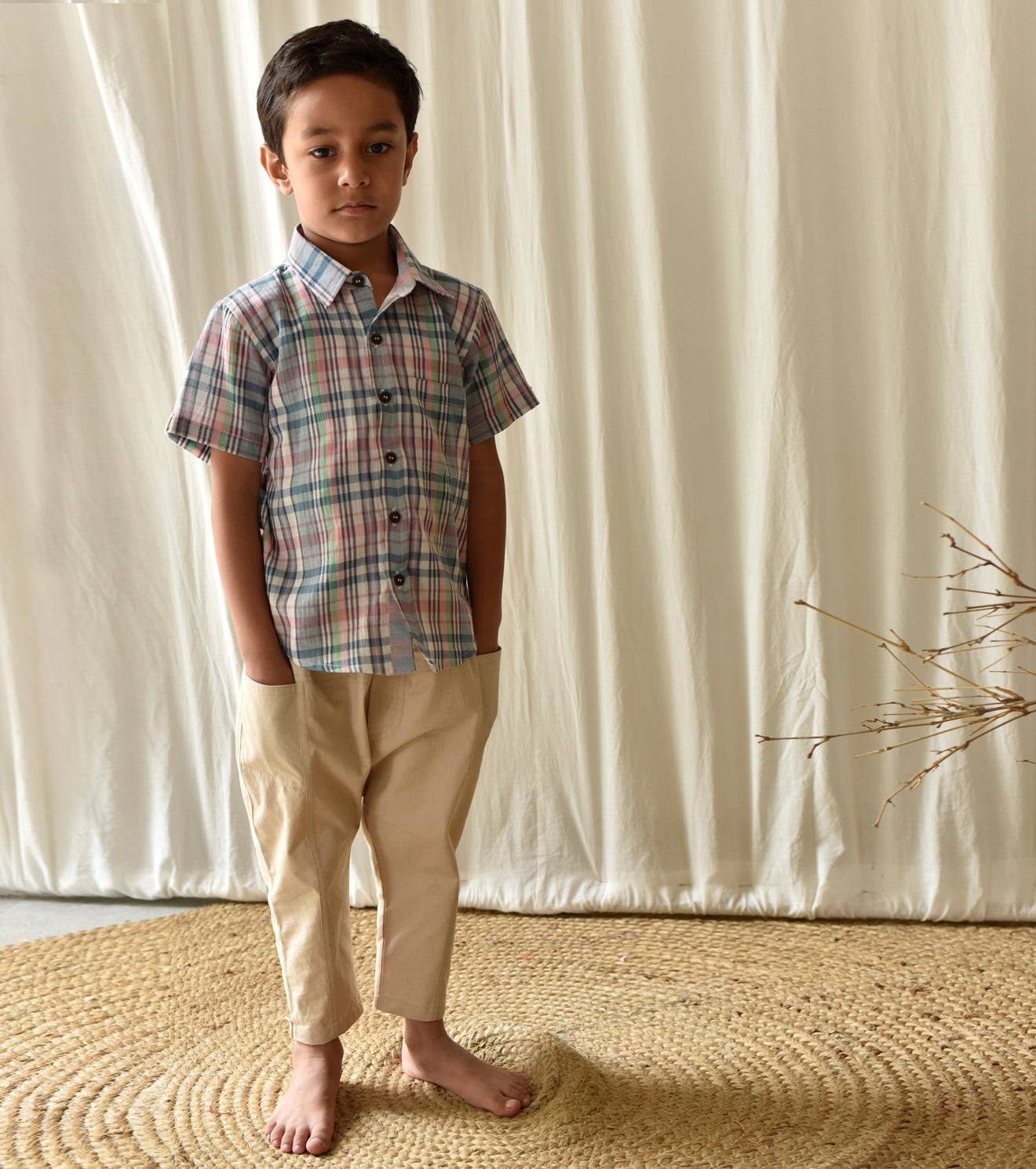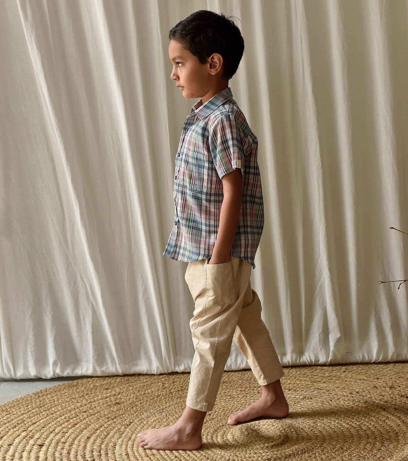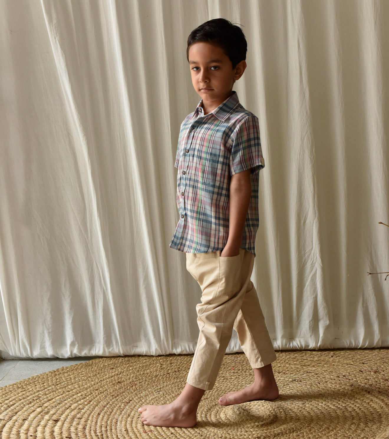 A multi-color checks coloured shirt comes with attached lining front pocket and front button closure for easy way out. Comfortable and perfect pick for your son a summer day.