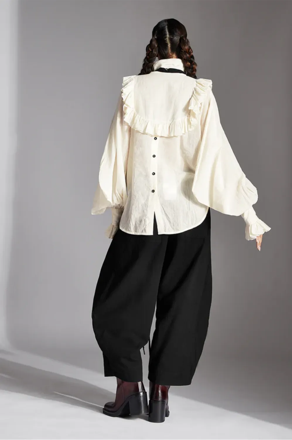 The Amri Shirt has a high collar with detachable black tie, bishop sleeves, ruffles on the front and back yoke and front button down placket. Additionally, it features a half button down placket at the back.