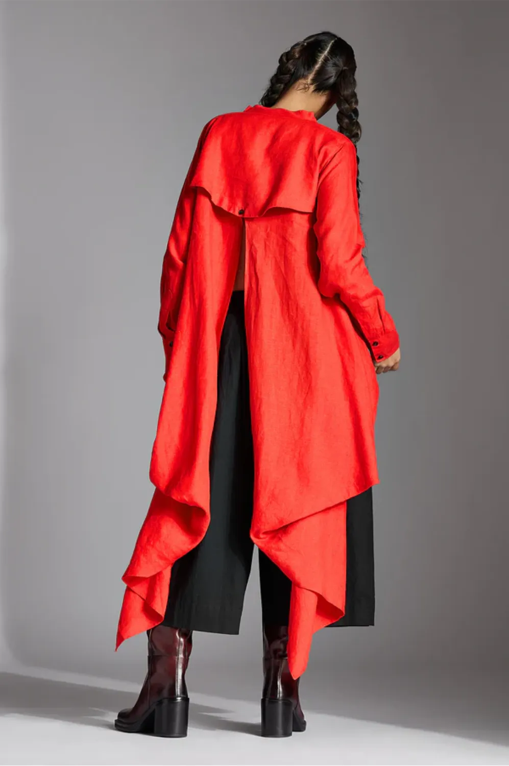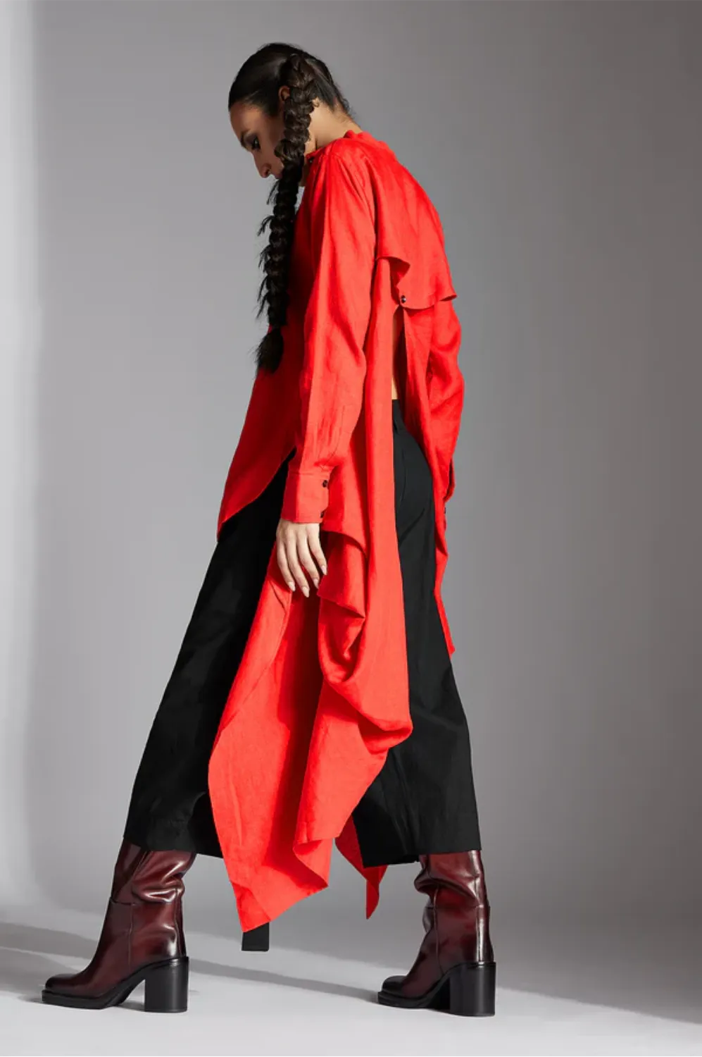 Elva is a deconstructed shirt with band collar, back flap with pleat detail on the slit, narrow full sleeves and curved hem on the front.
