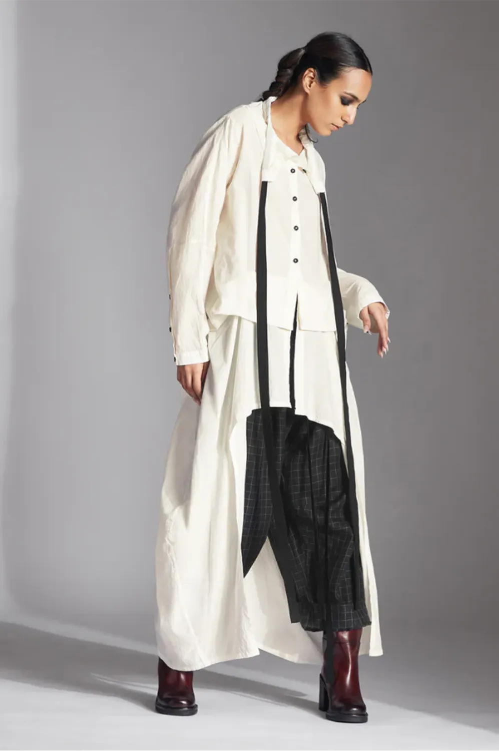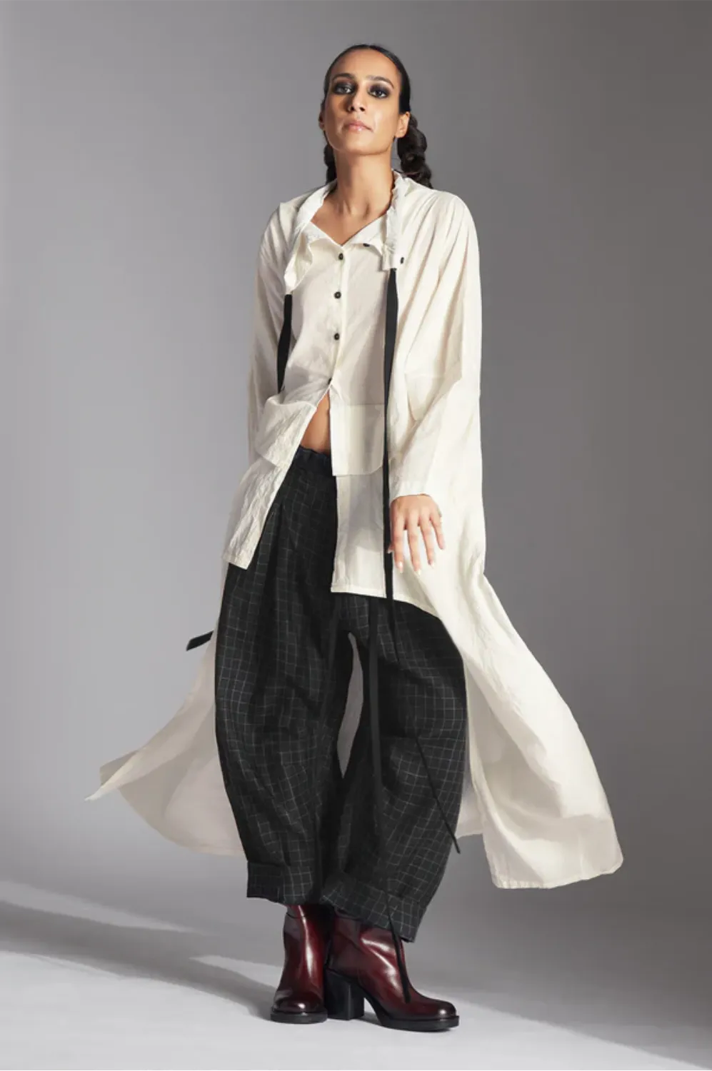 Chola’s universe begins with thoughtful materials. Recycled cottons, post-consumer fabrics, and free-cutting techniques come together in a kind of mindful choreography—one that honours form without creating waste, and prioritises movement over rigidity. This is clothing that feels lived-in yet architectural; pared-back yet quietly avant-garde.
