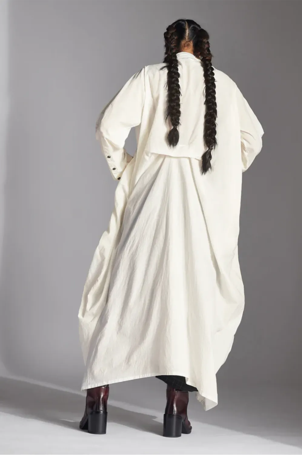Evia features a high-low style with an uneven front and back length, adjustable extended high collar, lantern sleeves and a half uneven fold at the back.
