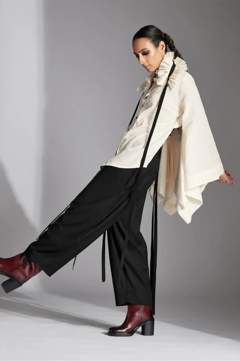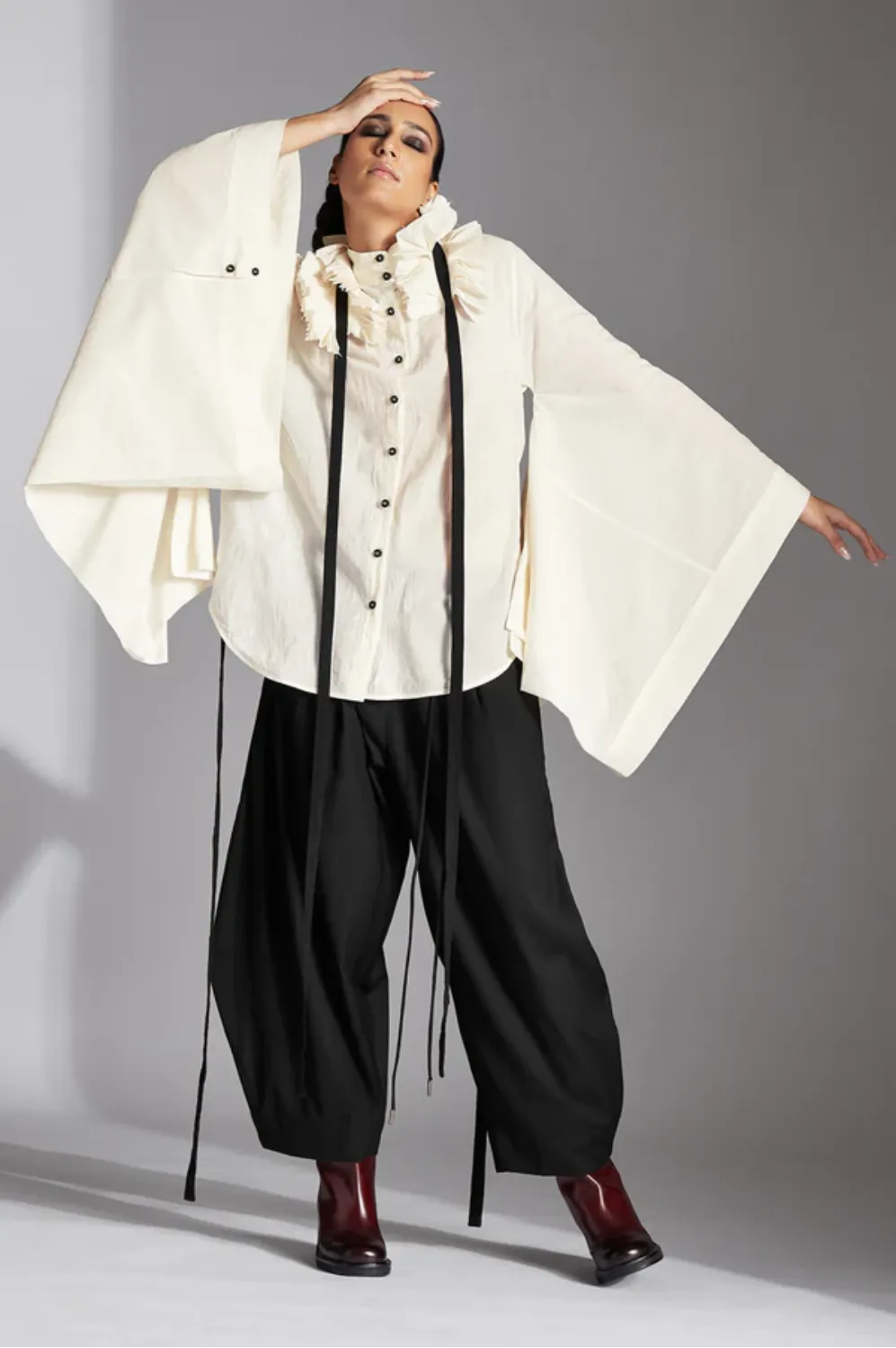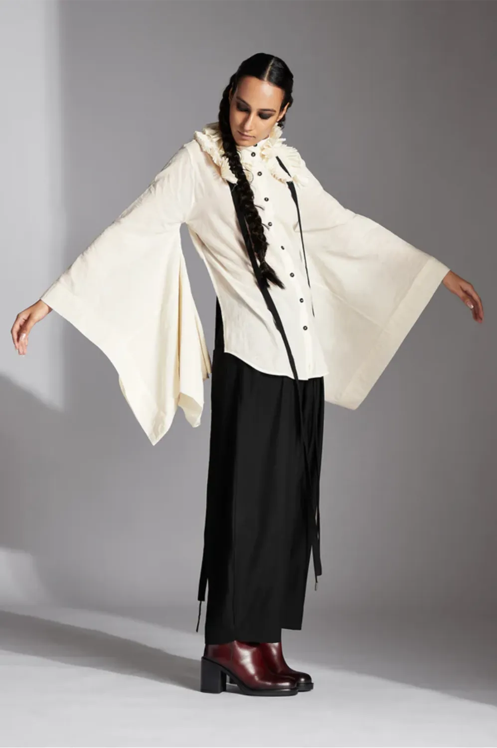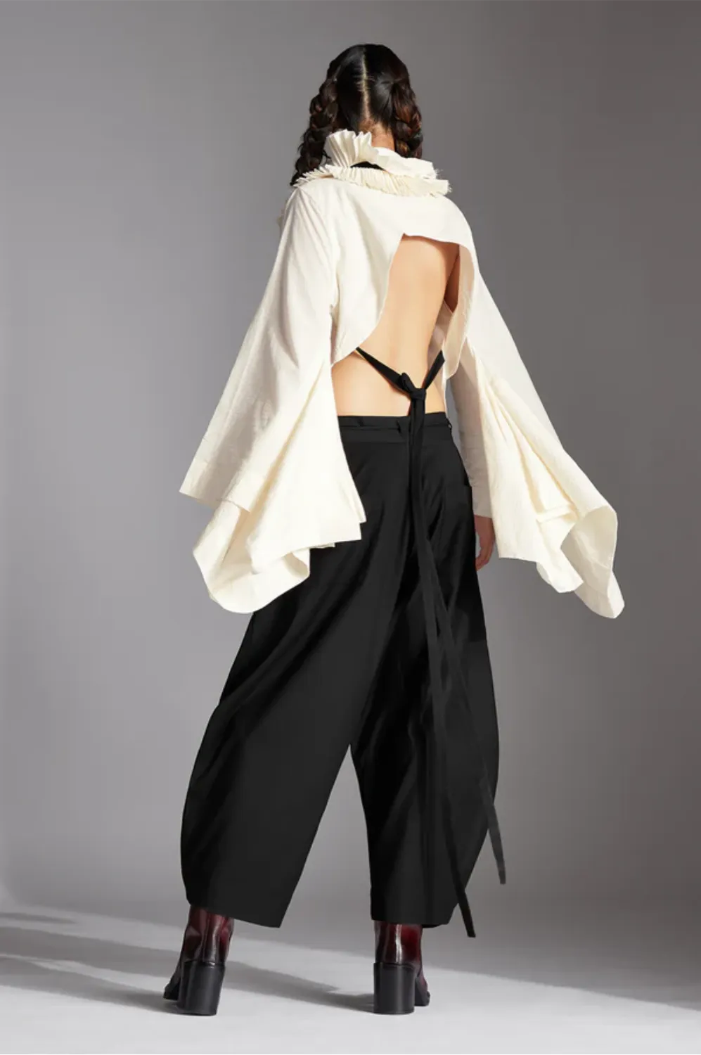 Evra is a backless shirt with stand collar, detachable pleated frill collar, deconstructed sleeves and back-tie-ups.