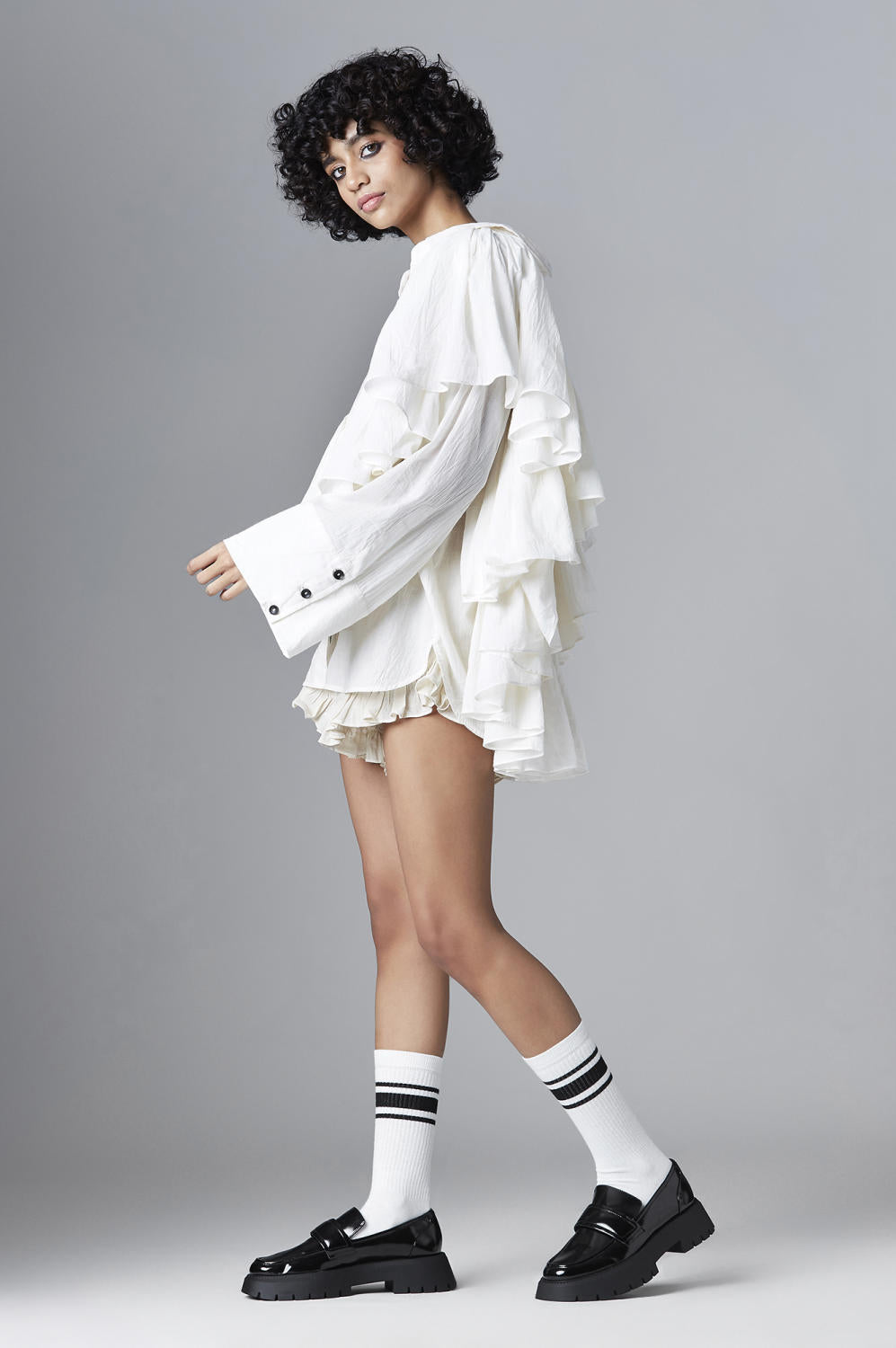 FRILL HIGH LOW SHIRT WITH TWO PIECE COLLAR, A LINE FULL SLEEVES, BUTTON DOWN PLACKETS AND U SHAPE YOKE AT FRONT AND BACK.
