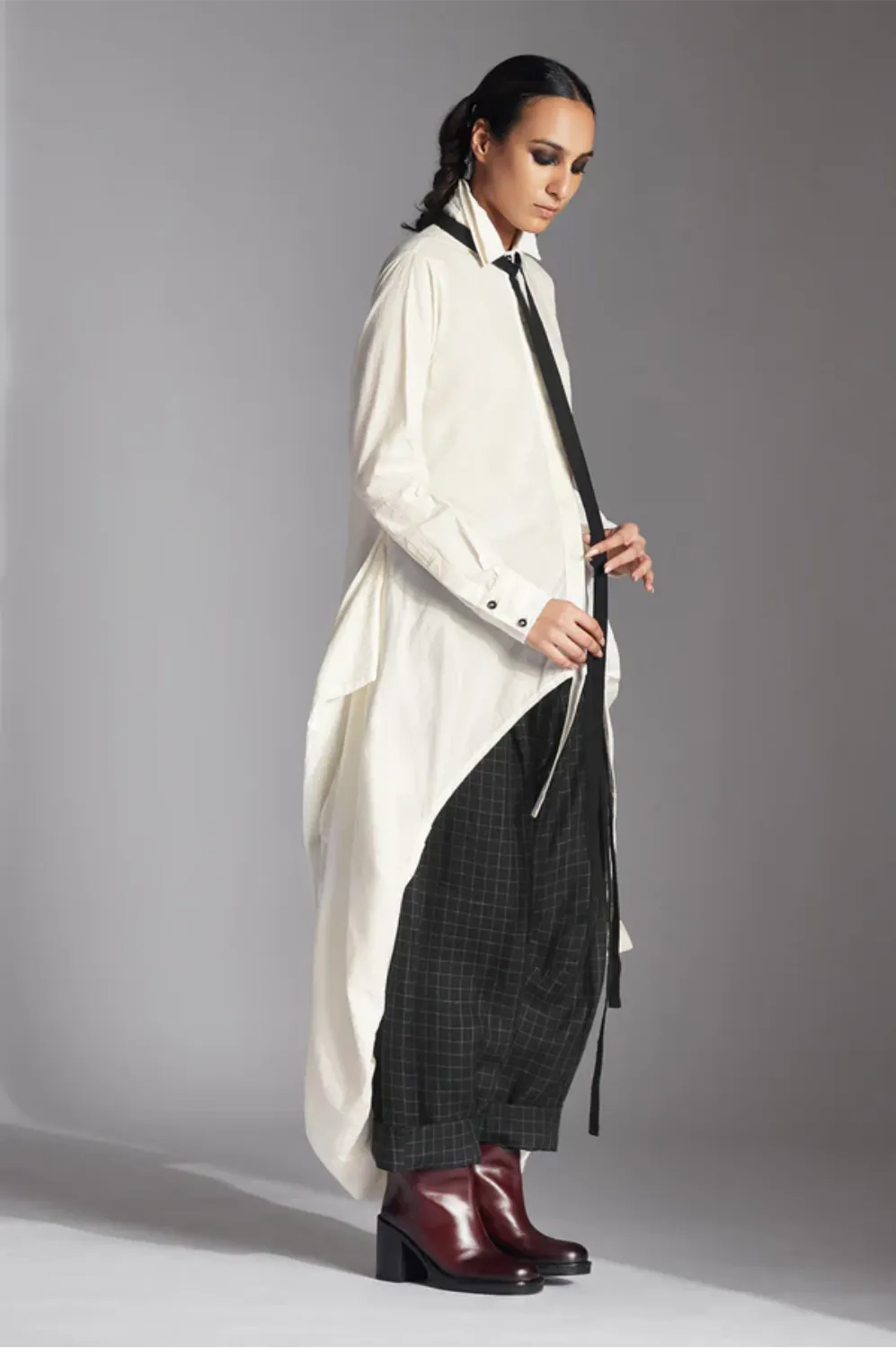 The Tane shirt features a double shirt collar, invisible extended front button placket, narrow full sleeves and fold at the back. Additionally, it features tucks at the hem.