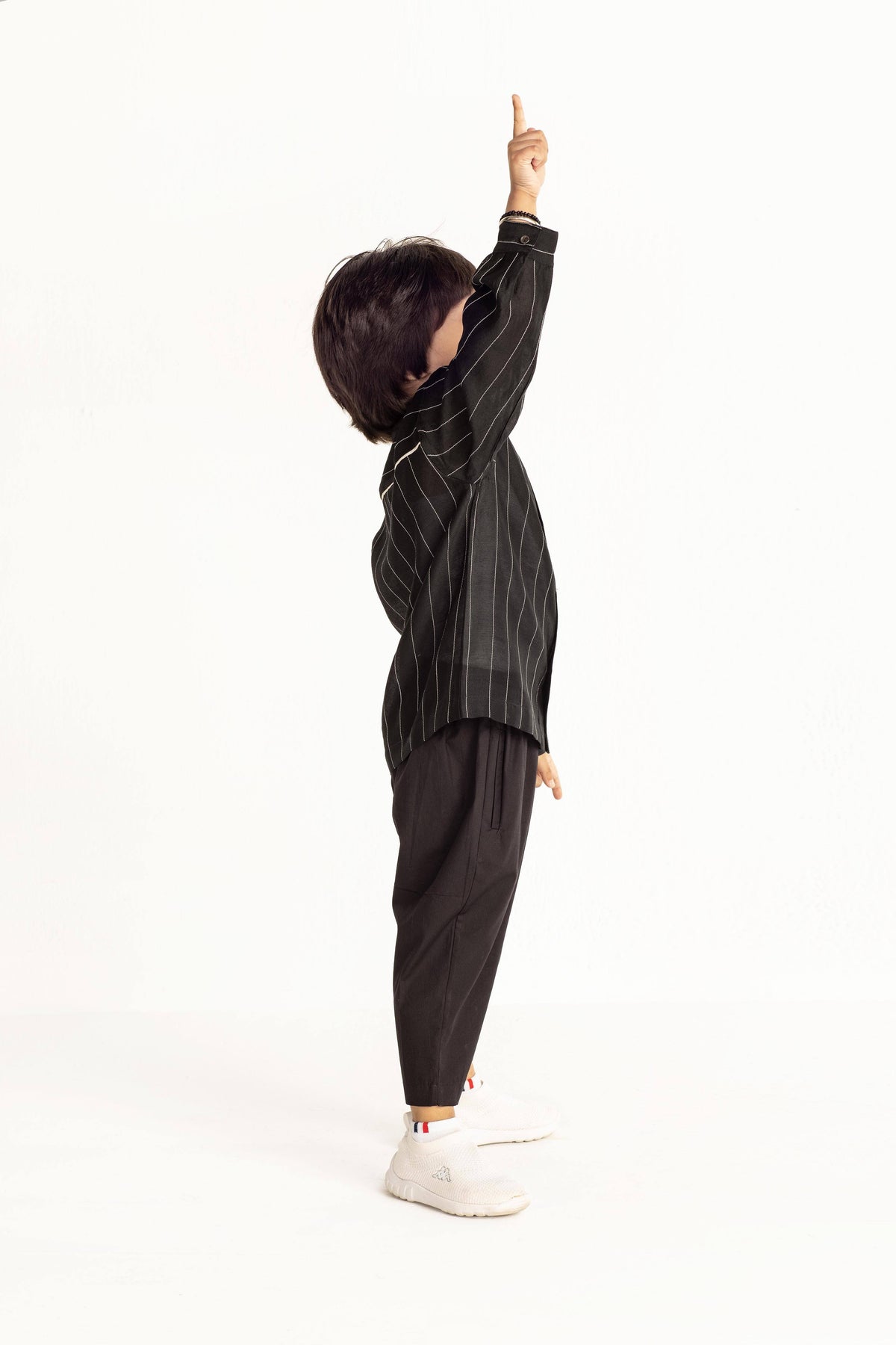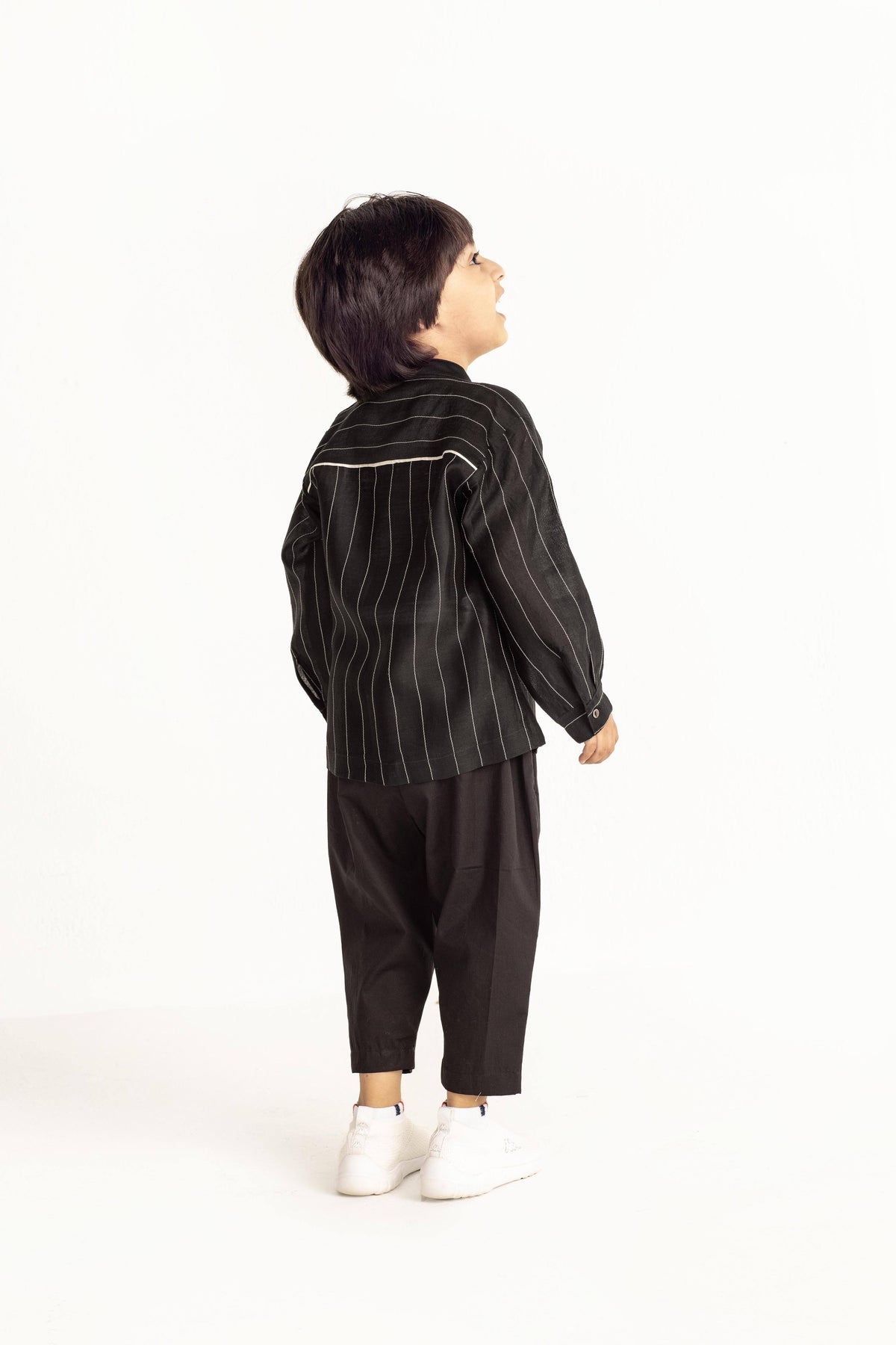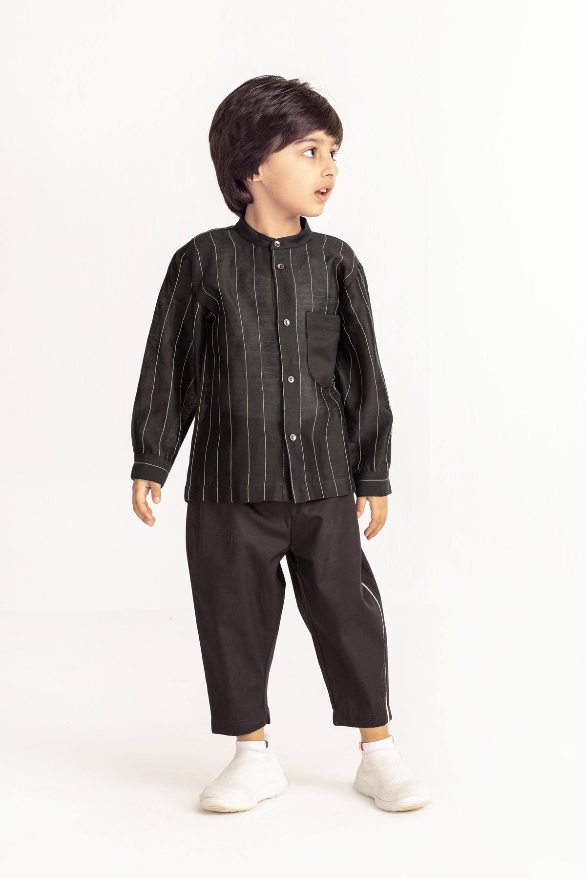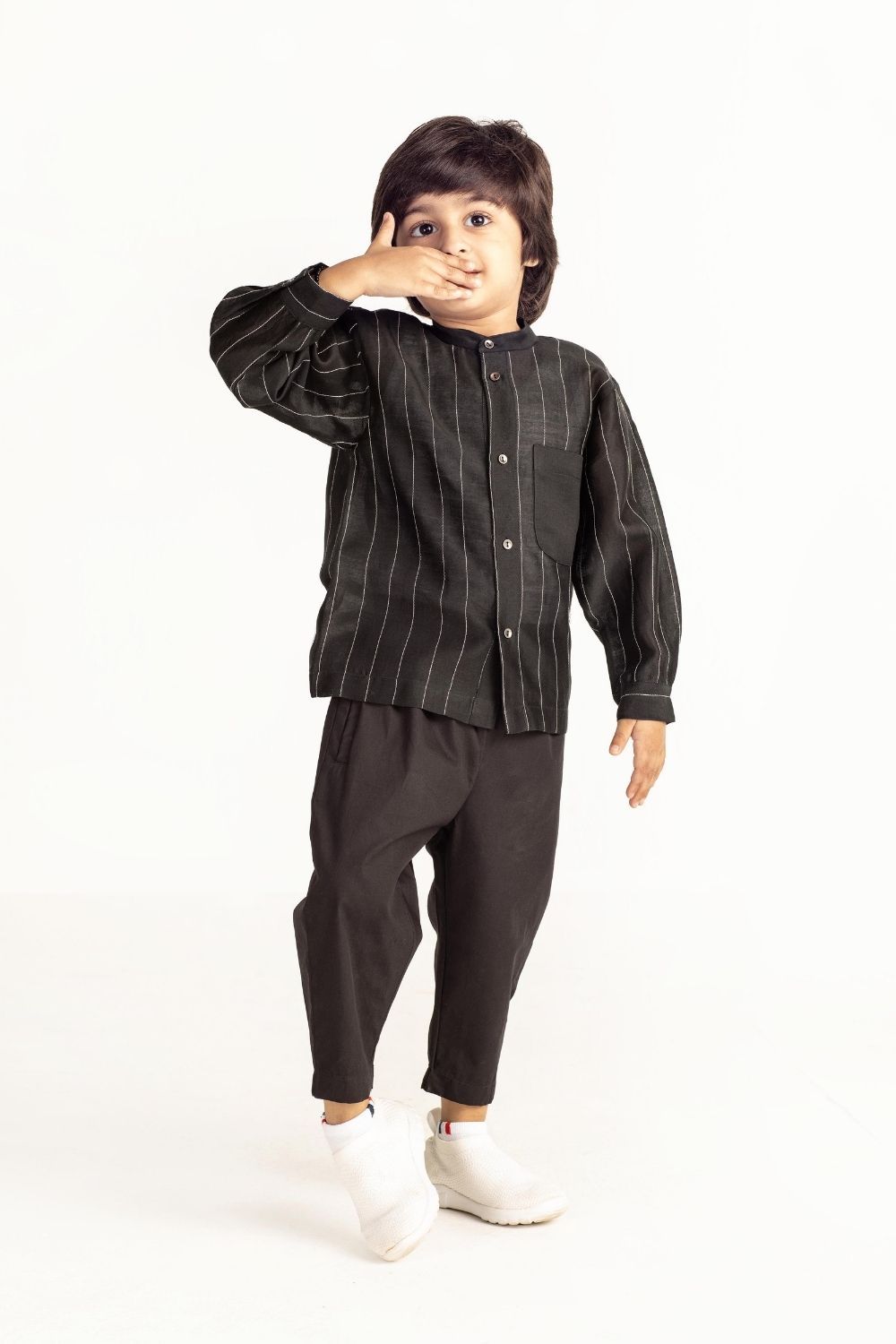 Band Collar Chanderi Shirt Co-ord- Black Kids THREE Kids