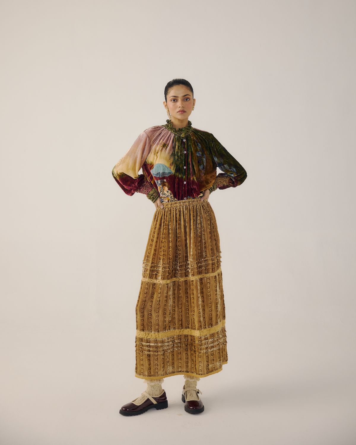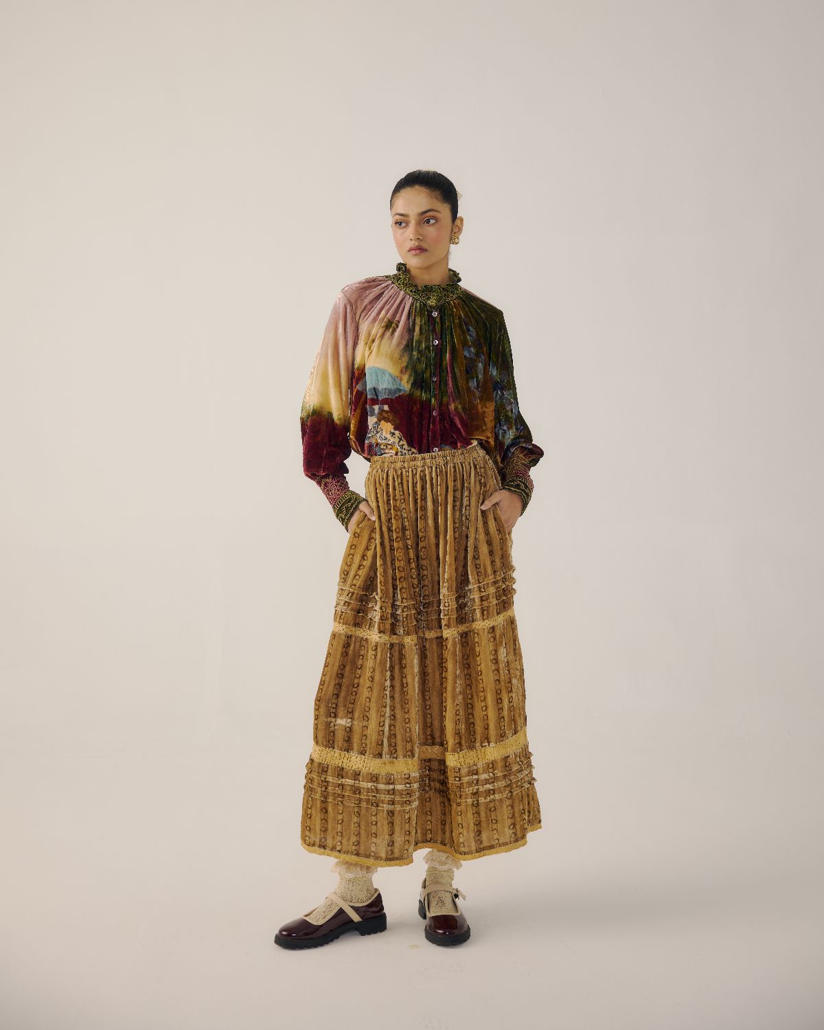 The Farmer Top is made from velvet fabric in Lakeside print. It features hand-smocking details on the neck and the bishop sleeves, along with front button details. Our classic Emily skirt, now crafted in velvet fabric adorned with a charming print for a cosy, stylish feel of comfort and elegance. Top