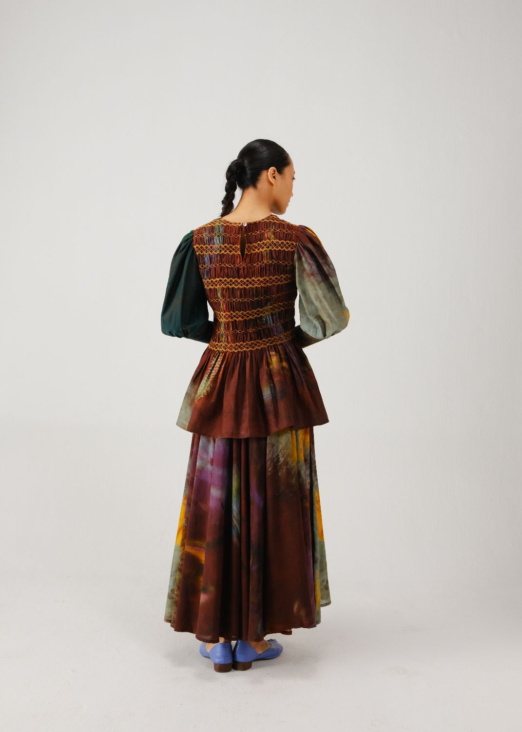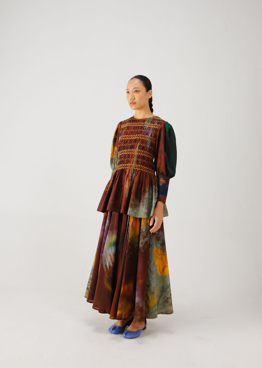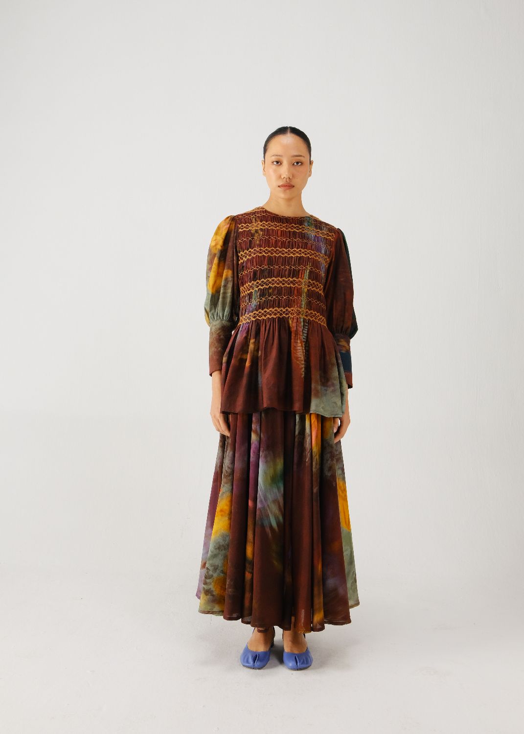 The Gaia Set features a silk top and a skirt. The top has a smocked torso with a peplum silhouette and bishop sleeves. The skirt has an elasticated waistband and a flowy silhouette.