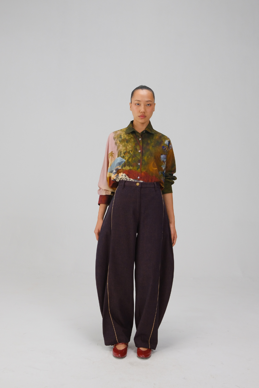 The Kiera Set includes the soft cotton Kiera top and barrel-leg pants. The top features a vintage-inspired club collar and relaxed fit, while the pants have an exaggerated barrel silhouette with a band waist, front button fastening, and piping details.