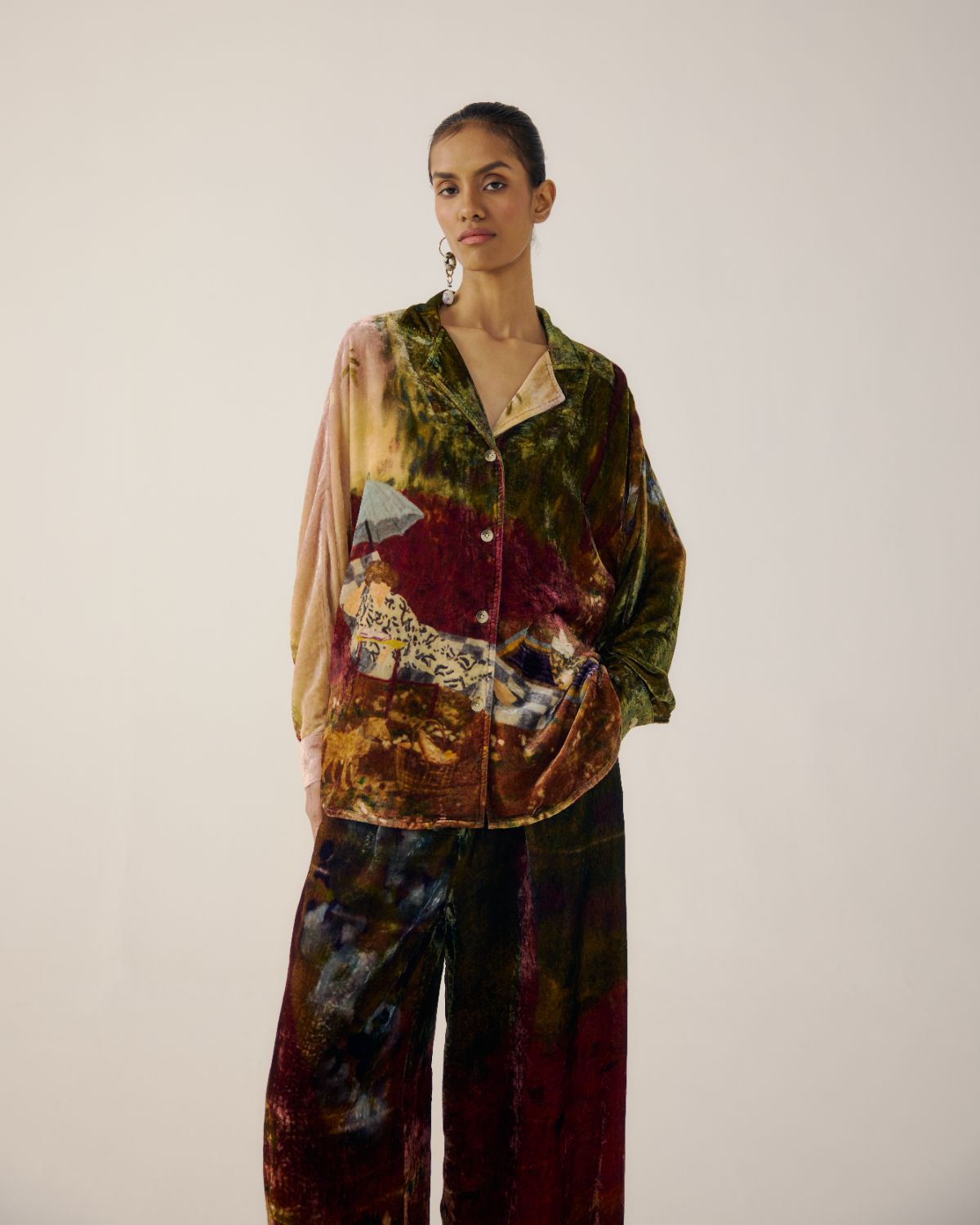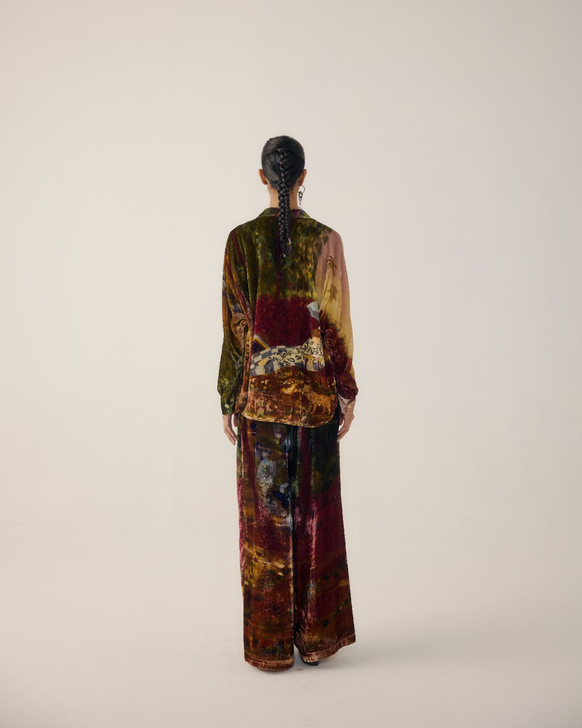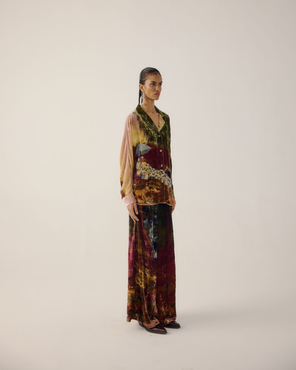 The Lounge shirt is made from Velvet fabric in Lakeside print. It is a button-down shirt and has notched collar detailing. The lounge pants are made from Velvet fabric in Lakeside print. It features a button and zip fastening along with pleats in the front, and an elastic waistband at the back