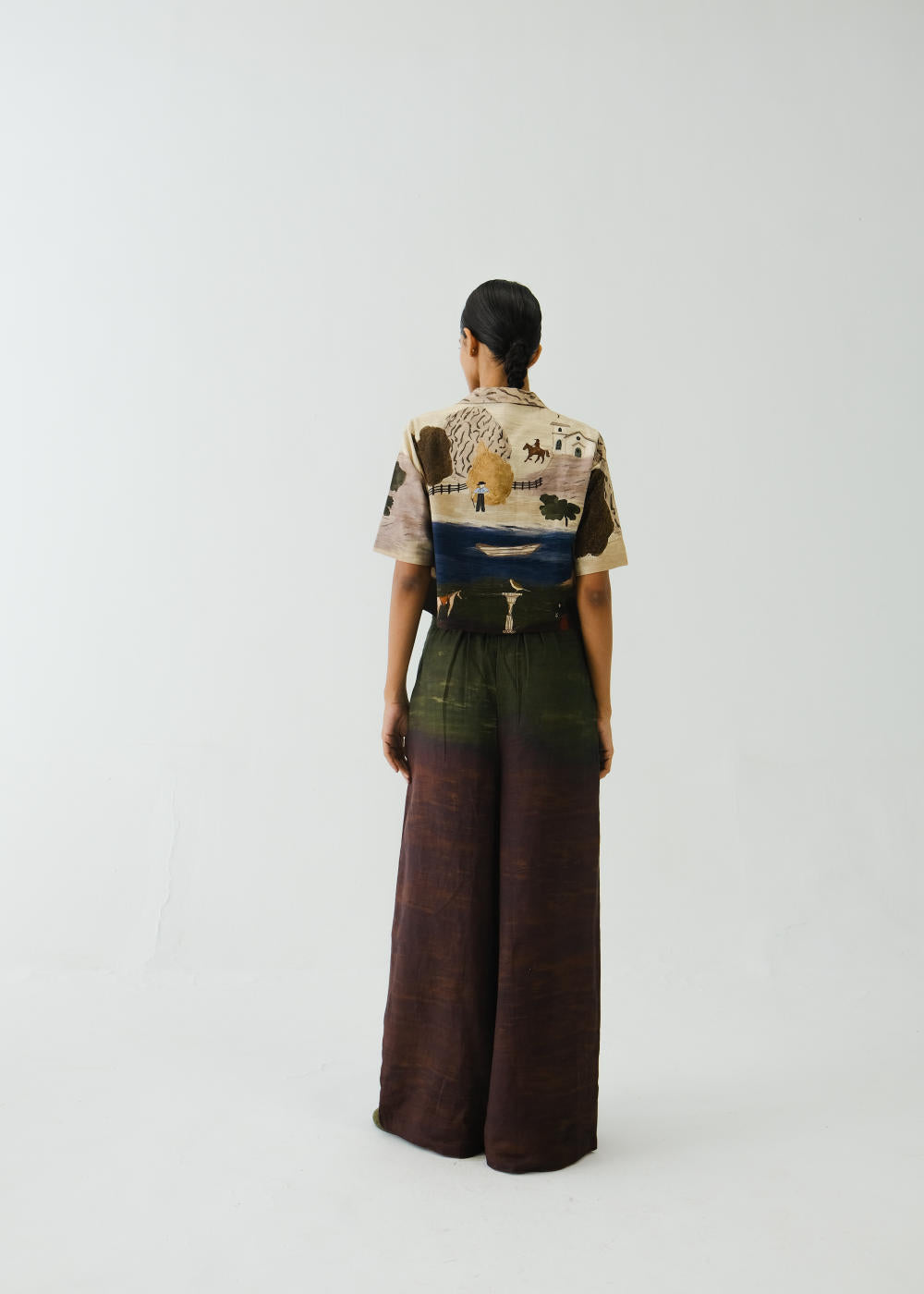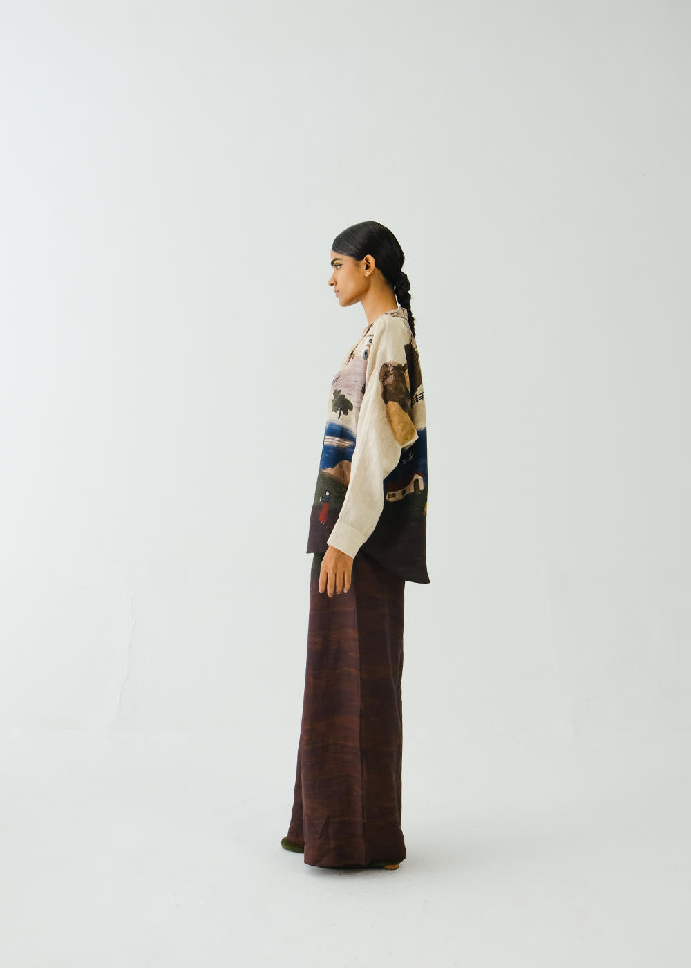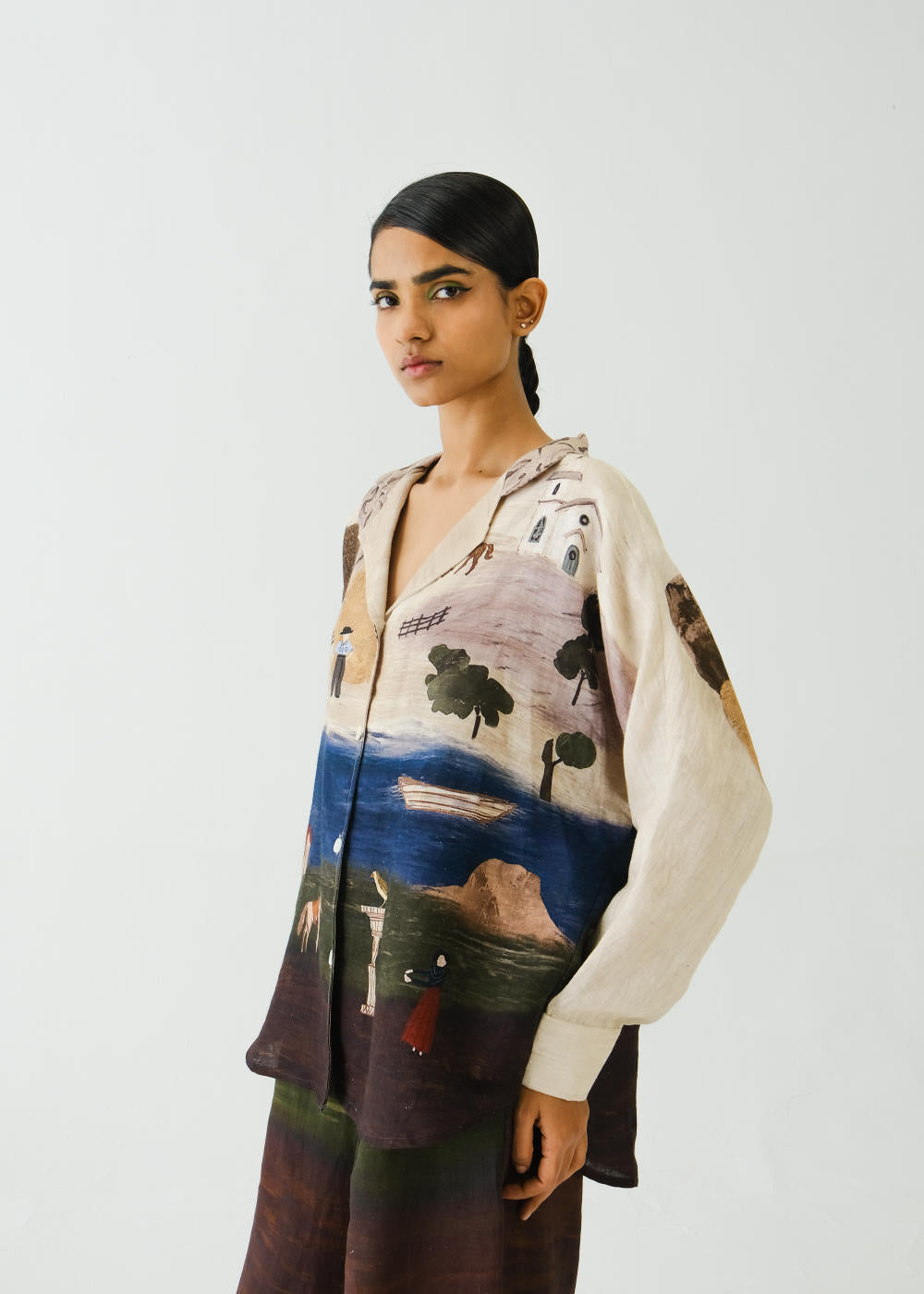 The Lounge shirt is made from Linen fabric in Village print. It is a button-down shirt and has notched collar detailing. The lounge pants are made from Linen fabric in a Village print. It features a button and zip fastening along with pleats in the front, and an elastic waistband at the back.