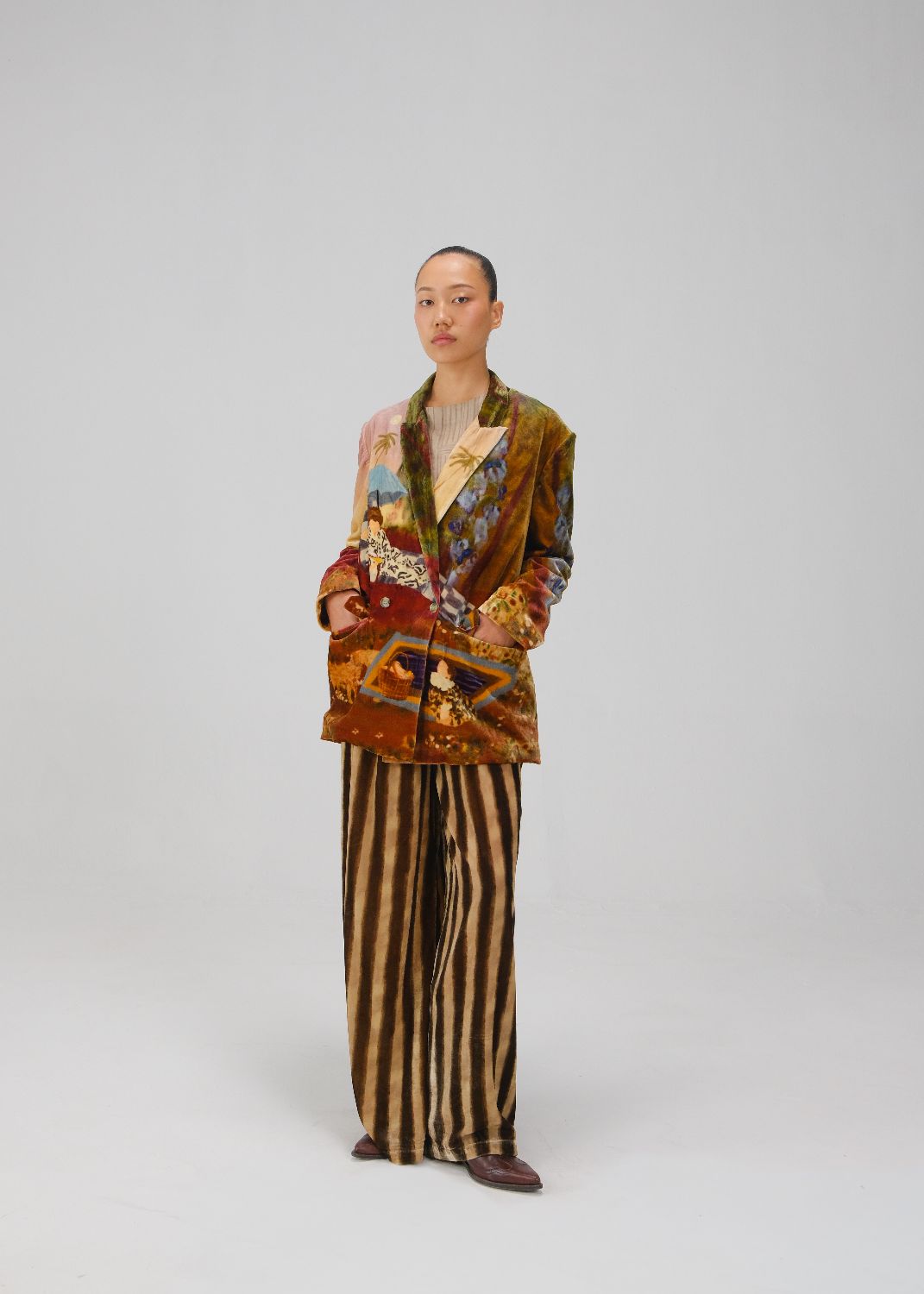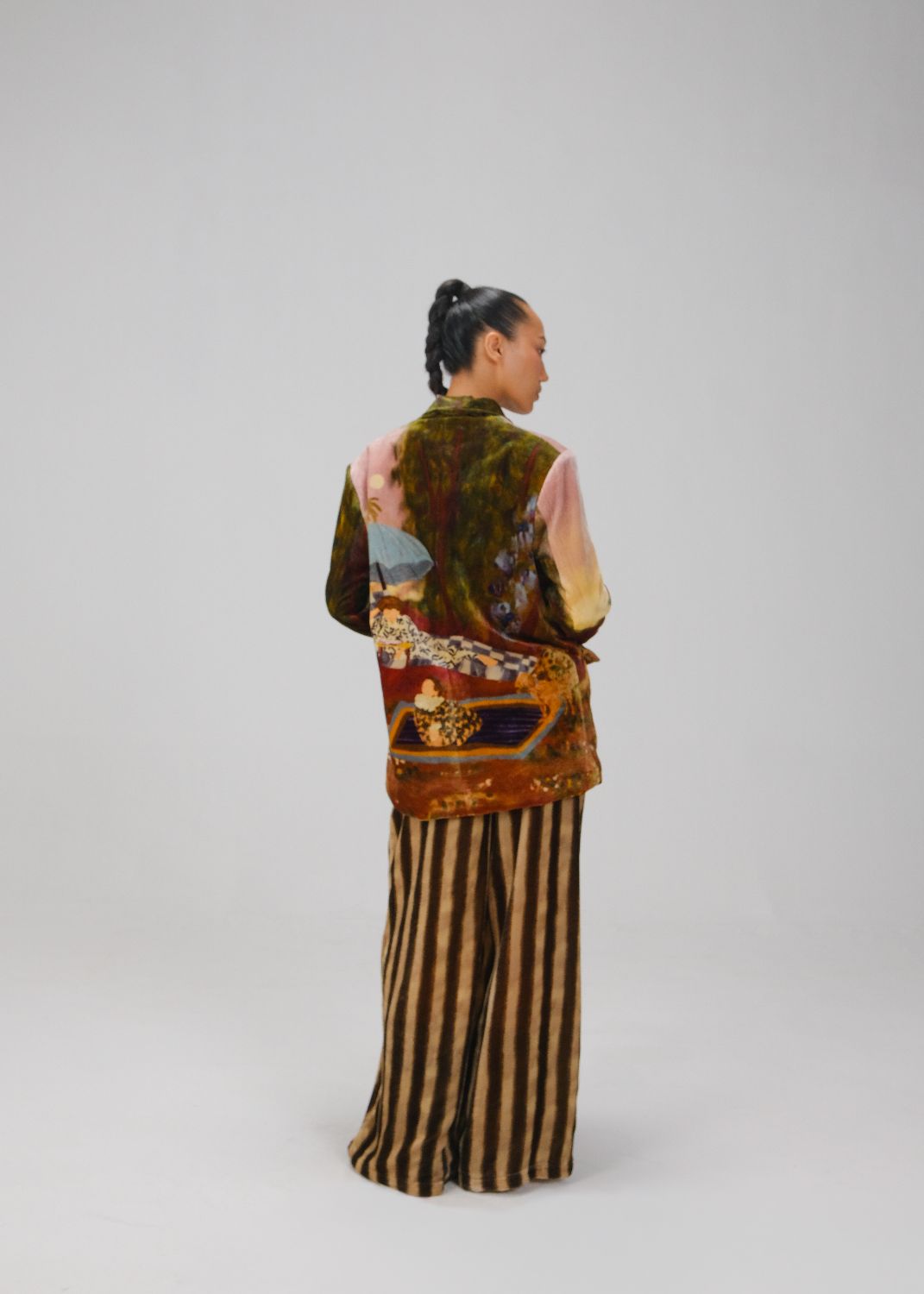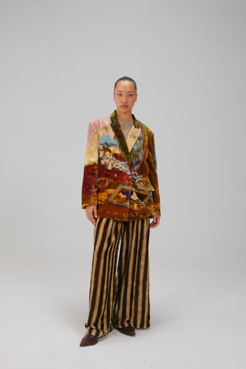 CORD blurs the line between art and attire in a way few labels dare to. Here, fabrics become canvases; illustrations—drawn by hand, steeped in imagination—flow across silhouettes that feel sculptural yet deeply wearable. Each piece has a texture of memory to it, as if it carries echoes of a past life, now reframed for a contemporary world.