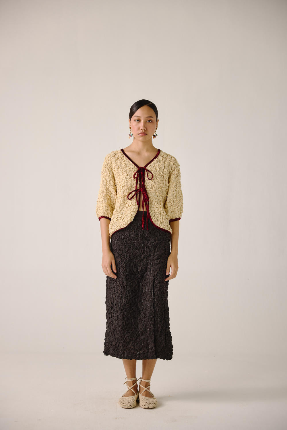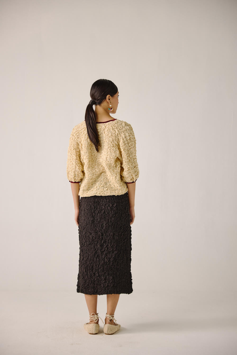 The Ruffled Set, crafted from elasticated smocking, features a ruffled top with front tie strings, contrast piping, and elbow-length sleeves. Paired with the Bert skirt, designed with waist darts and a front slit, this chic calf-length skirt blends comfort with effortless elegance.