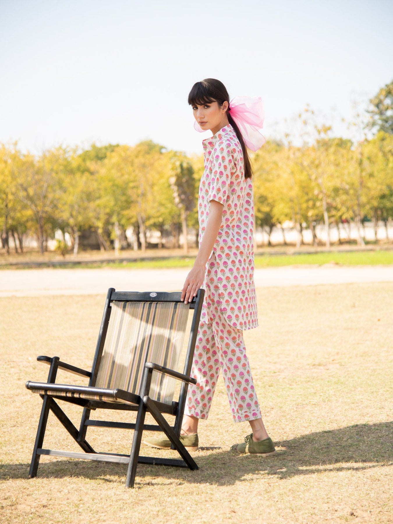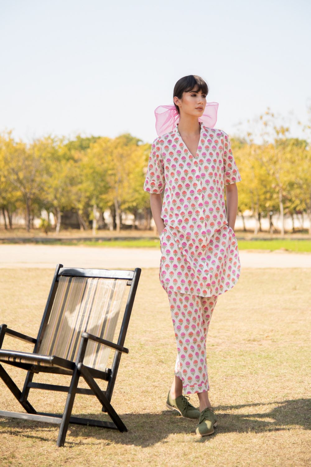 Chic co-ord set in floral block print. Dress it down for a casual lounge in at home or dress up as a fun kurta set. Set the style quotient high with this must have piece in your wardrobe.