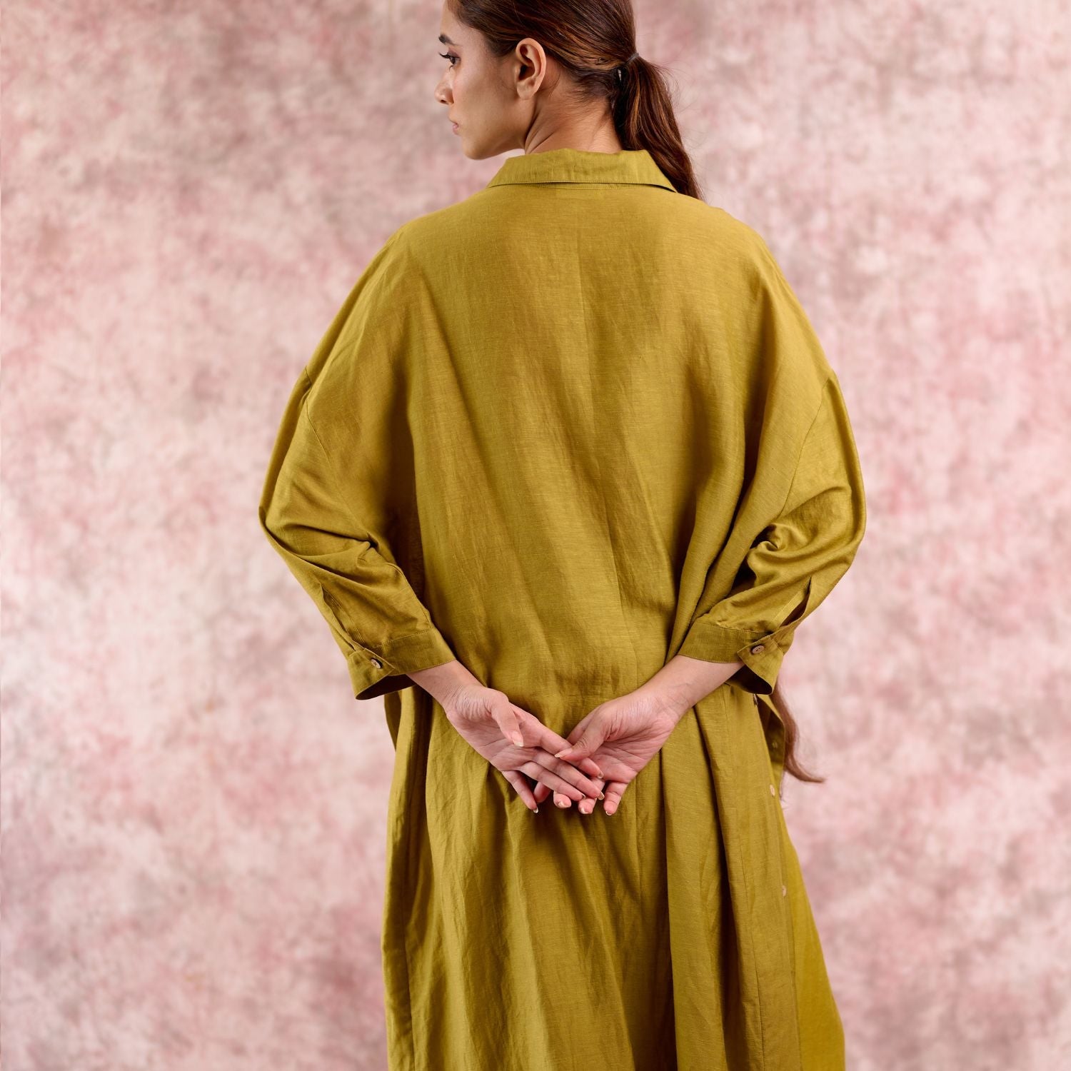 A thoughtfully designed co-ord set that blends ease with elegance. The oversized green tunic features sharp collars, cuffed sleeves, and long side slits that create fluid movement, while the relaxed-fit pants are tailored with soft front pleats and an adjustable drawstring at the back for a custom fit. Worn together, they create a contemporary silhouette that transitions seamlessly from day to evening, while each piece also stands strong, styled on its own.