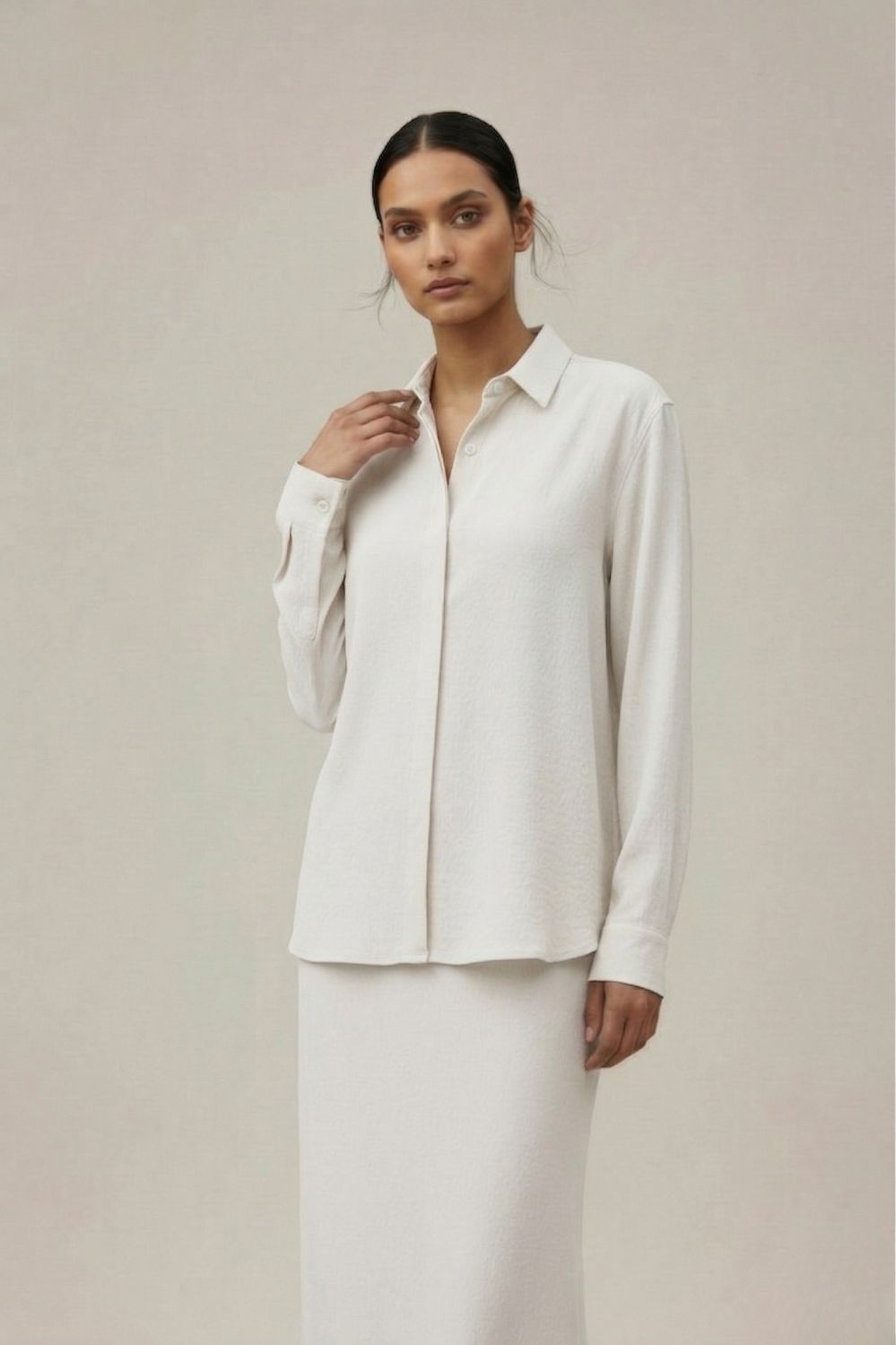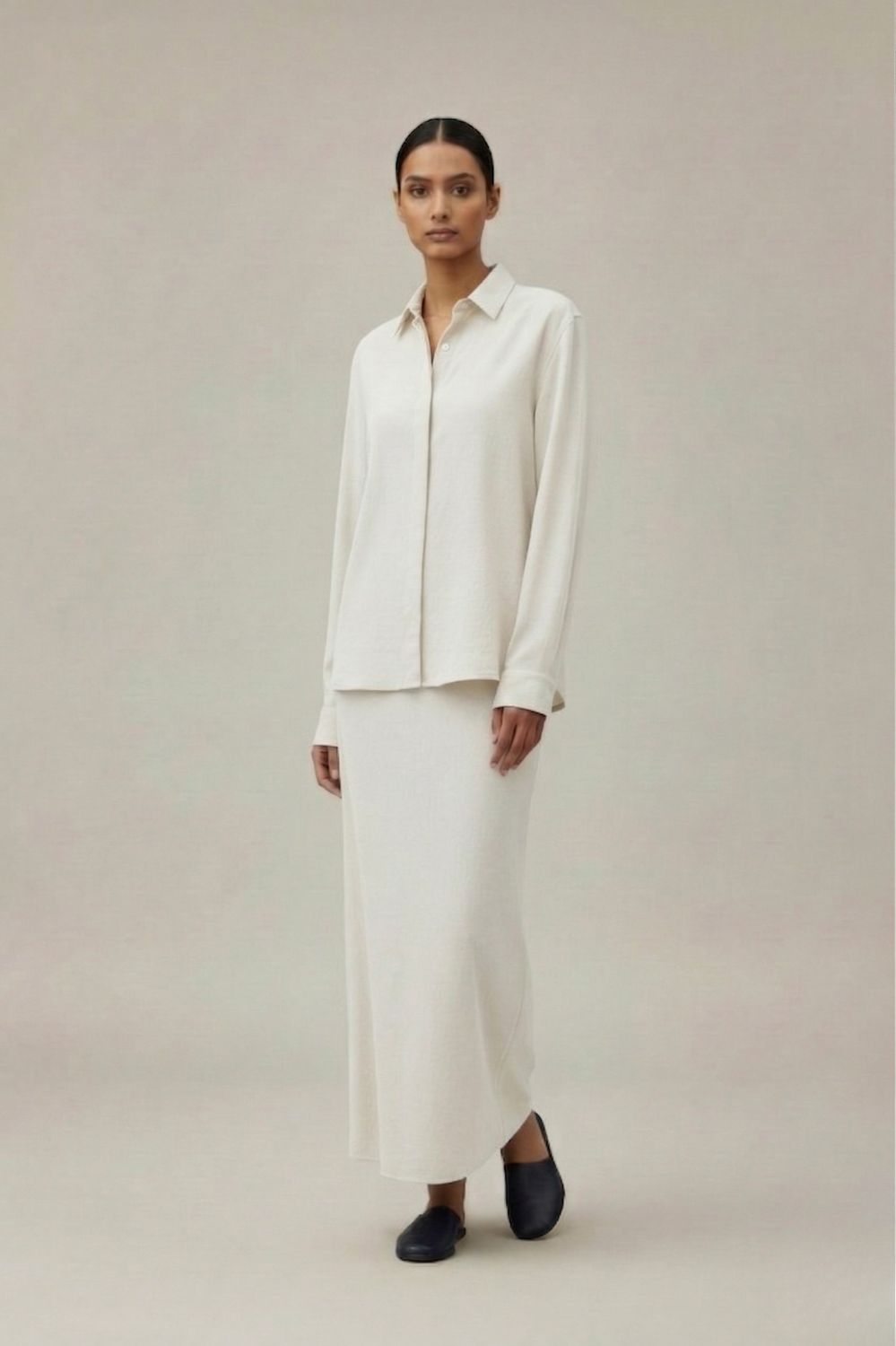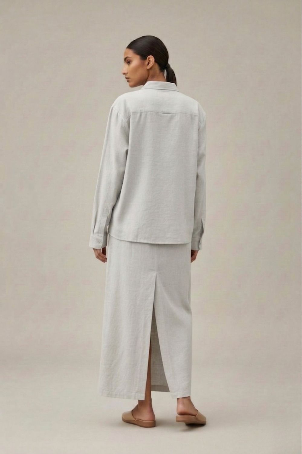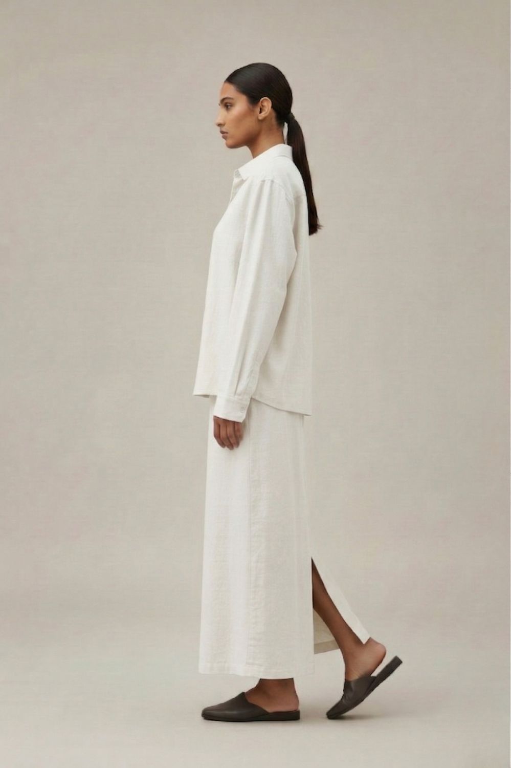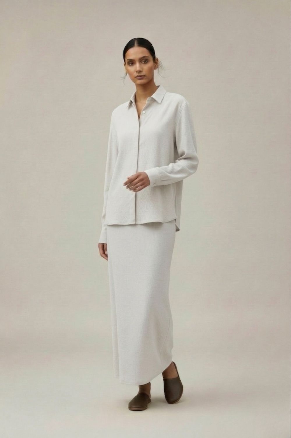 Button down full sleeve shirt with concealed placket and a Straight skirt with a slit at back. The skirt comes with a side zipper closure and side pocket.