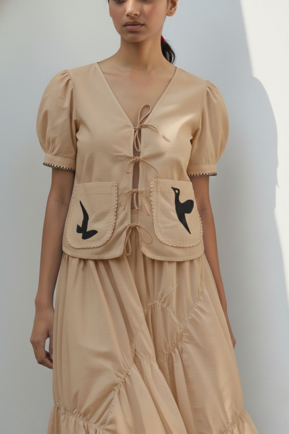 The top features patch pockets, subtle frill detailing, and a front tie-up closure finished with delicate patch embroidery. Designed for ease, it balances feminine elements with utilitarian functionality.