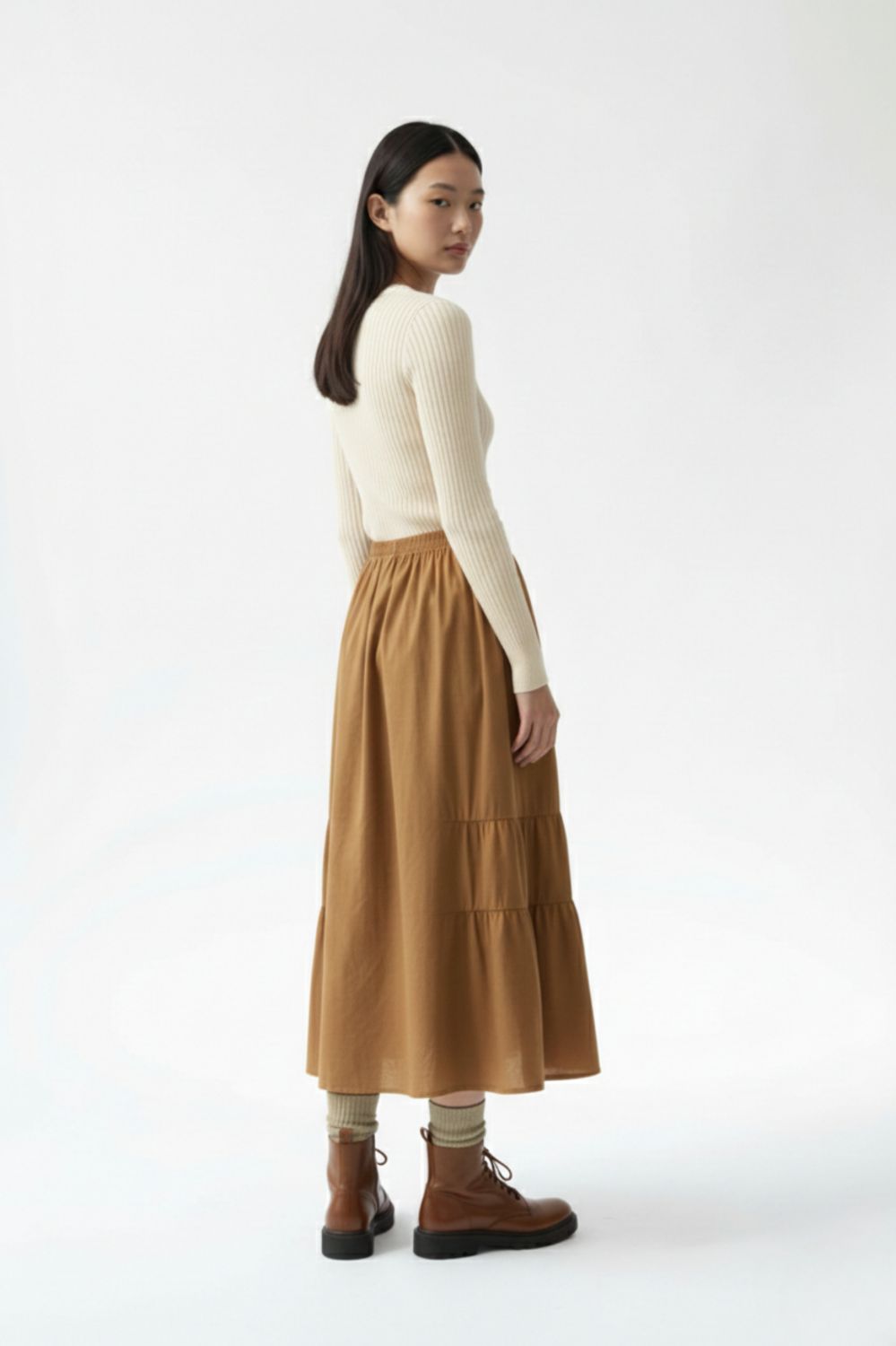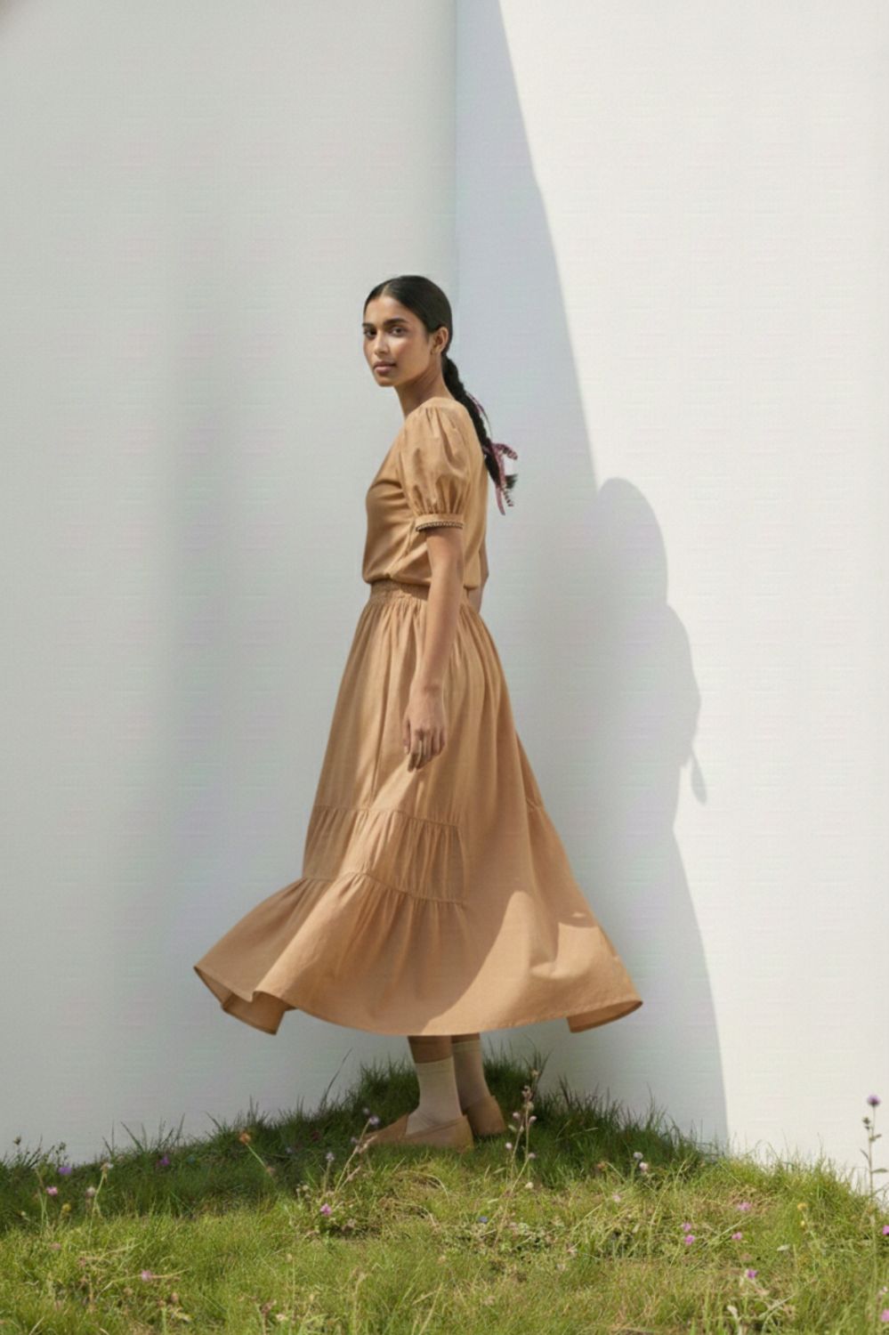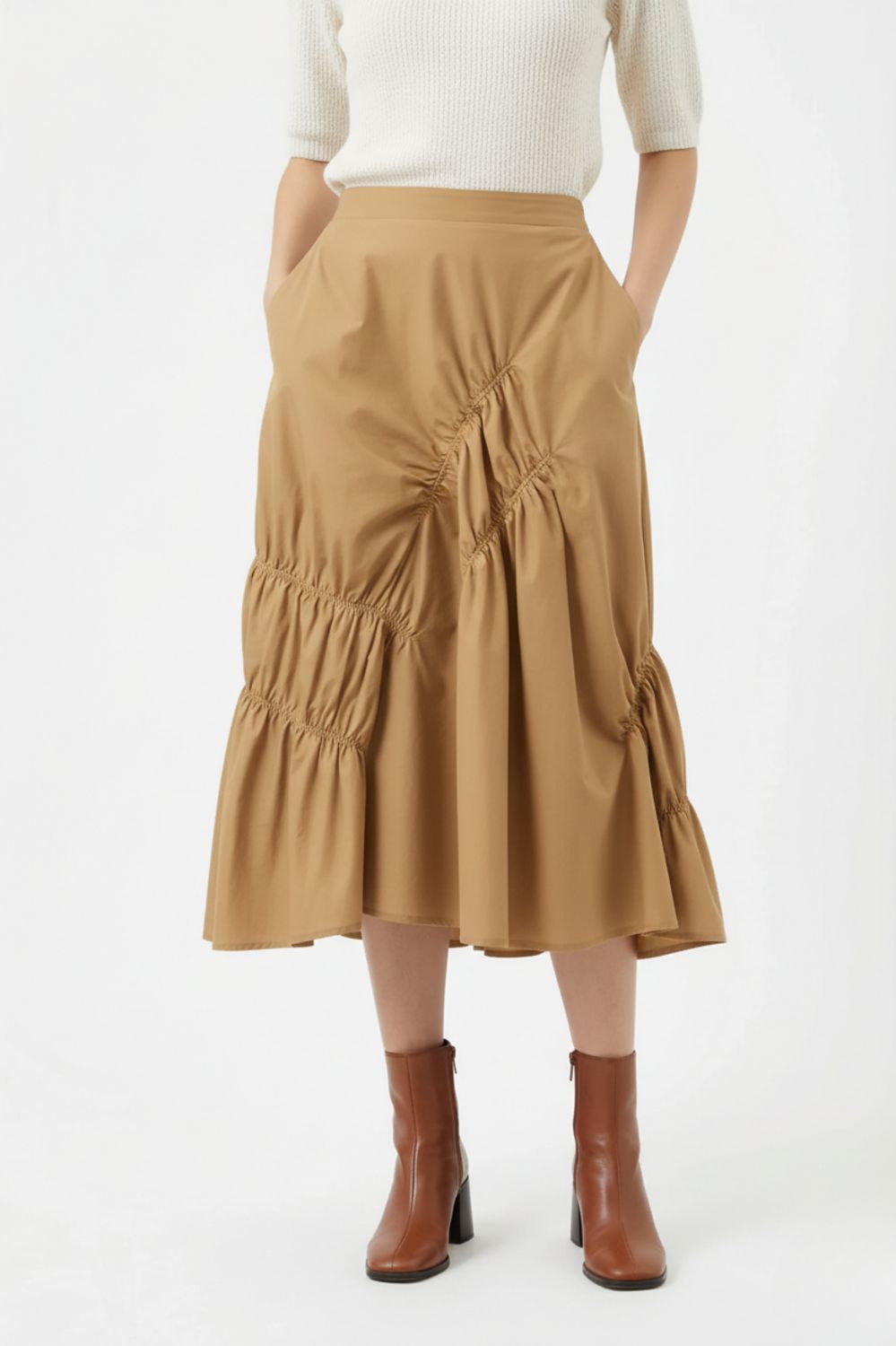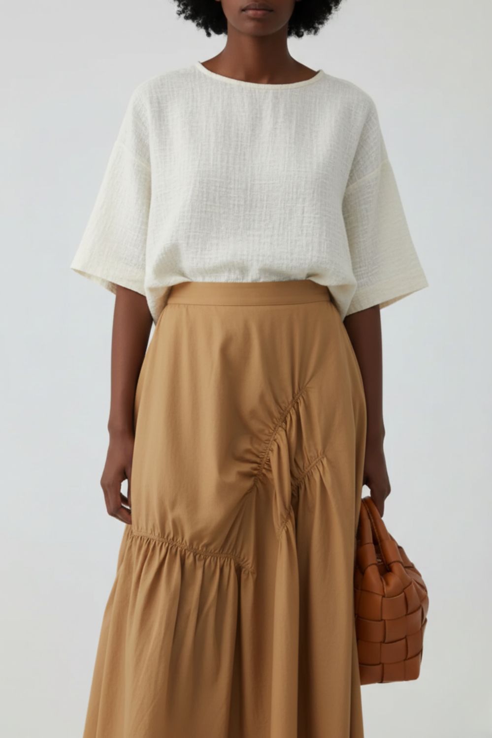 Paired with a deconstructed gathered skirt, the set offers fluid movement with everyday comfort. The skirt is designed with soft gathers, an elasticated back waistband for a flexible fit, and inseam side pockets for practicality.