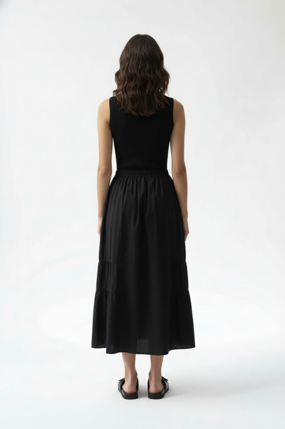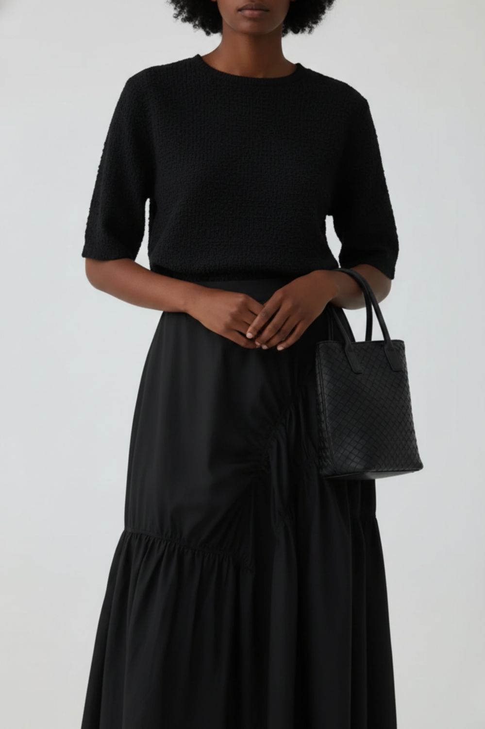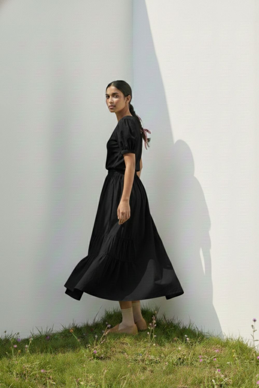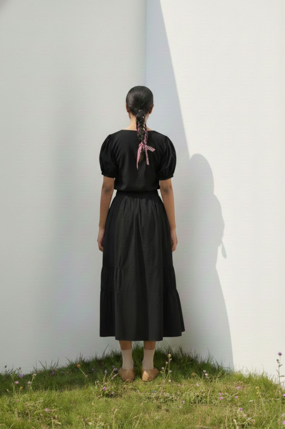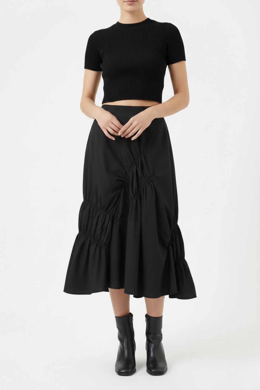 Paired with a deconstructed gathered skirt, the set offers fluid movement with everyday comfort. The skirt is designed with soft gathers, an elasticated back waistband for a flexible fit, and inseam side pockets for practicality.