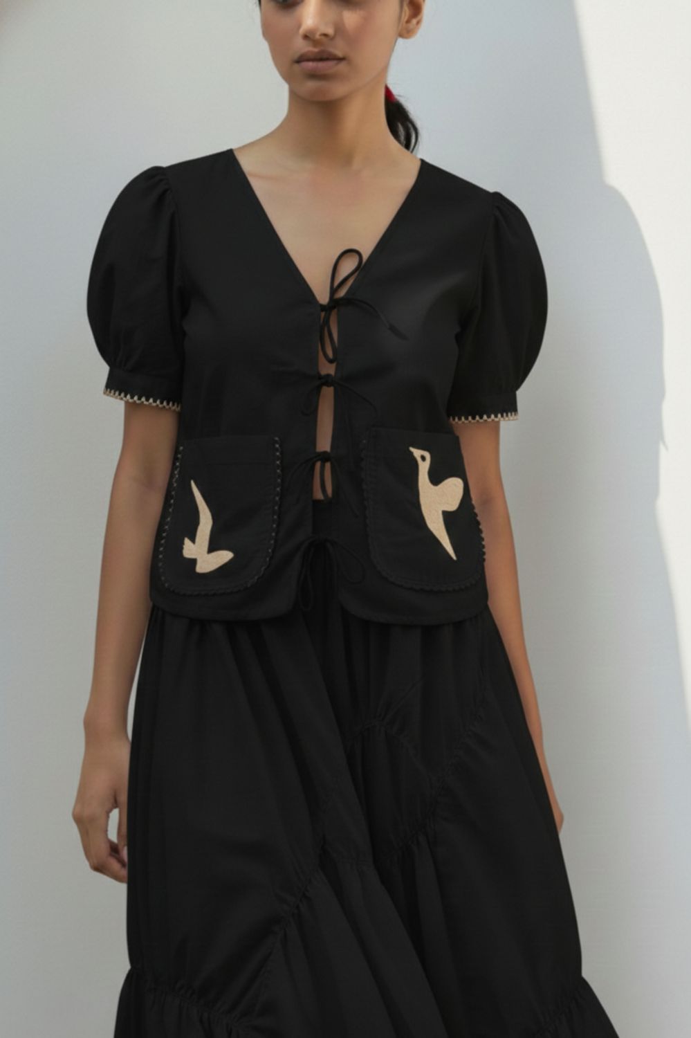 The top features patch pockets, subtle frill detailing, and a front tie-up closure finished with delicate patch embroidery. Designed for ease, it balances feminine elements with utilitarian functionality.