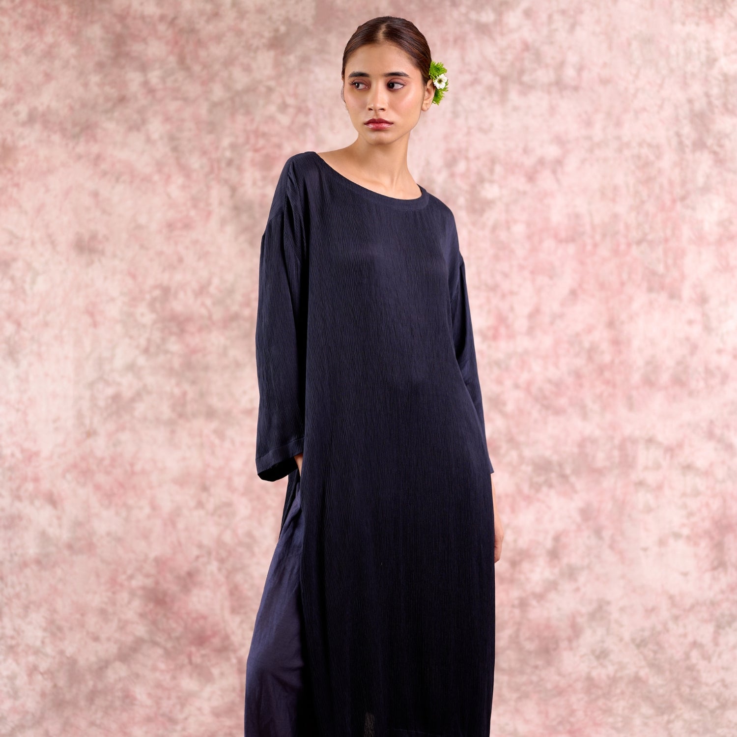A sophisticated navy co-ord set featuring relaxed-fit pleated pants with an adjustable drawstring waist, paired with a flowing A-line tunic in luxurious Bemberg Muga silk with long sleeves and side slits. Lightweight and effortlessly elegant, this set is perfect for festive occasions or celebratory evenings.