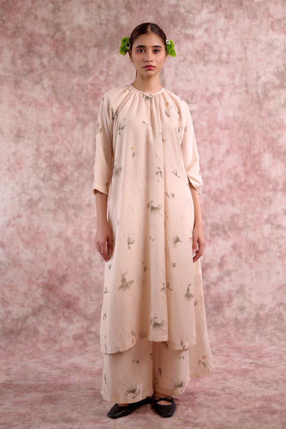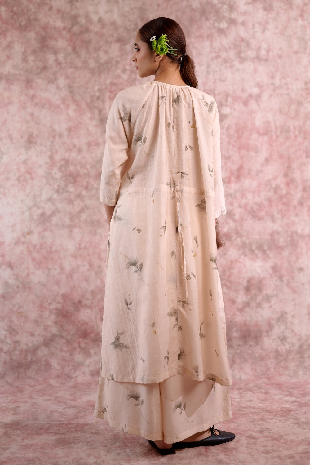 An effortlessly chic co-ord set crafted in sustainable Bemberg linen georgette (recycled fabric). The set features an oversized gathered tunic with side slits and adjustable drawstring detail at the back for a custom fit, paired with elasticated bottoms designed with a gathered waist and broad fall for all-day comfort. Versatile and breathable, this set can be styled together for a coordinated look or worn as separates for endless styling options.