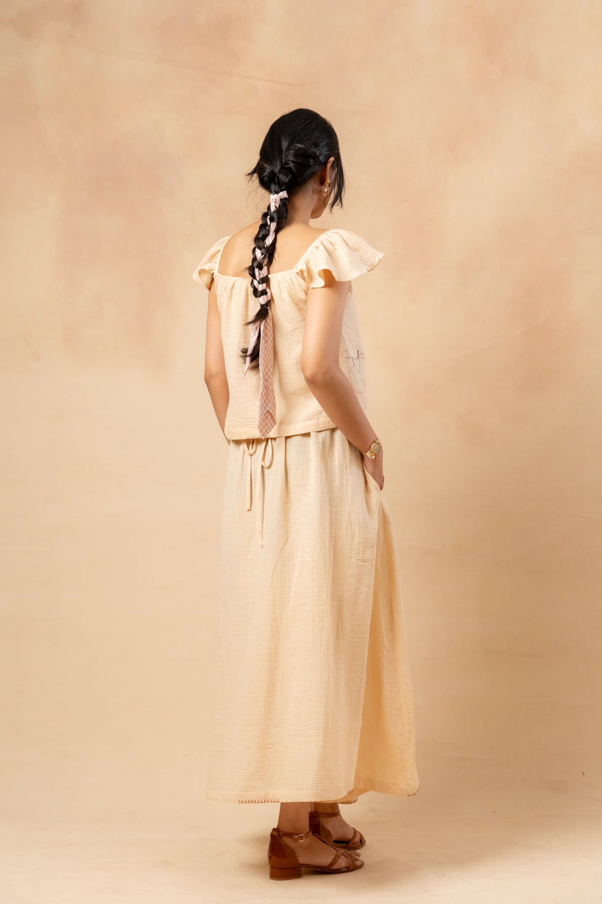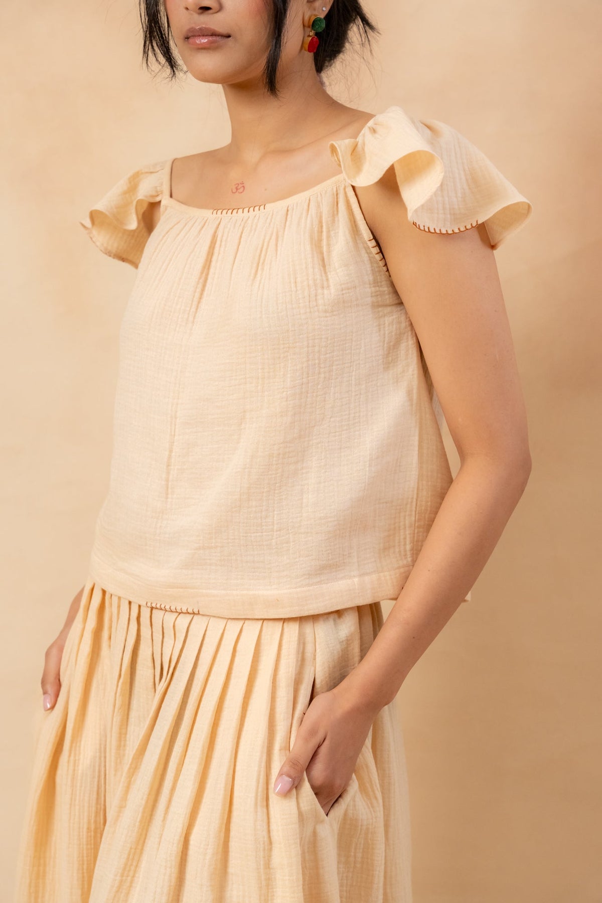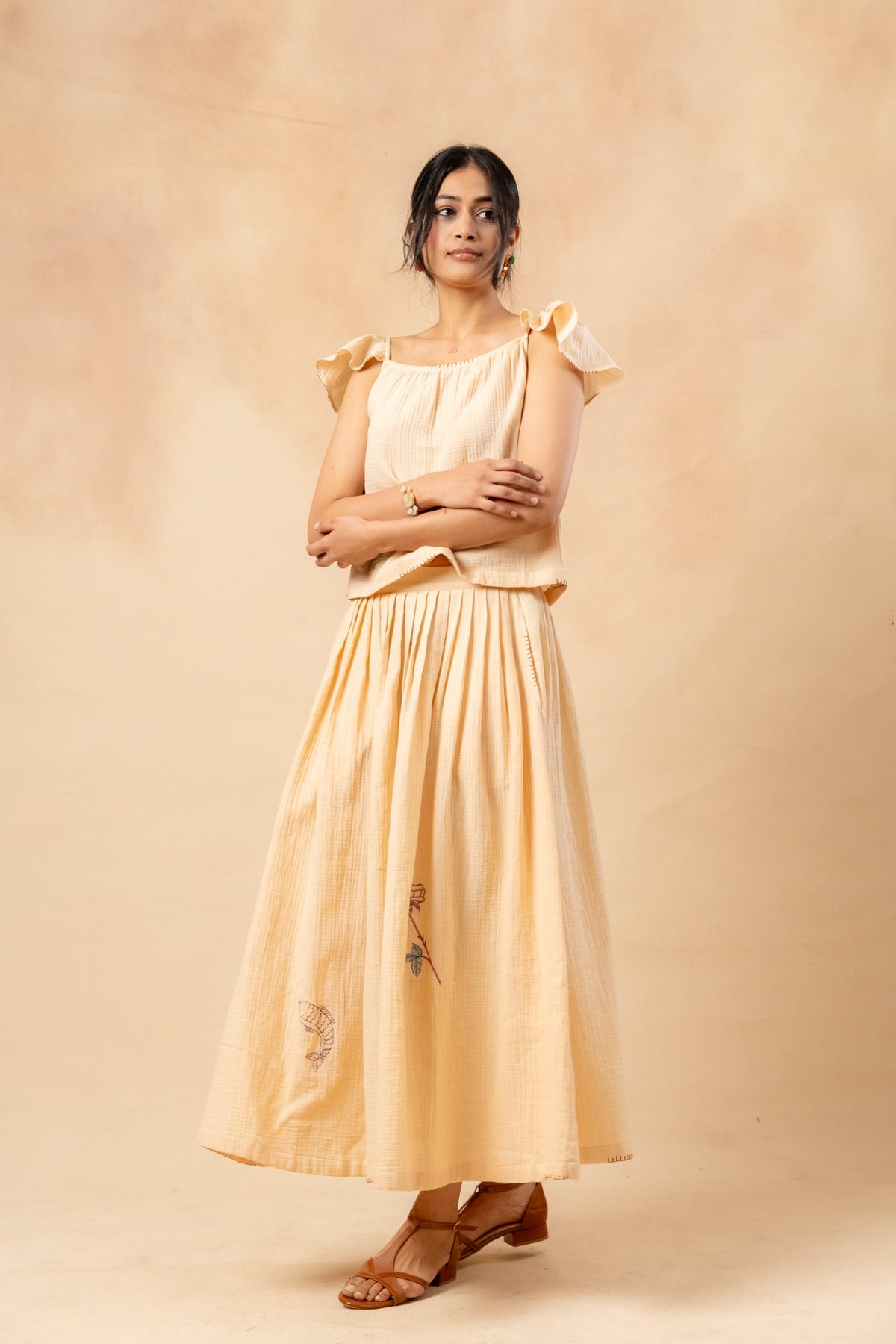 Description: This set includes a short mega sleeve summer crop top that can be styled off the shoulder, featuring randomly placed doodle embroidery. It is made from organic cotton and hand-dyed using azo-free colours. The front-pleated skirt has an adjustable back with drawstrings, side pockets, and additional hand detailing, all adorned with the same playful doodle embroidery.