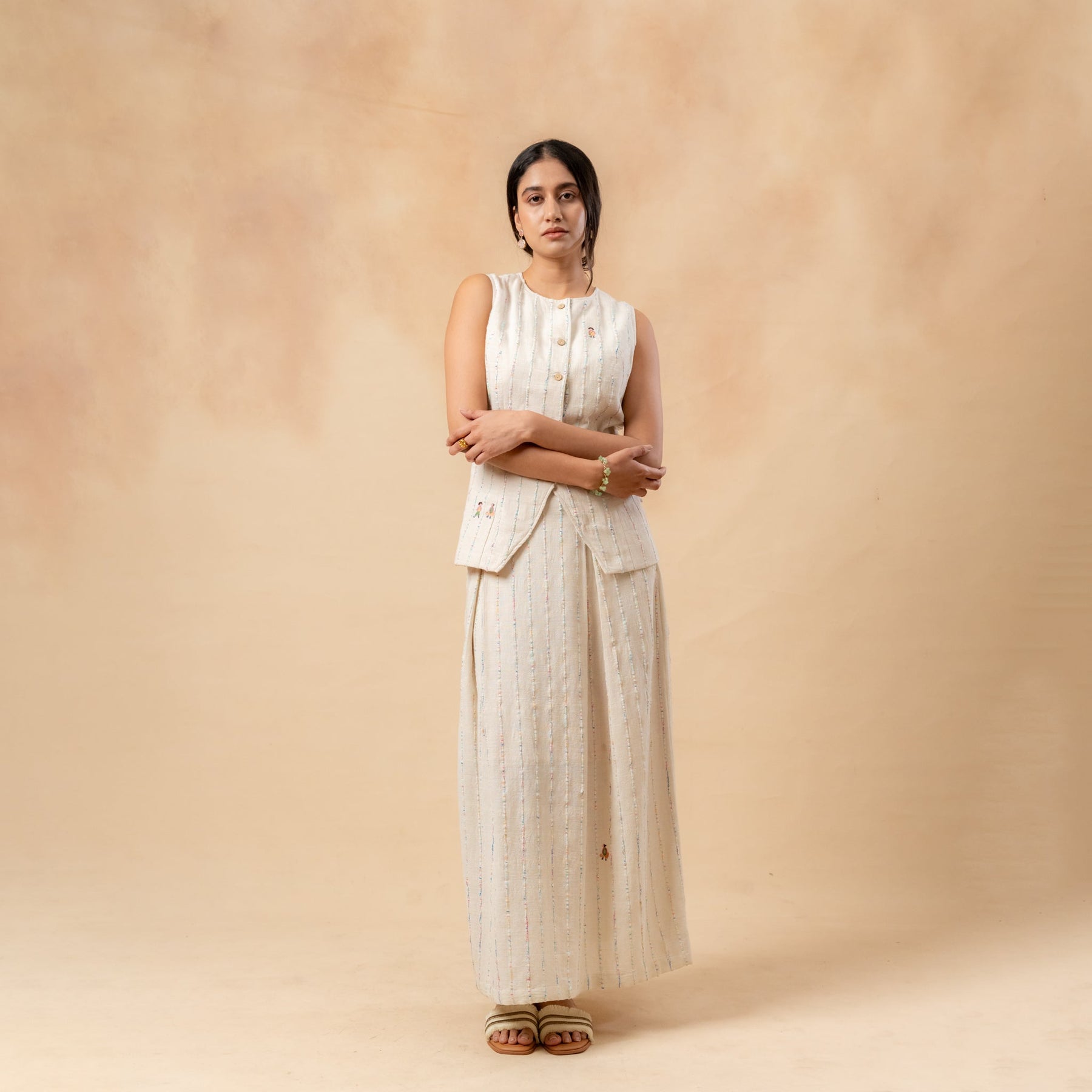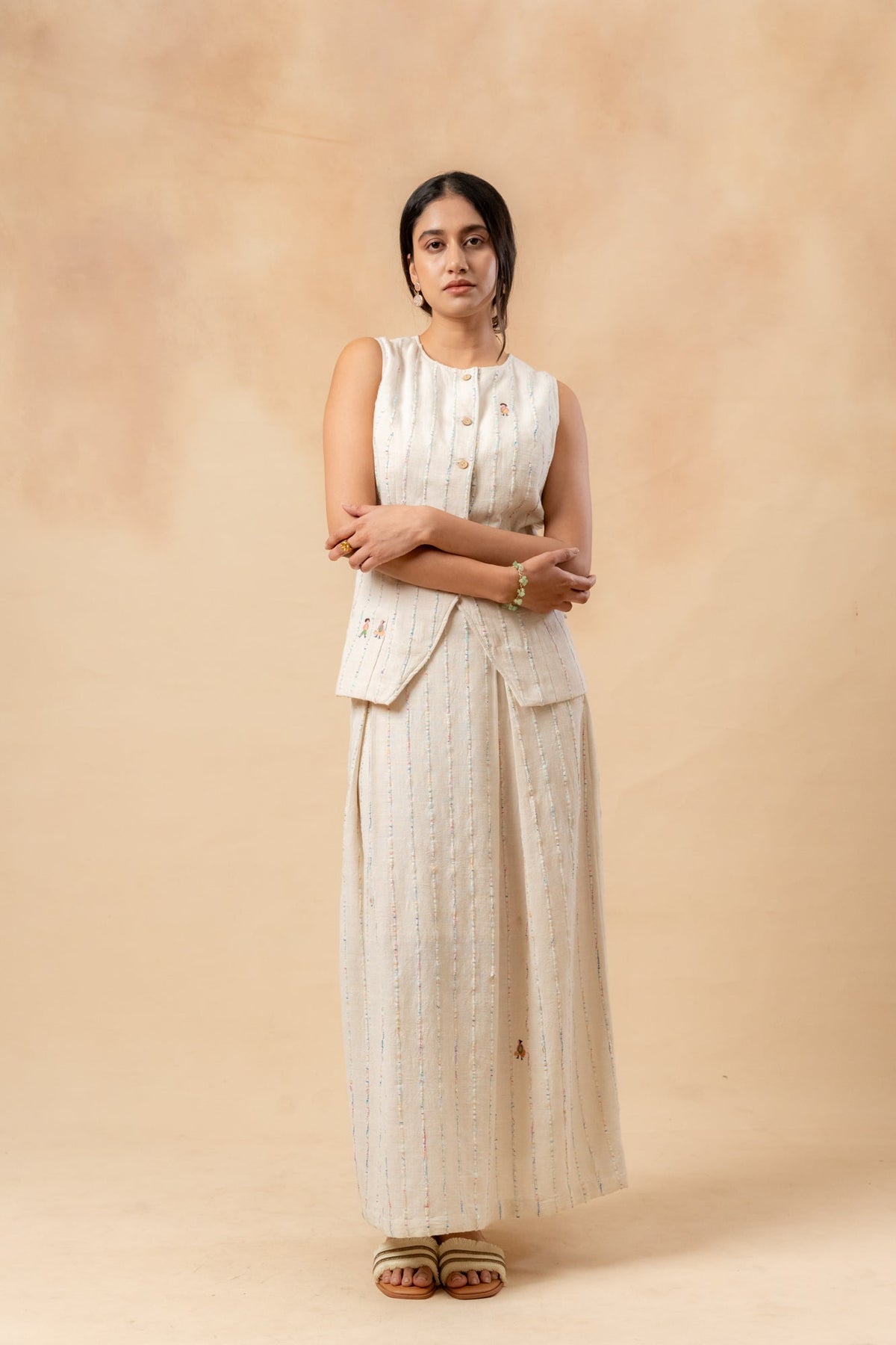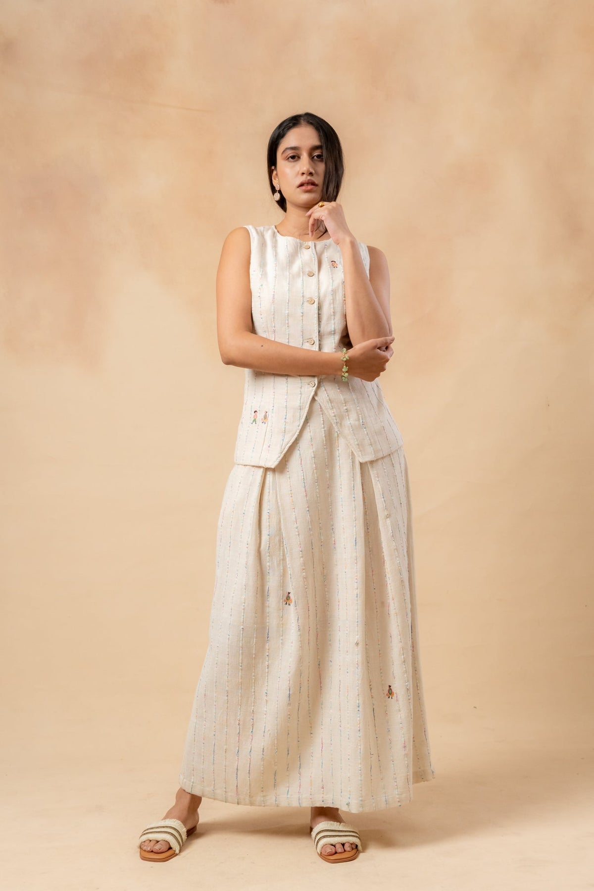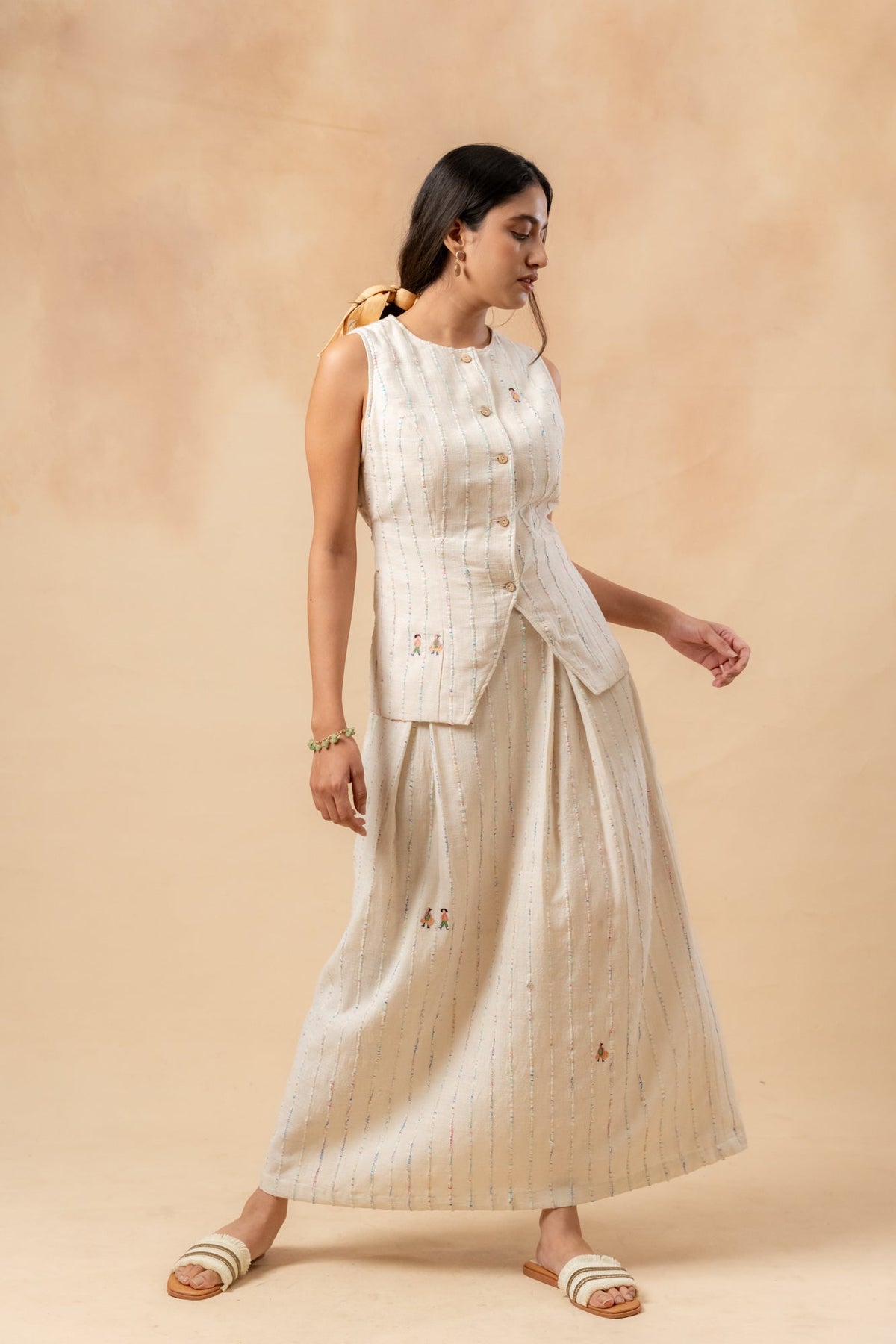 Description: This set includes a textured, fitted waistcoat made from handwoven upcycled fabric, crafted from waste materials. It features an adjustable belt at the back. The outfit is complemented by a beige organic cotton skirt, which has inverted box pleats both at the front and back, a concealed zipper, and randomly placed doodle embroidery.