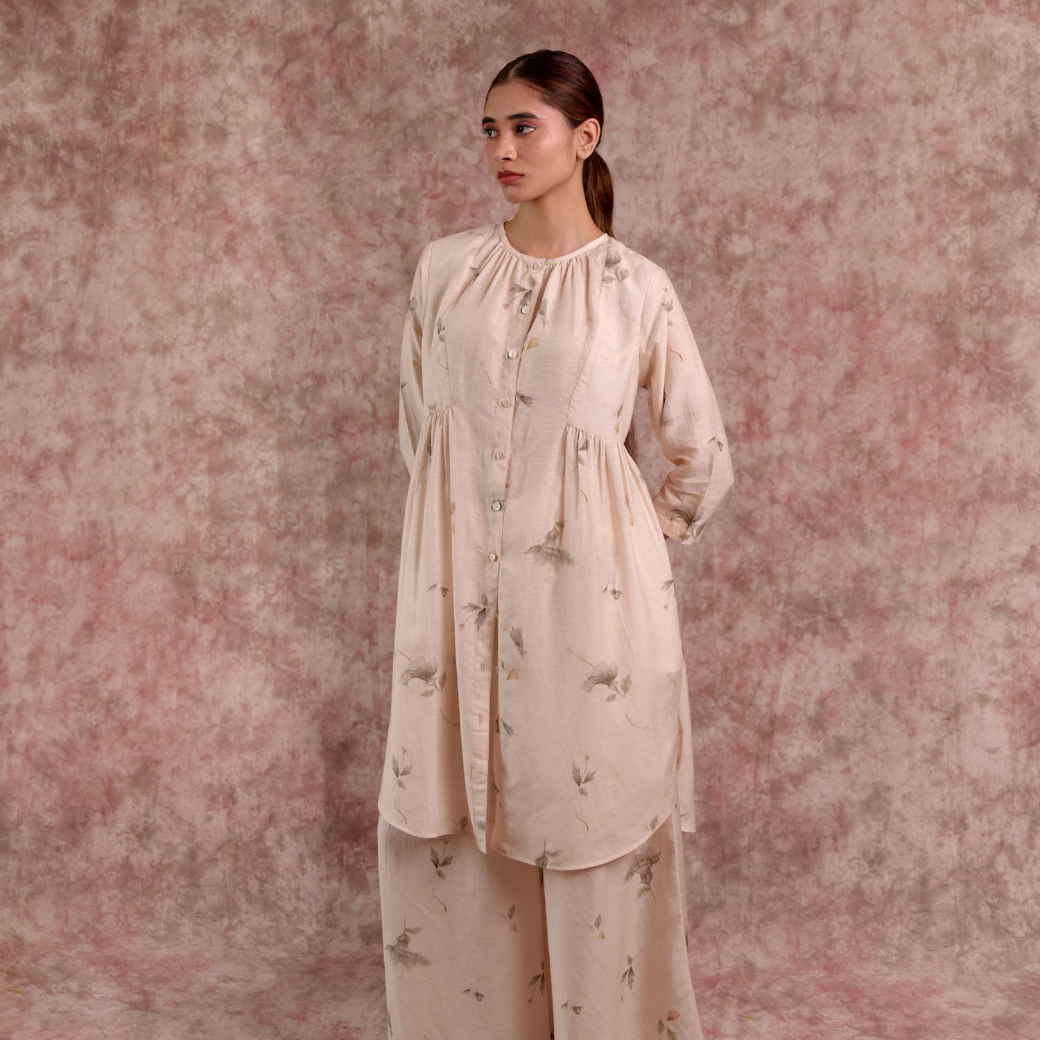 A versatile two-piece set designed for both comfort and elegance. The set includes a button-down tunic with side and back gathers, fitted at the chest with a flared hemline, and elasticated bottoms with a gathered waist and broad fall. The tunic comes with inseam pockets and can be styled as a dress or layered as a tunic, making this co-ord set adaptable for multiple occasions.