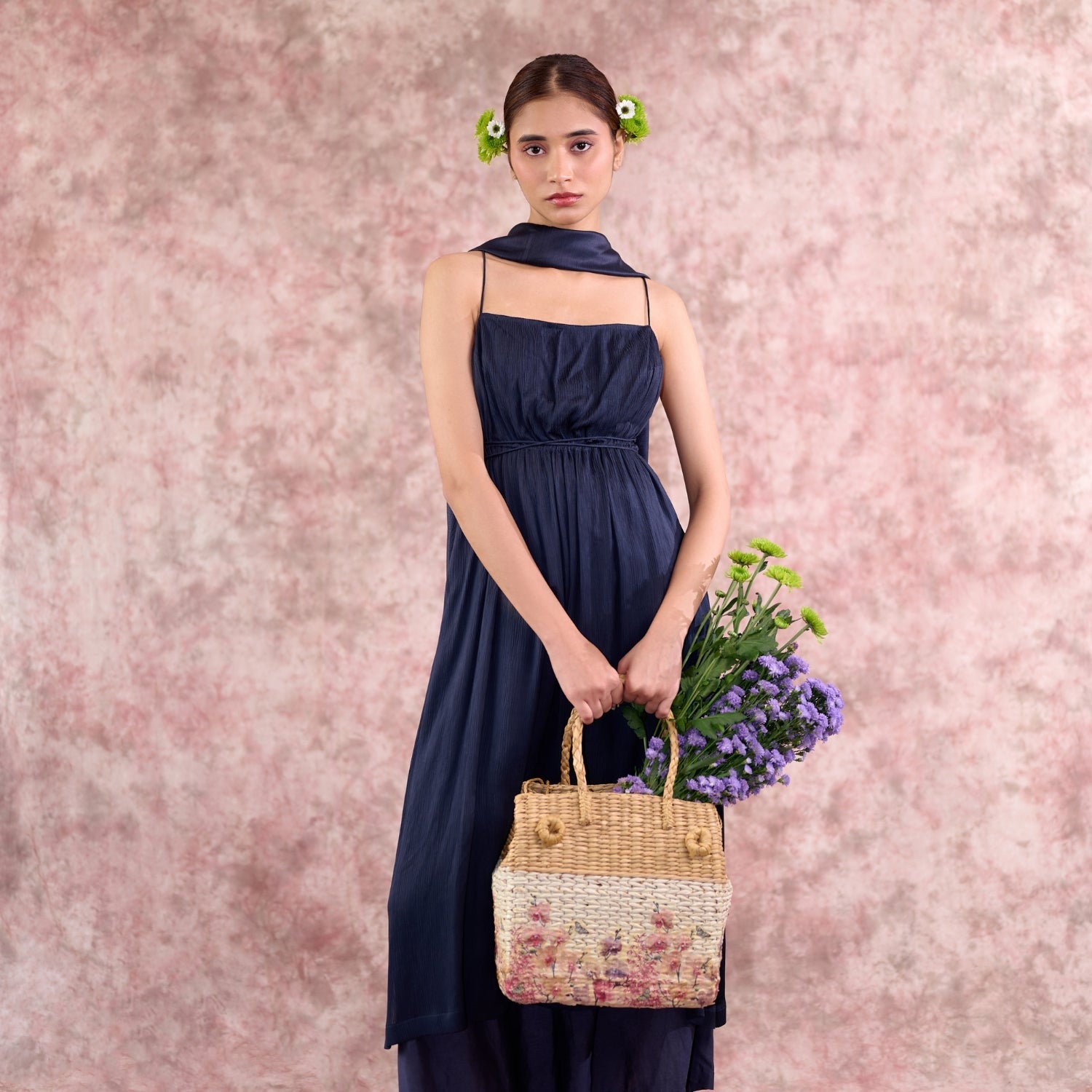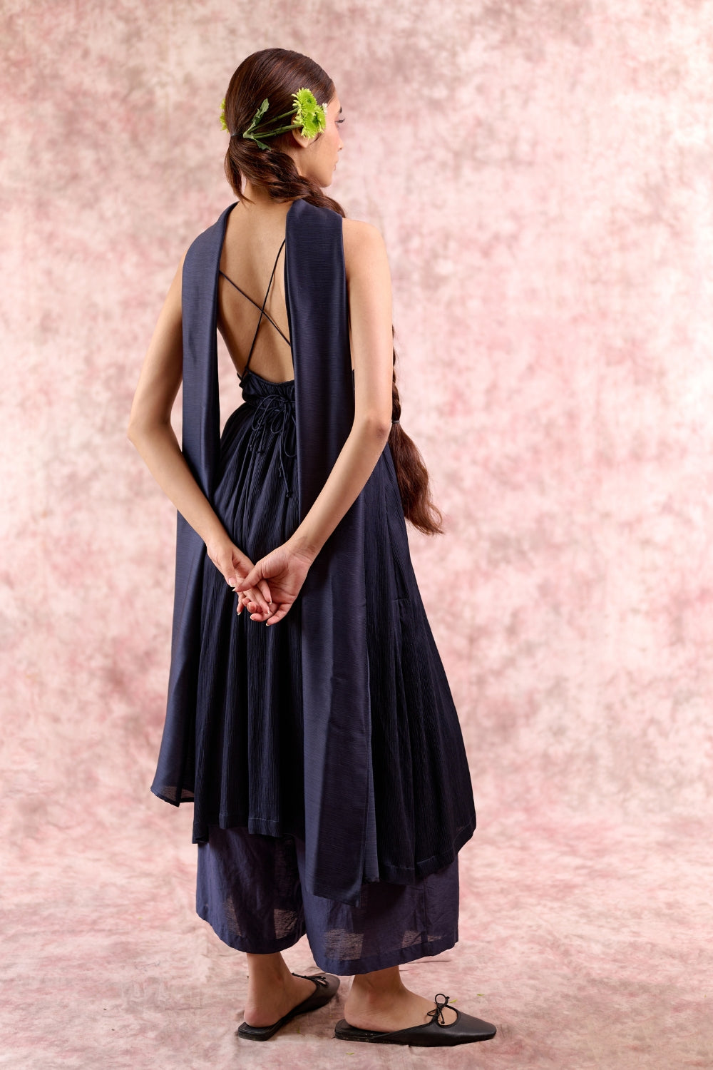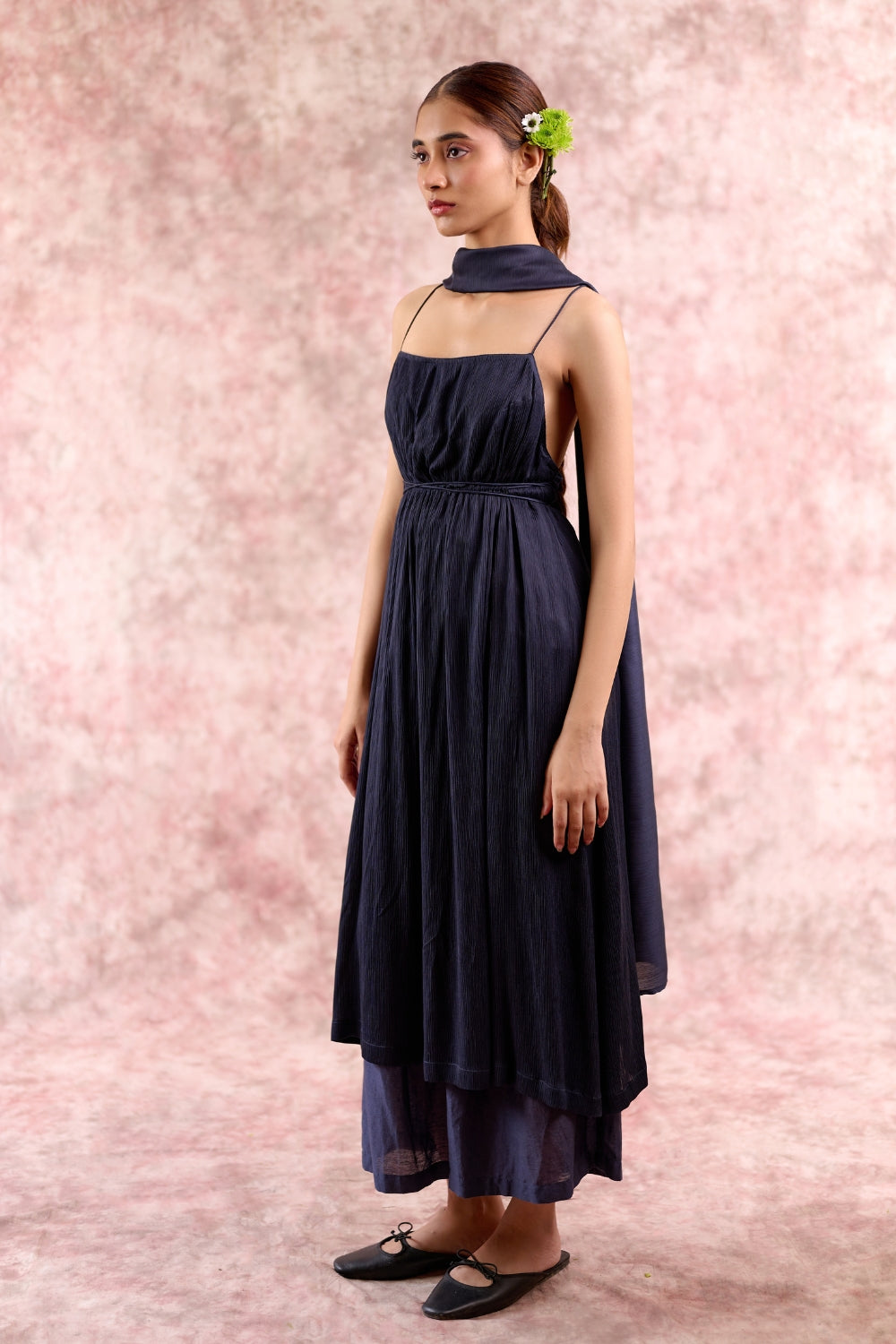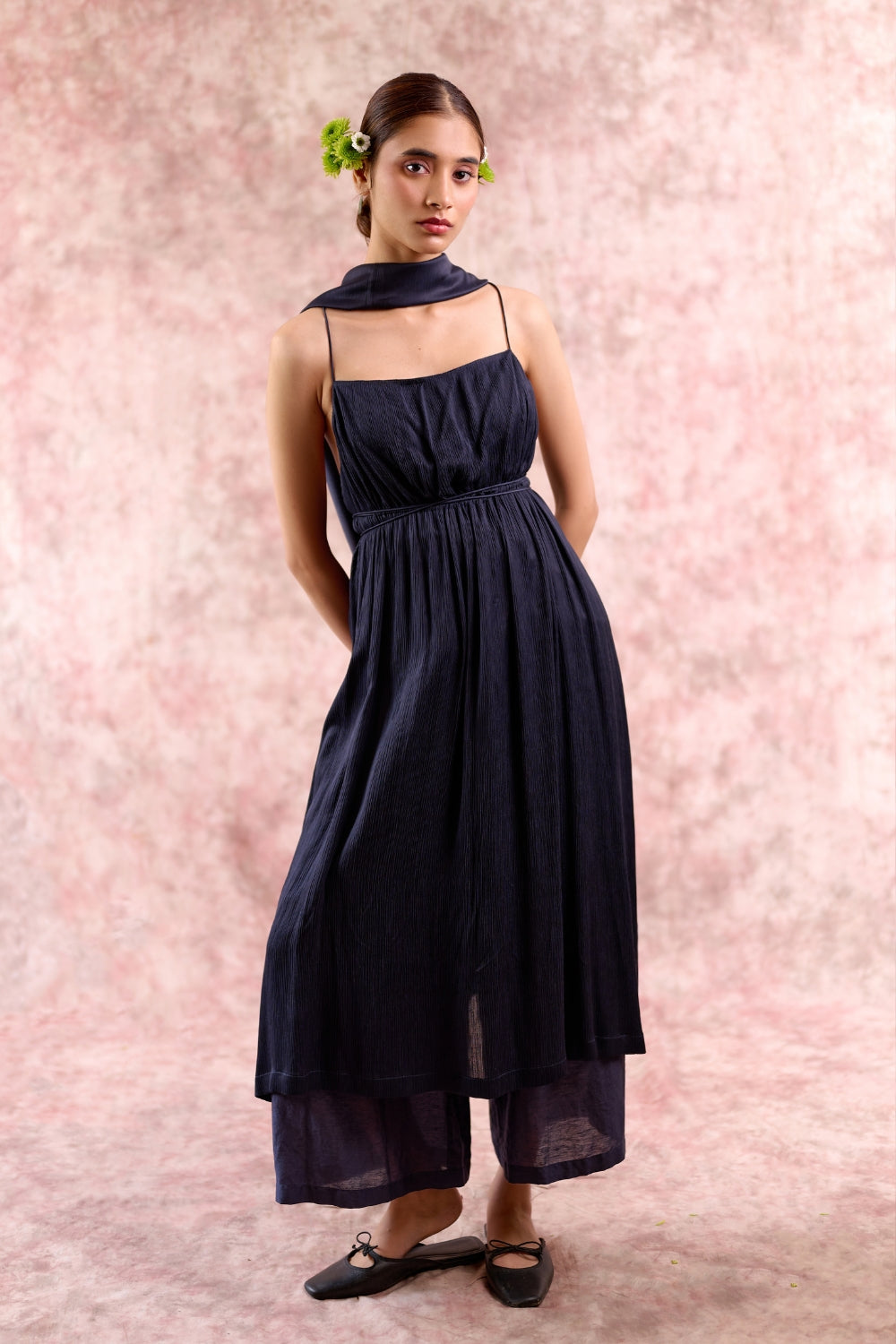 A statement navy co-ord set in Bemberg fabrics, featuring relaxed-fit pleated pants with an adjustable drawstring waist and a flowy Muga silk tunic with delicate shoulder straps and a side slit. Lightweight and effortlessly elegant, this set drapes beautifully, making it perfect for festive occasions or celebratory evenings.