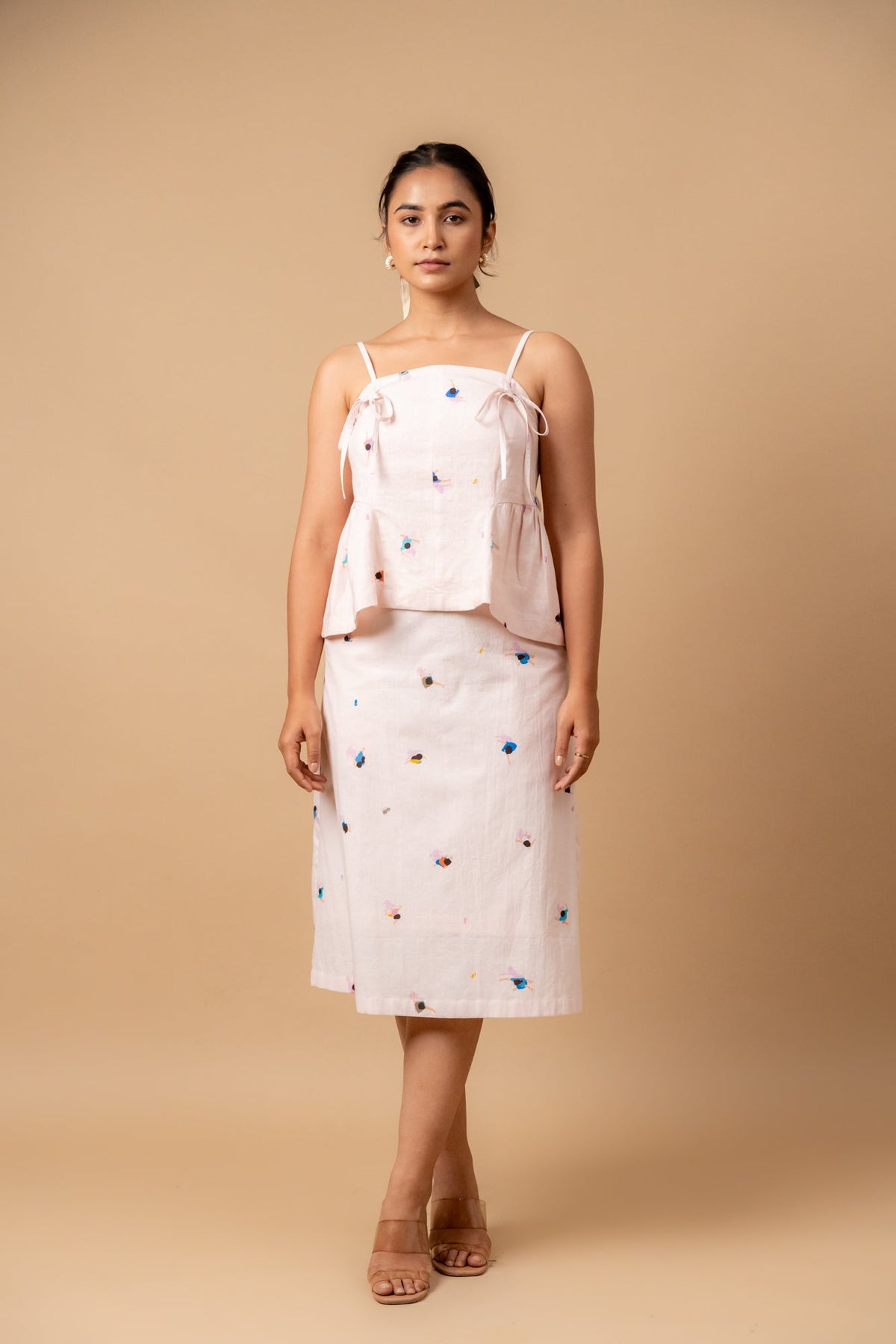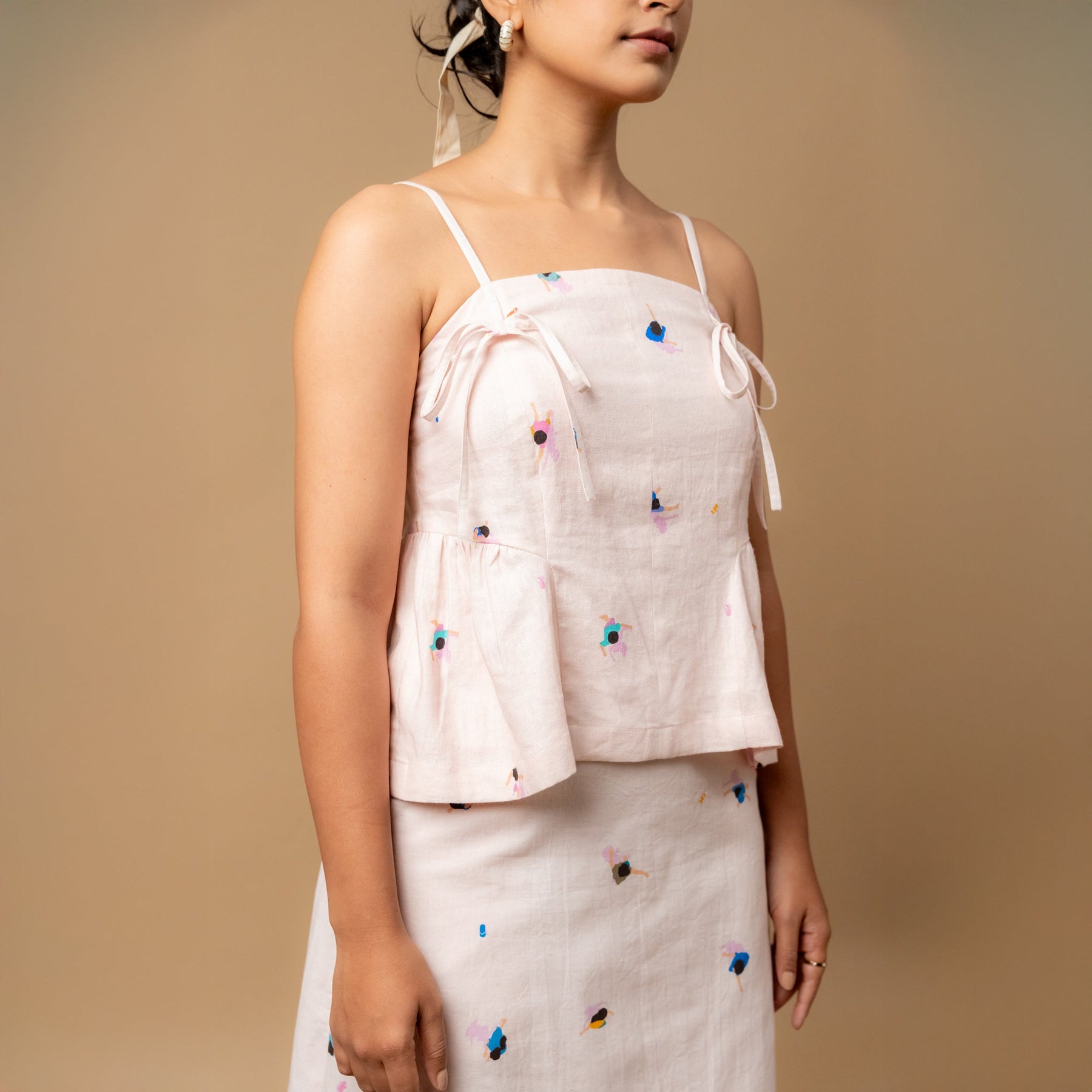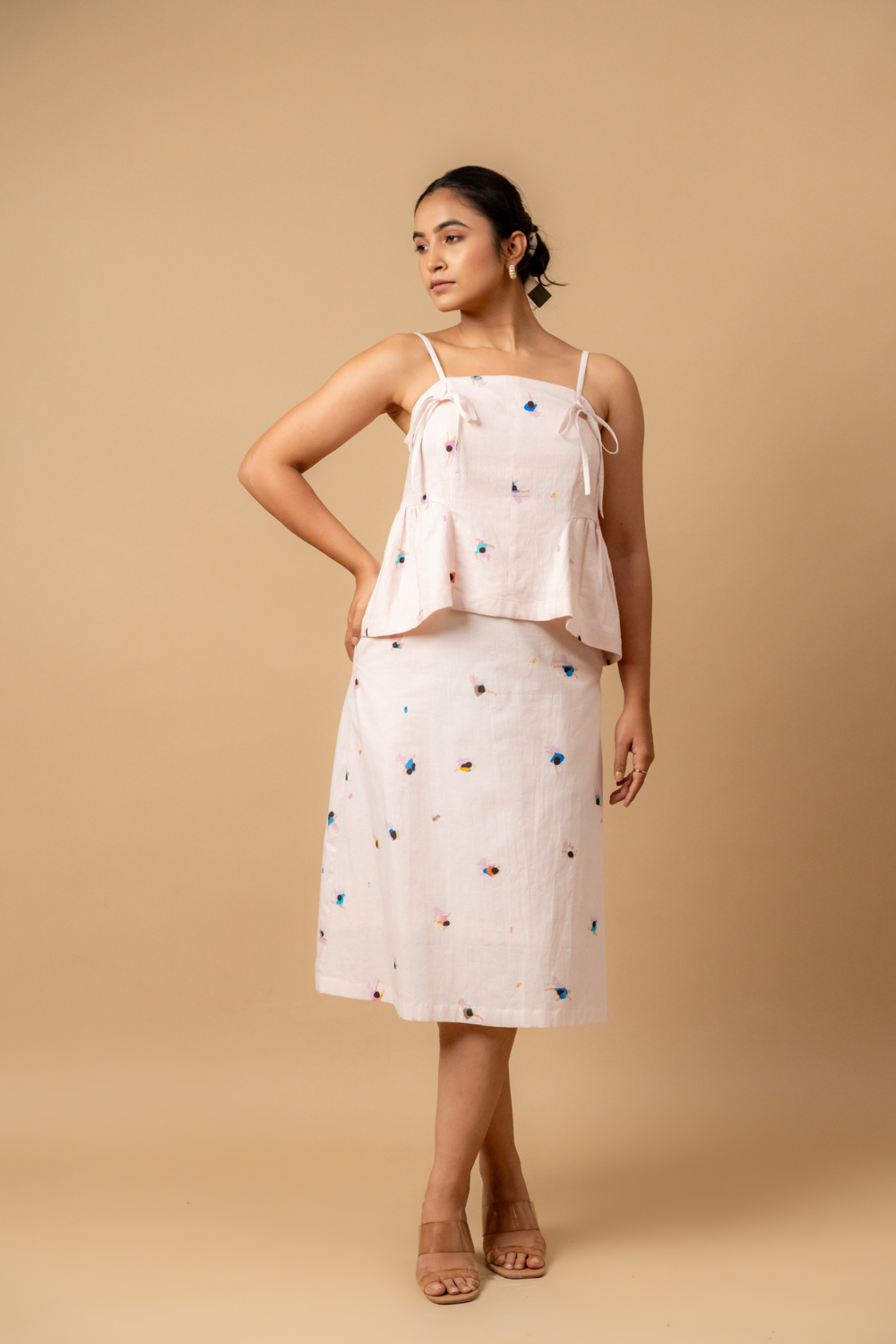 Description: Fitted bow top with adjustable straps and side peplum and A-line printed linen skirt with back and side pockets, elasticated back, button opening at the side.