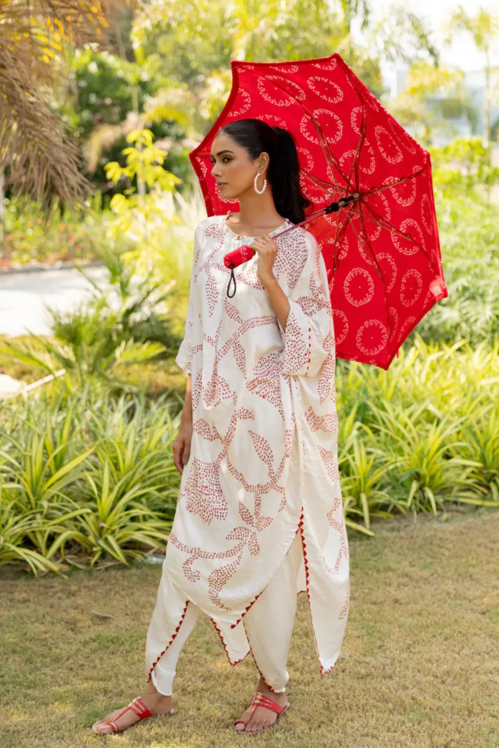 Asymmetrical Kurta with button details on the neck. Paired with overlap dhoti pants